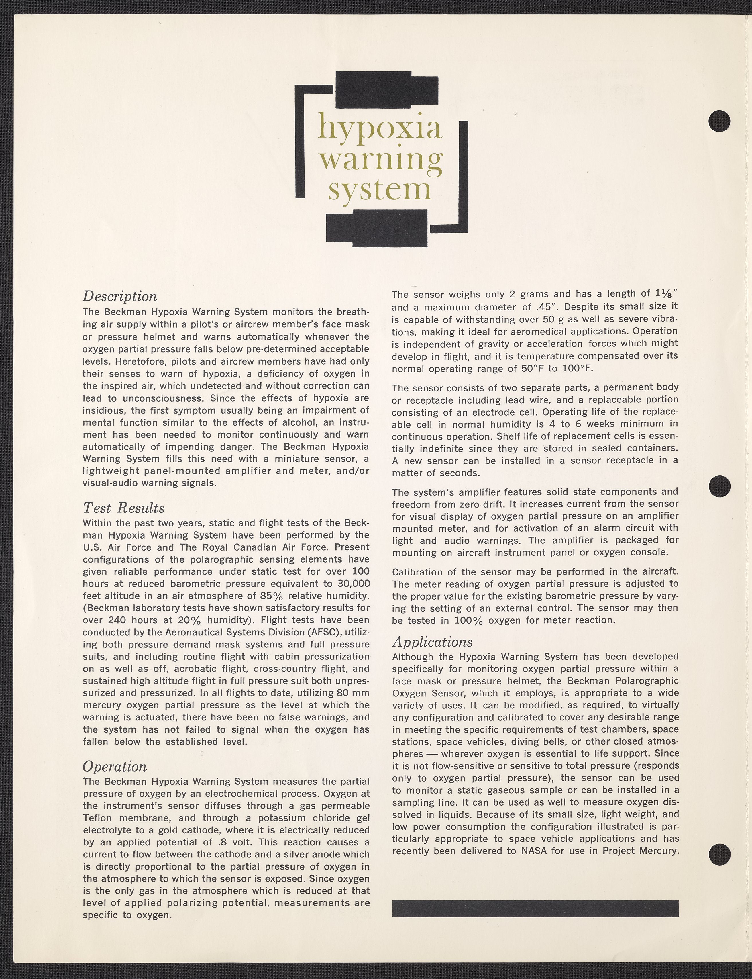 Beckman Instruments, Inc. “Hypoxia Warning System for Monitoring Partial Pressure of Oxygen in Artificial Atmospheric Environments,” circa 1963. Beckman Historical Collection, Box 16, Folder 12. Science History Institute. Philadelphia. https://digital.sciencehistory.org/works/kd17ct42v.