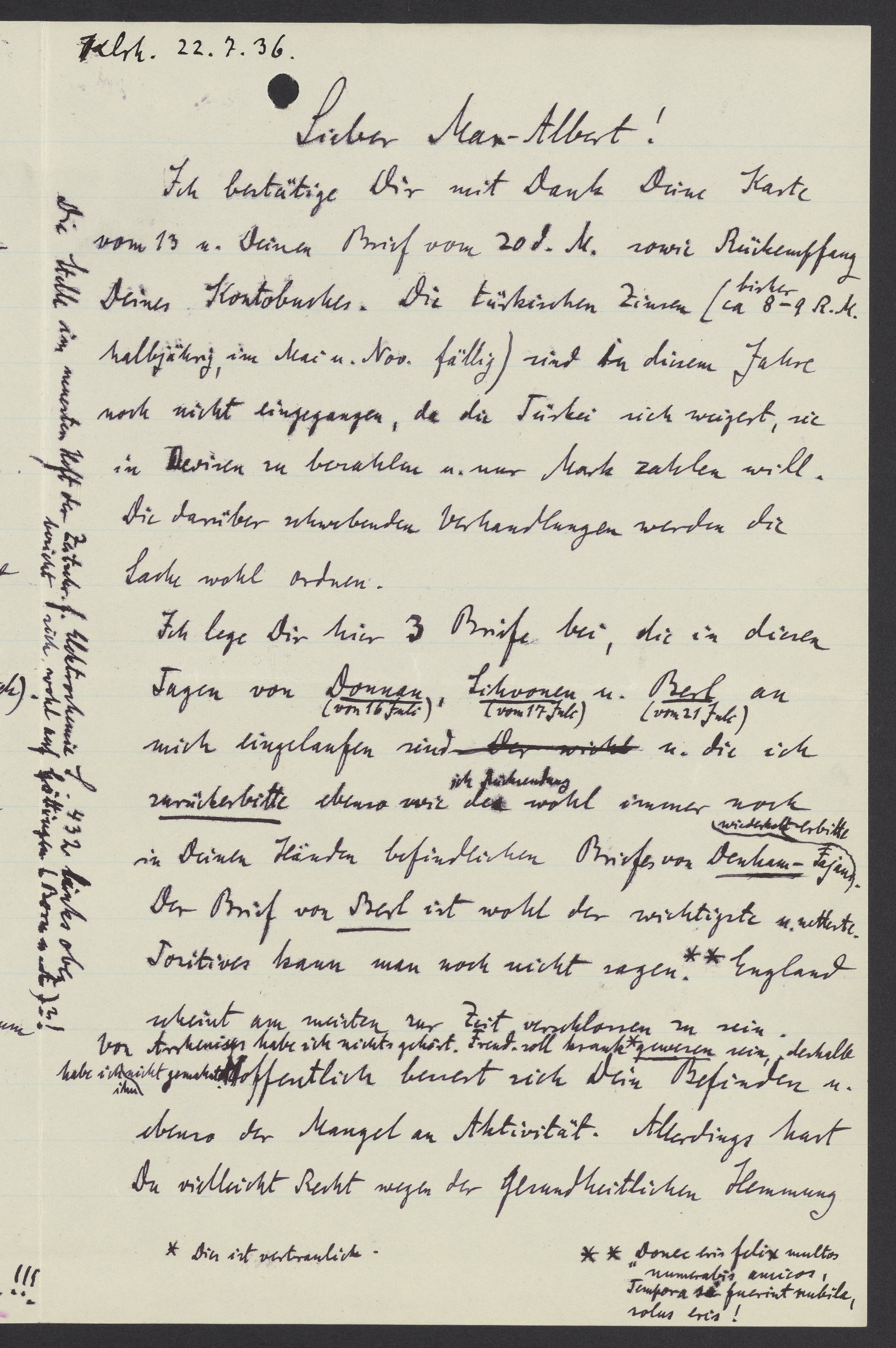 Ich bestätige Dir mit Dank Deine Karte von 13. u. Deinen Brief vom 20 d.M. sowie Rückempfang Deines Kontobuches. Die türkischen Zinsen (bisher ca 8-9 R.M. halbjährig, im Mai u. Nov. fällig) sind in diesem Jahre noch nicht eingegangen, da die Türkei sich weigert, sie in Devisen zu bezahlen u. nur Mark zahlen will. Die darüber schwebenden Verhandlungen werden die Sache wohl ordnen.