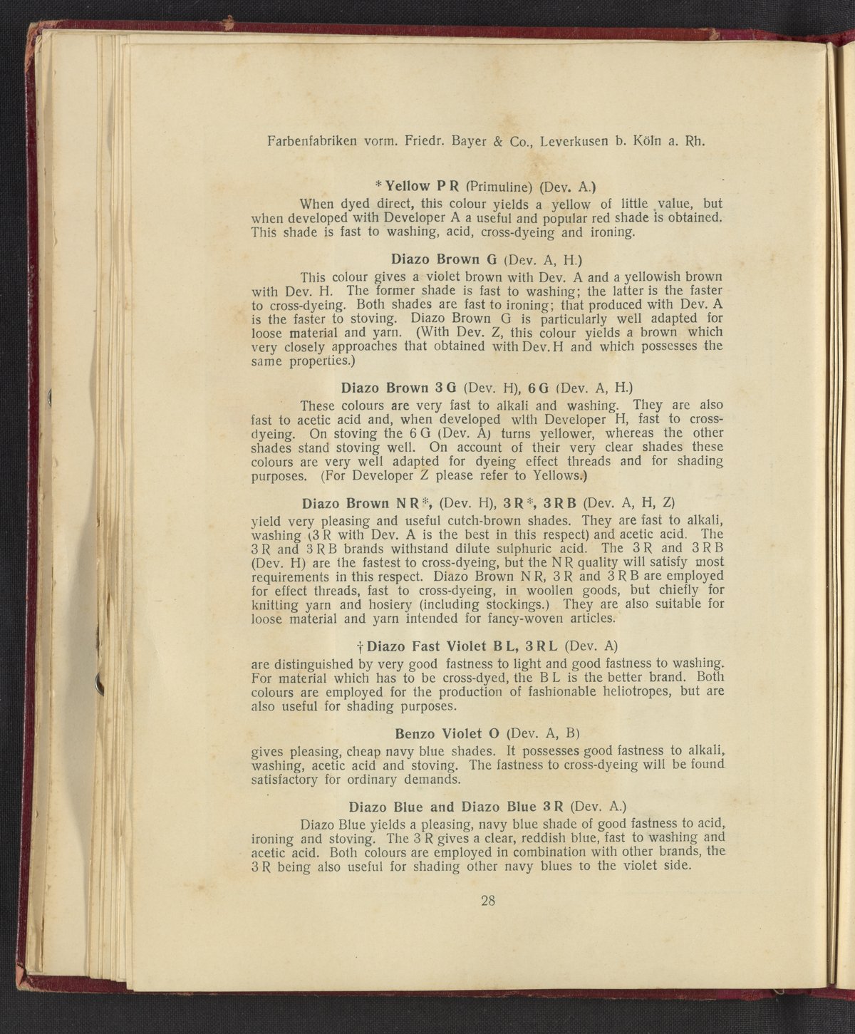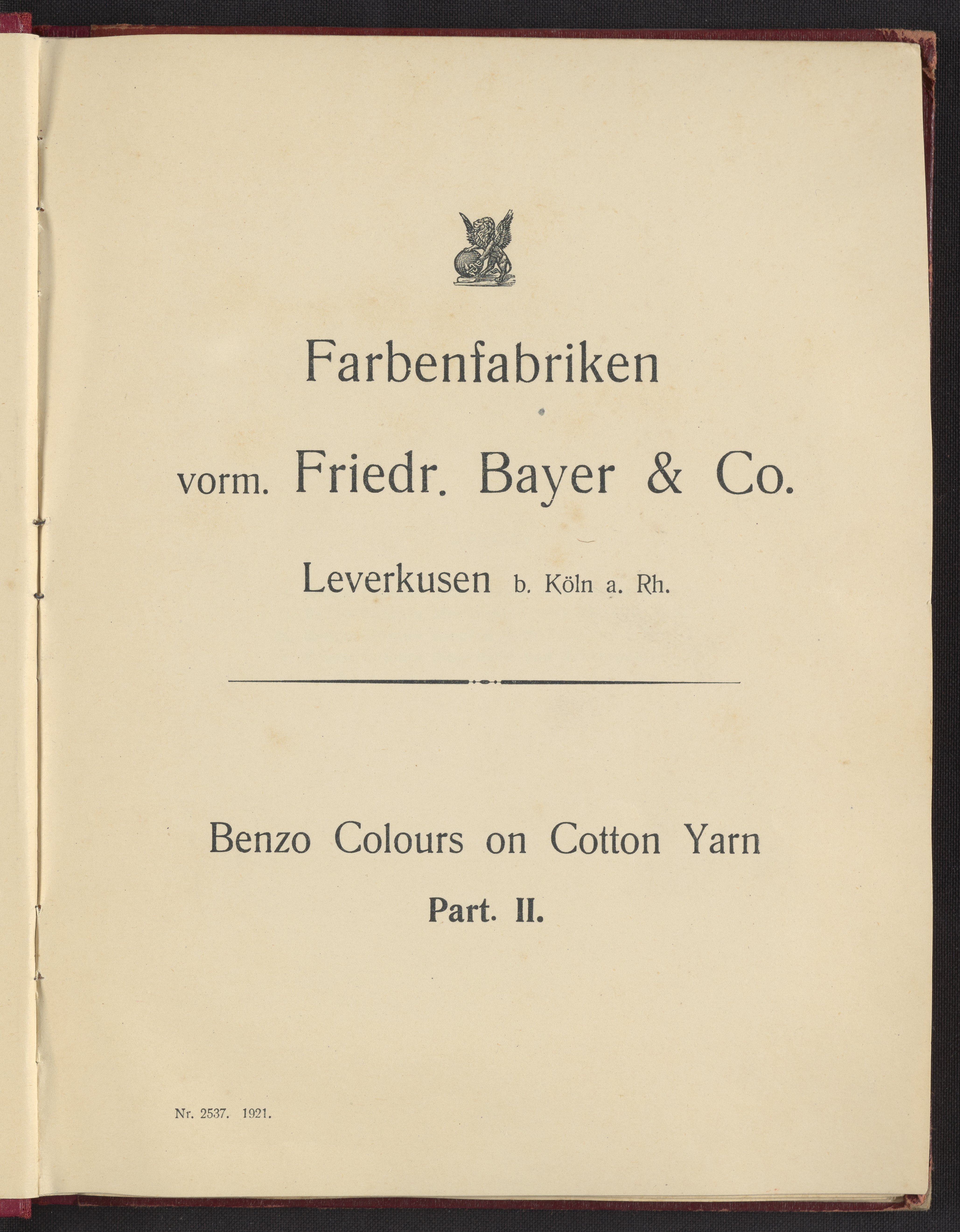 Farbenfabriken vorm. Friedrich Bayer & Co. Benzo Colours on Cotton Yarn, Part II. Leverkusen, Germany, 1921. https://digital.sciencehistory.org/works/kh04dp745.
