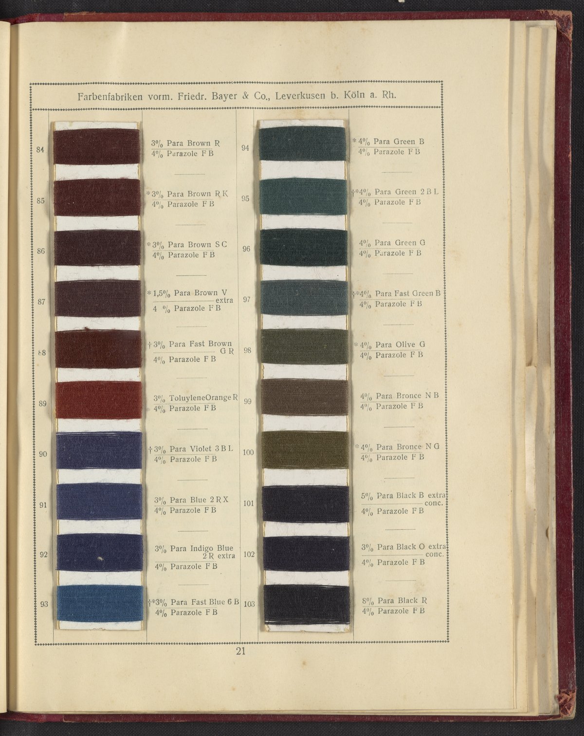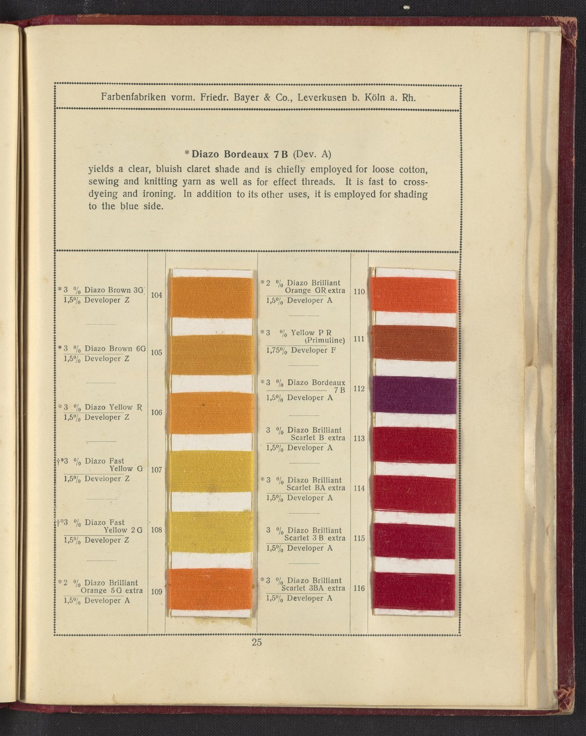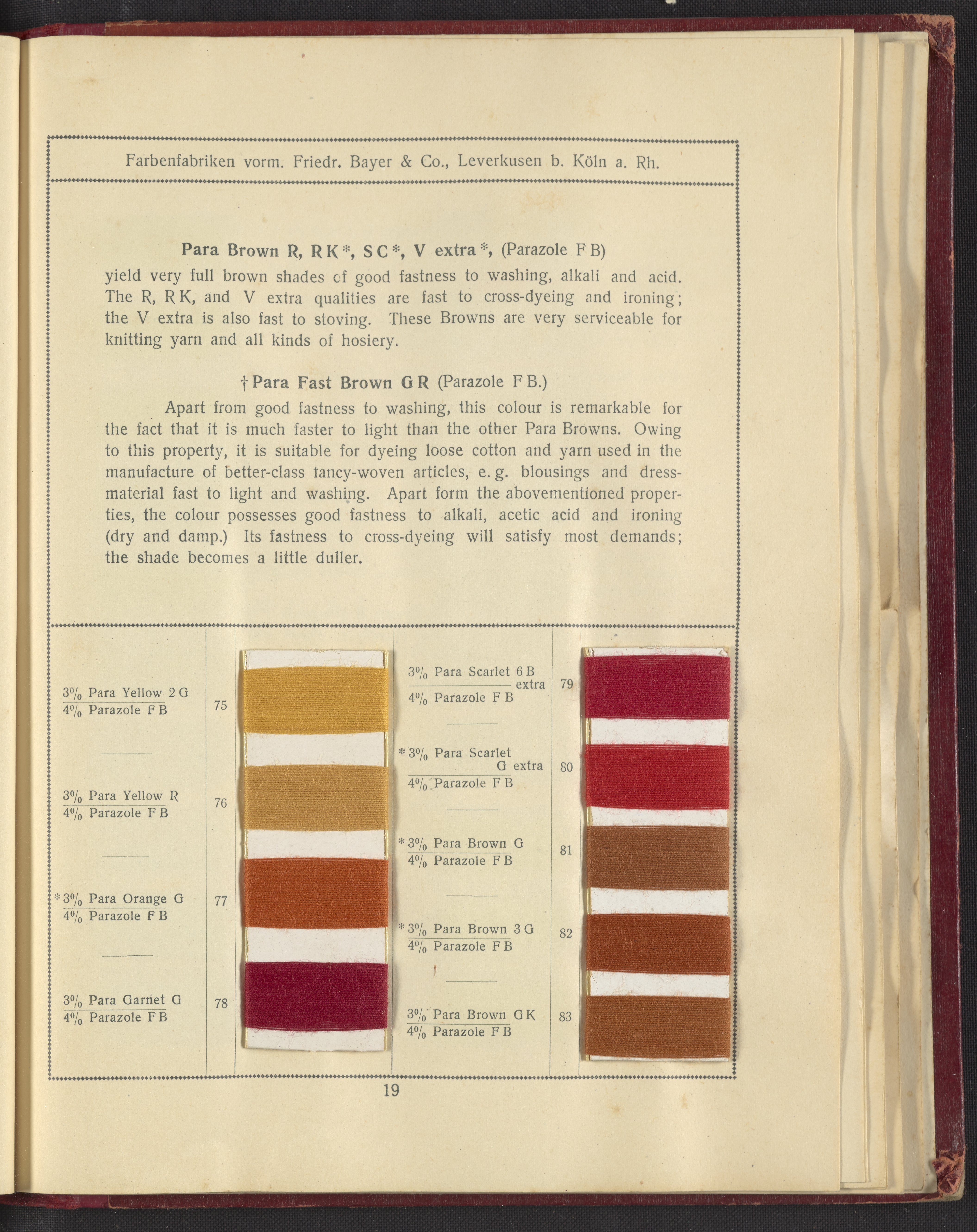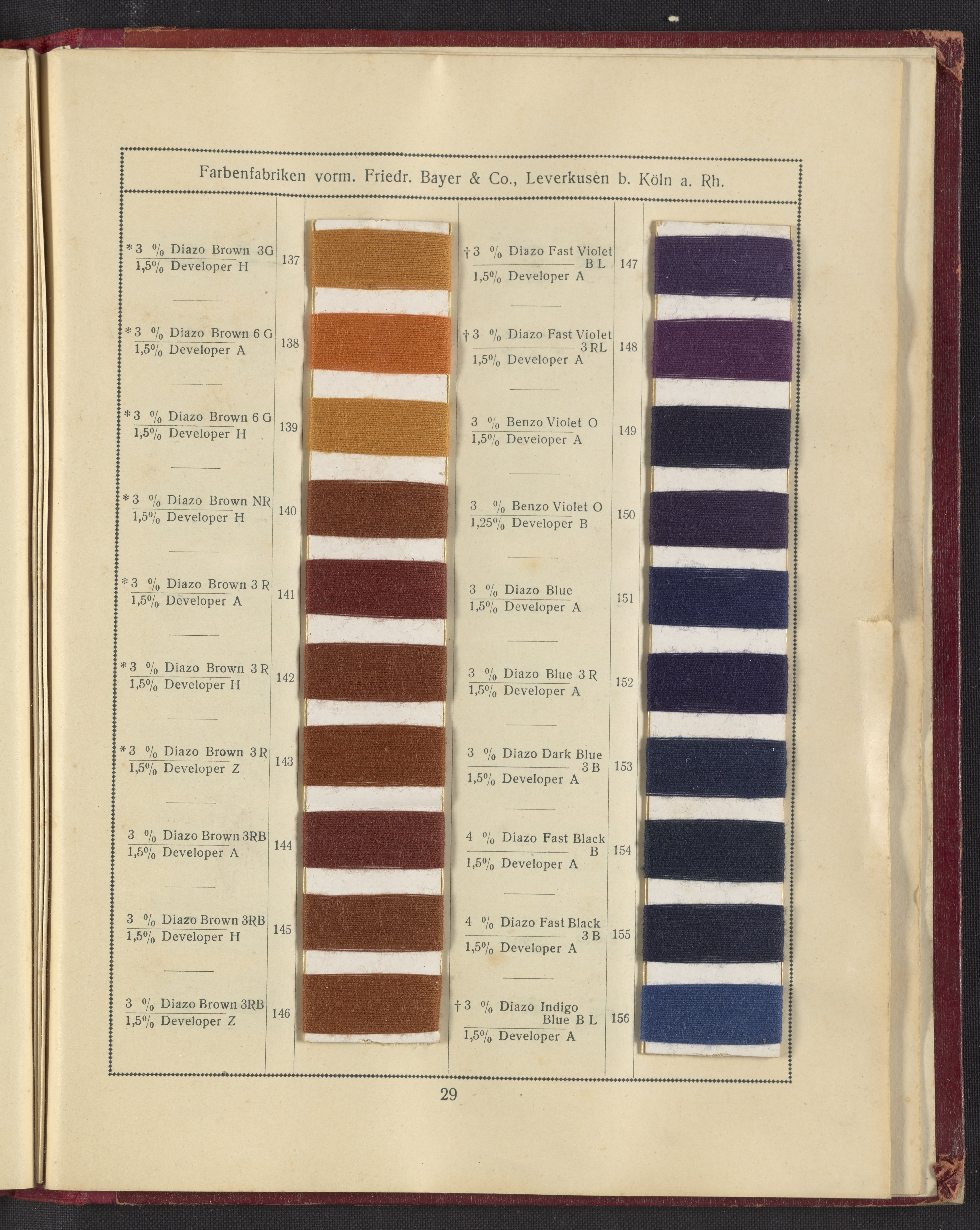 Small JPG1200 x 1459px — 446 KBLarge JPG2880 x 3502px — 2.5 MBFull-sized JPG4372 x 5316px — 5.0 MBOriginal fileTIFF — 4372 x 5316px — 66.6 MBPart II of a sample book from Farbenfabriken vorm. Friedrich Bayer & Co.—the first incarnation of the modern pharmaceutical company Bayer AG established to manufacture and sell synthetic dyestuffs—containing mounted dyed yarn and cotton thread samples. Benzo refers to benzene, indicating the chemistry of direct cotton color from coal-tar derivatives. The samples illustrate benzo colors after treatment with formaldehyde and metallic salts, coupled with parazole FB, and diazotized and developed. The text includes directions, dye concentrations and formulas, and information on color fastness.