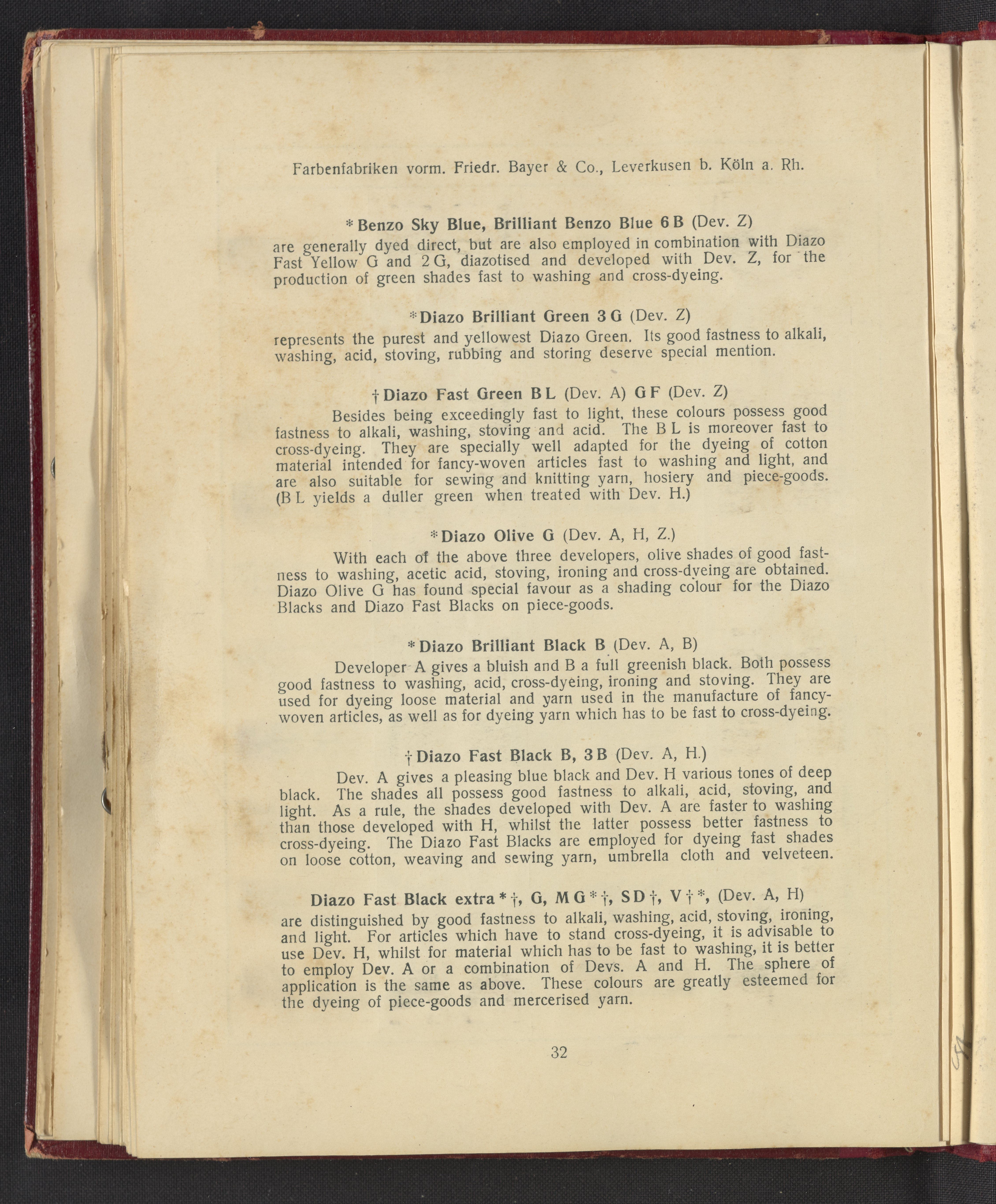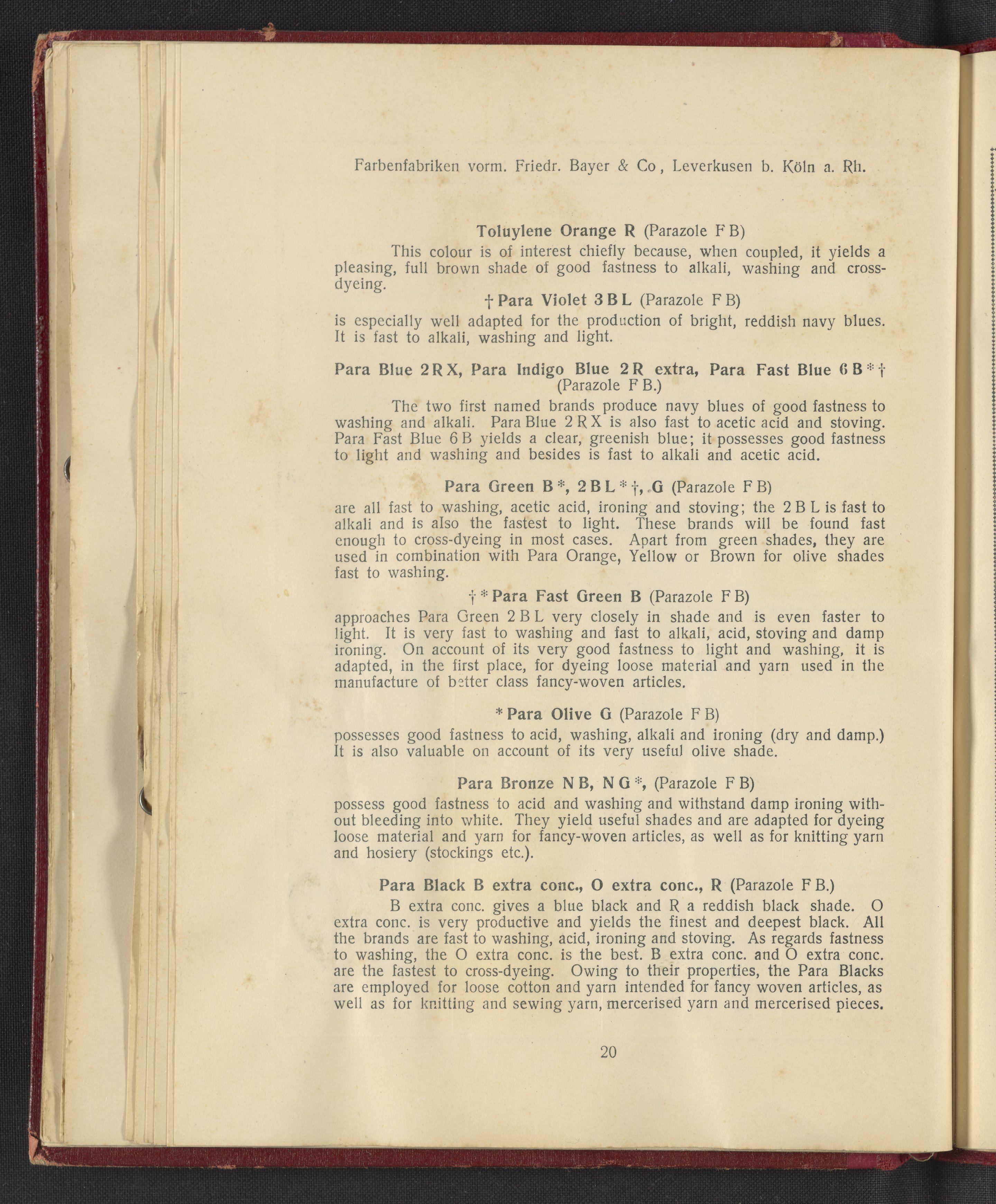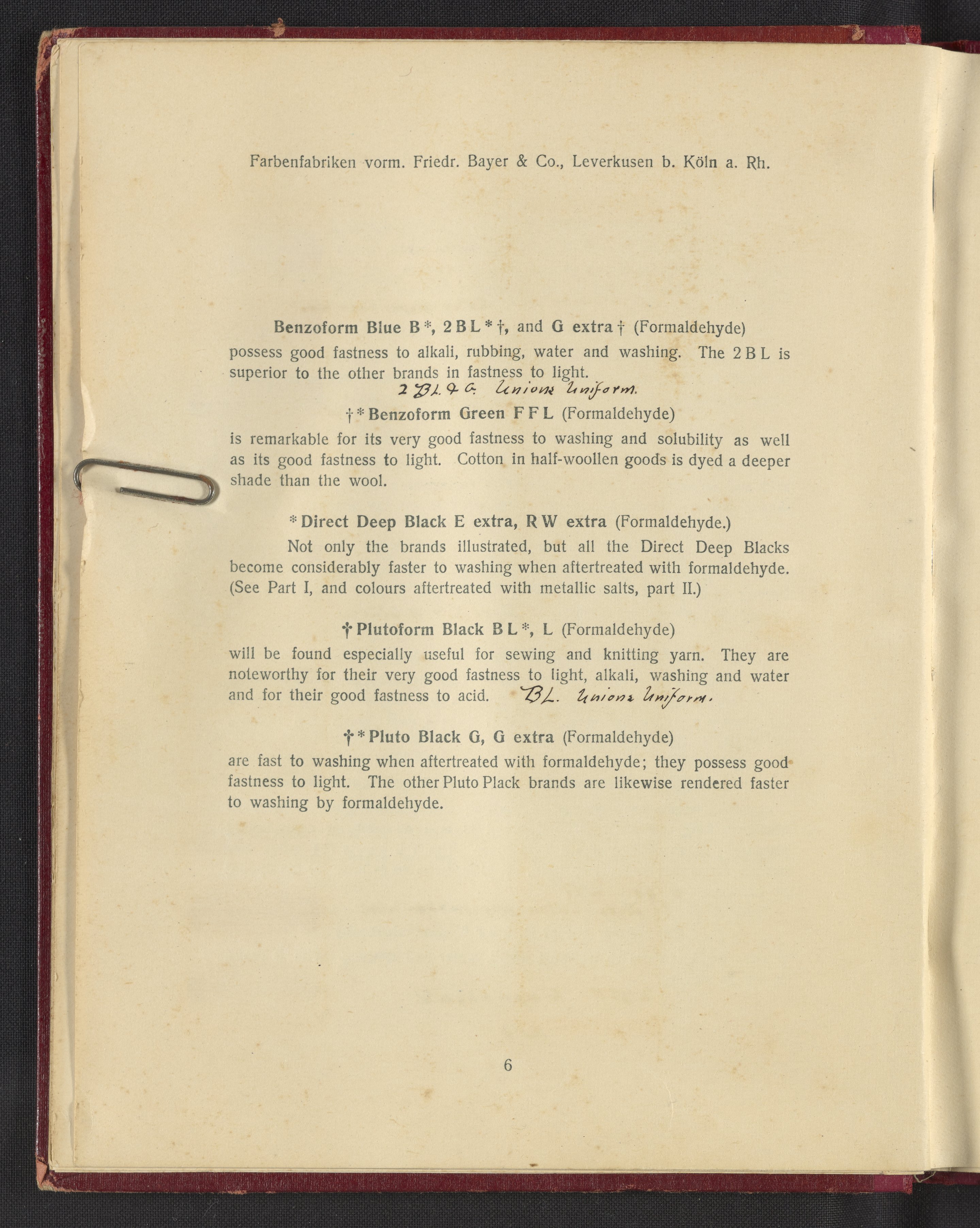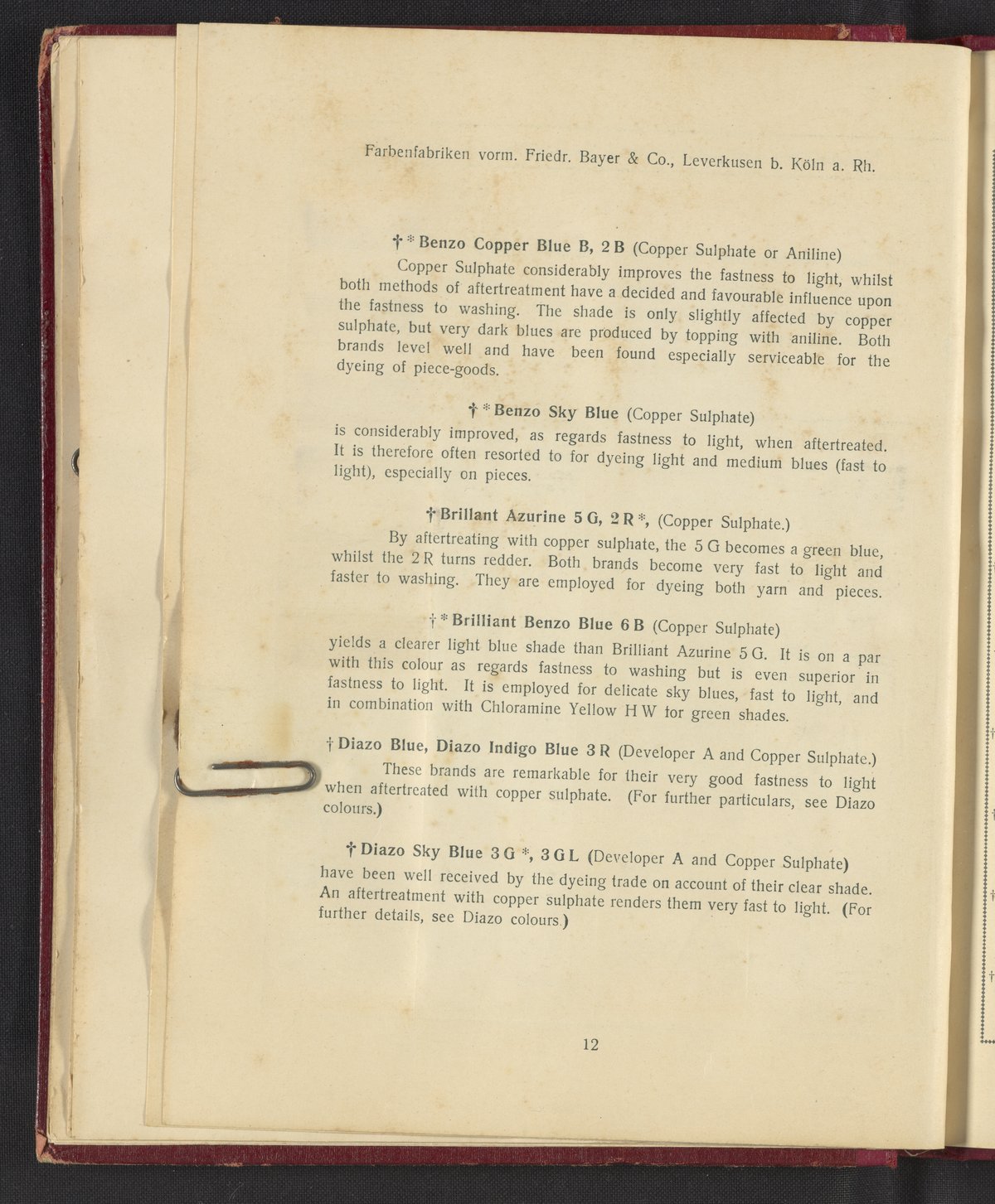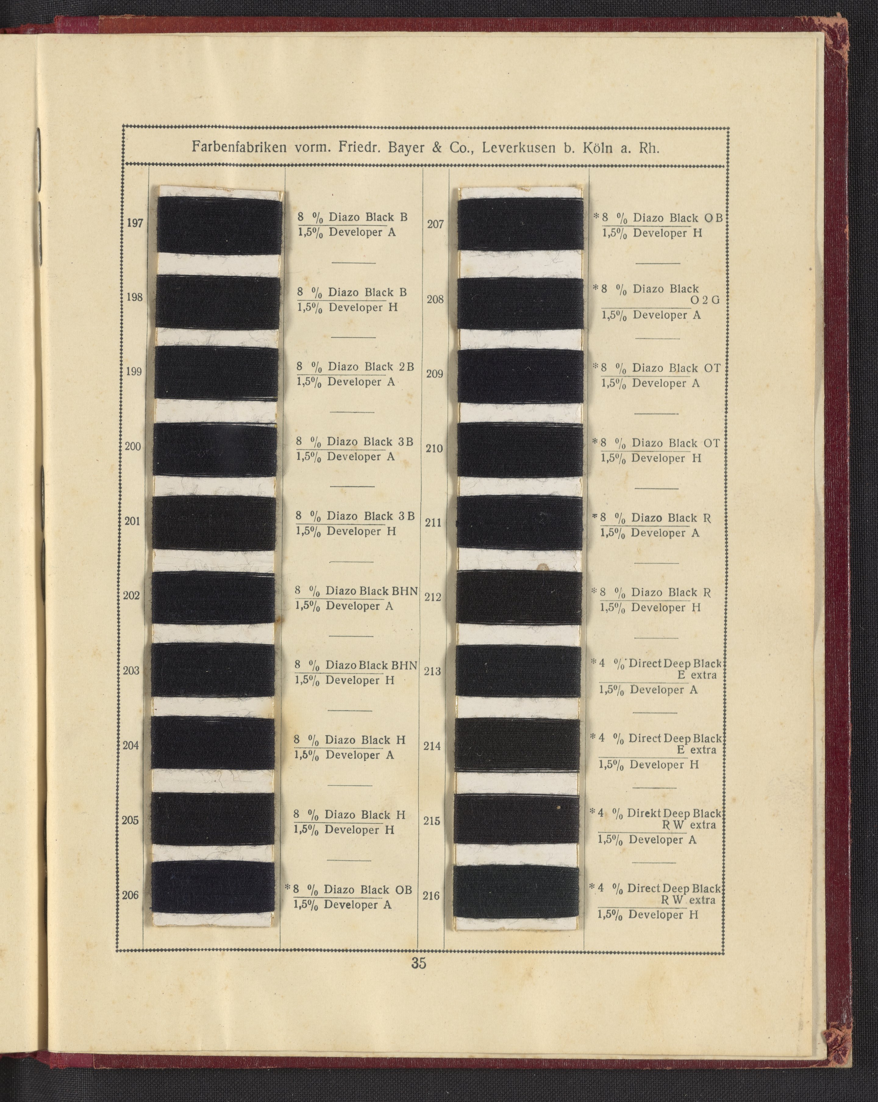 Small JPG1200 x 1459px — 446 KBLarge JPG2880 x 3502px — 2.5 MBFull-sized JPG4372 x 5316px — 5.0 MBOriginal fileTIFF — 4372 x 5316px — 66.6 MBPart II of a sample book from Farbenfabriken vorm. Friedrich Bayer & Co.—the first incarnation of the modern pharmaceutical company Bayer AG established to manufacture and sell synthetic dyestuffs—containing mounted dyed yarn and cotton thread samples. Benzo refers to benzene, indicating the chemistry of direct cotton color from coal-tar derivatives. The samples illustrate benzo colors after treatment with formaldehyde and metallic salts, coupled with parazole FB, and diazotized and developed. The text includes directions, dye concentrations and formulas, and information on color fastness.