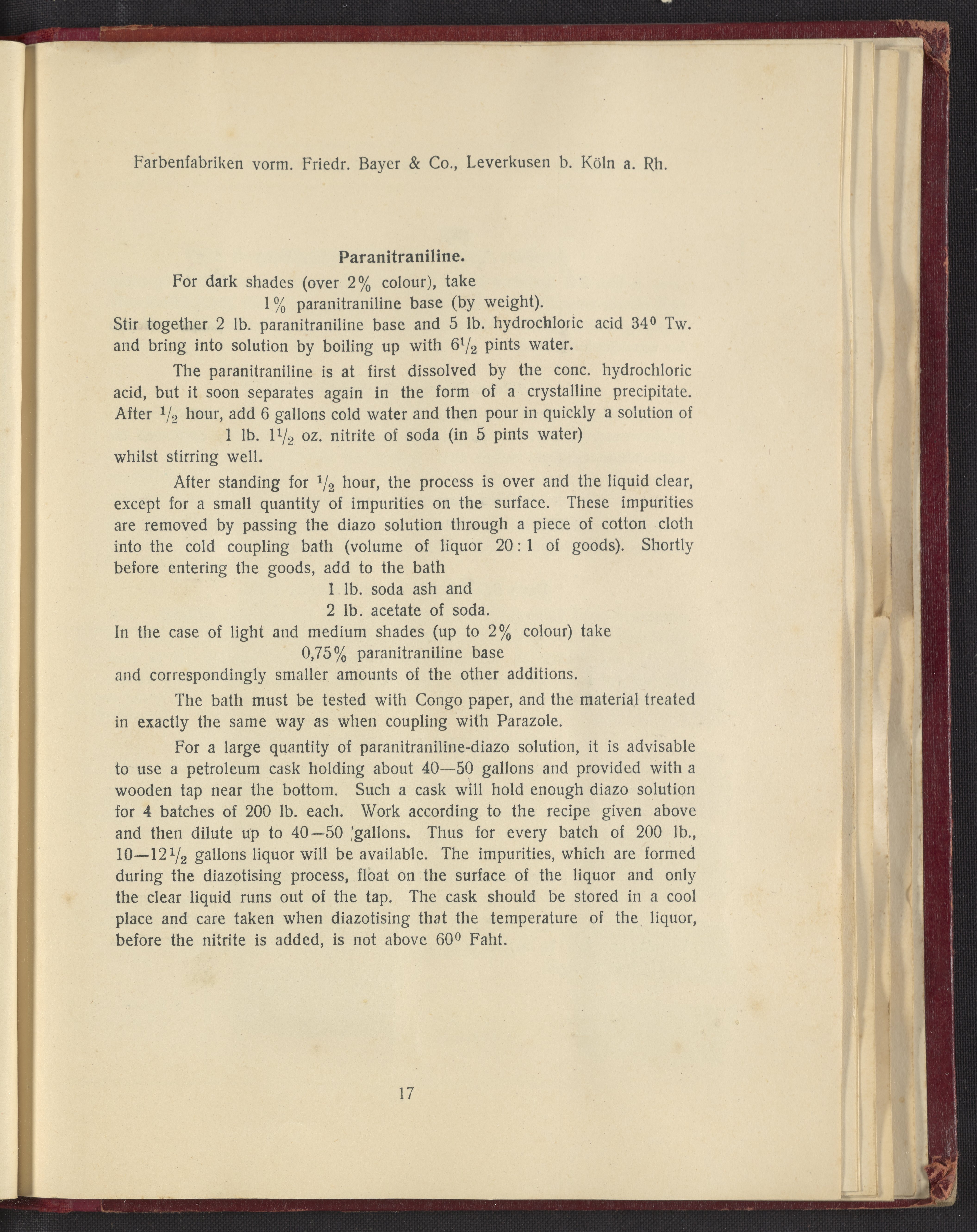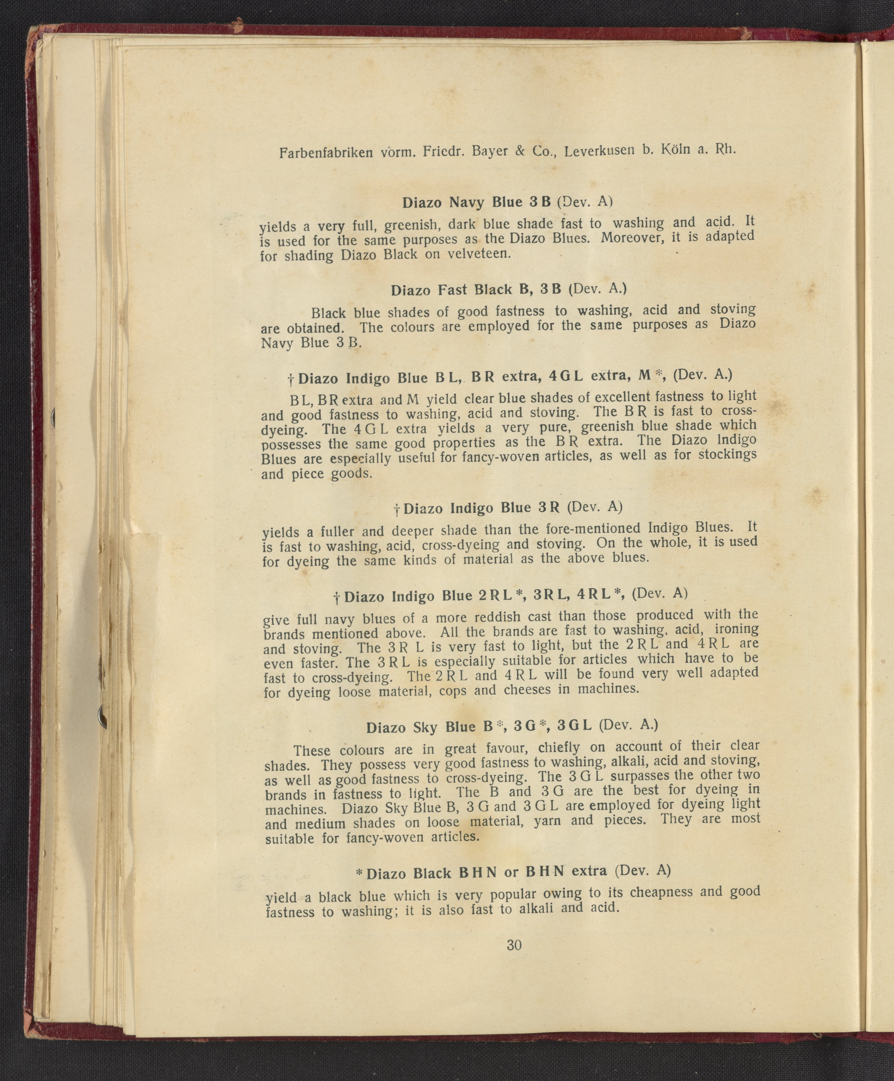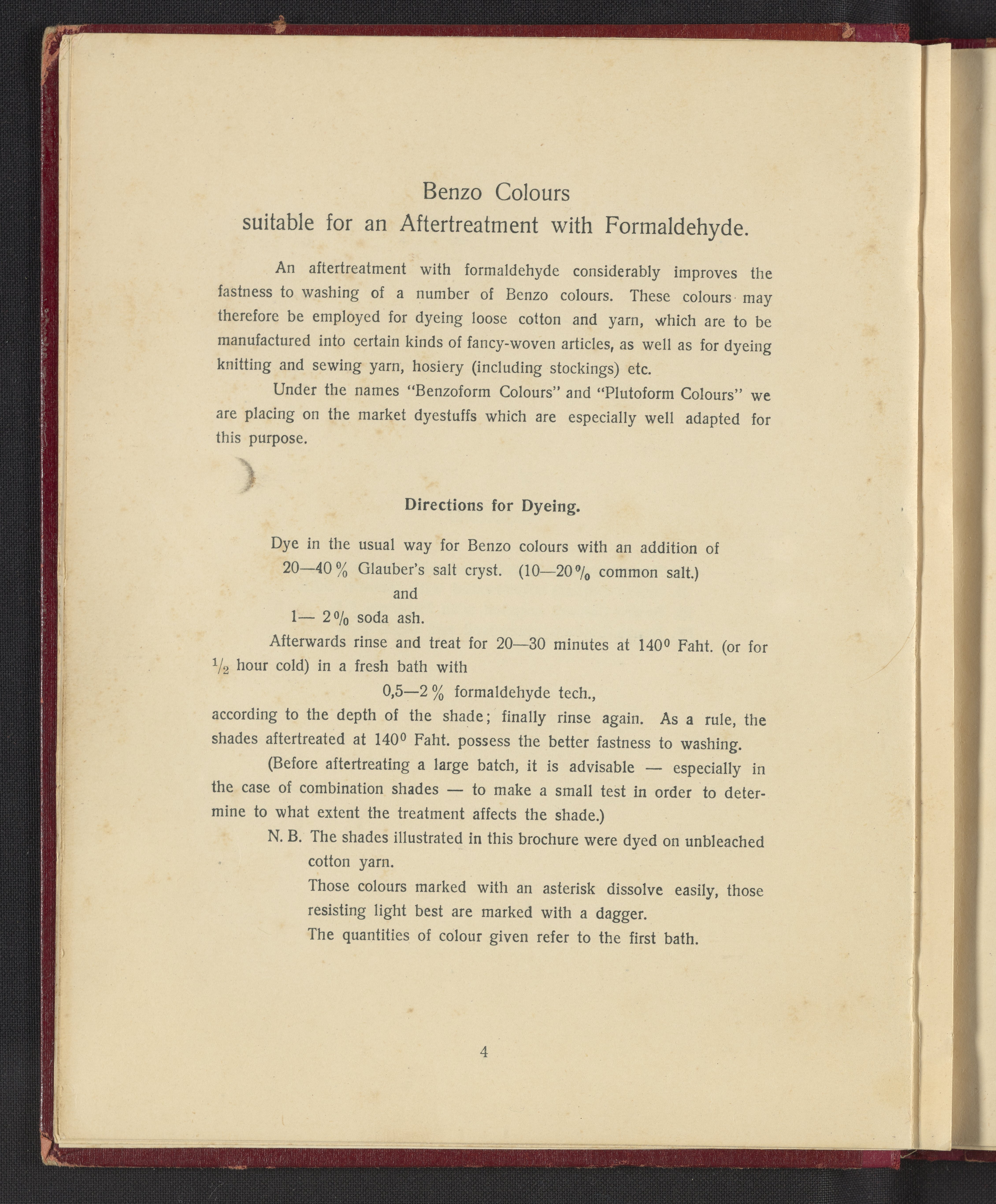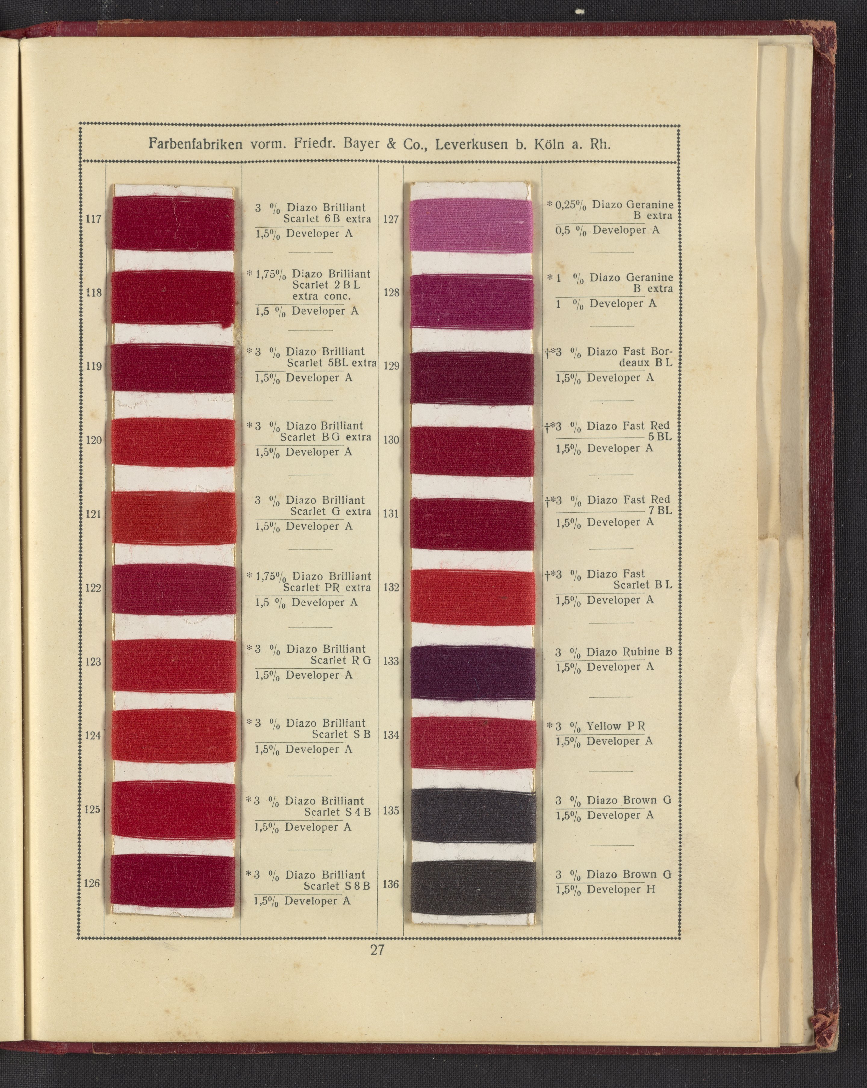 Small JPG1200 x 1459px — 446 KBLarge JPG2880 x 3502px — 2.5 MBFull-sized JPG4372 x 5316px — 5.0 MBOriginal fileTIFF — 4372 x 5316px — 66.6 MBPart II of a sample book from Farbenfabriken vorm. Friedrich Bayer & Co.—the first incarnation of the modern pharmaceutical company Bayer AG established to manufacture and sell synthetic dyestuffs—containing mounted dyed yarn and cotton thread samples. Benzo refers to benzene, indicating the chemistry of direct cotton color from coal-tar derivatives. The samples illustrate benzo colors after treatment with formaldehyde and metallic salts, coupled with parazole FB, and diazotized and developed. The text includes directions, dye concentrations and formulas, and information on color fastness.