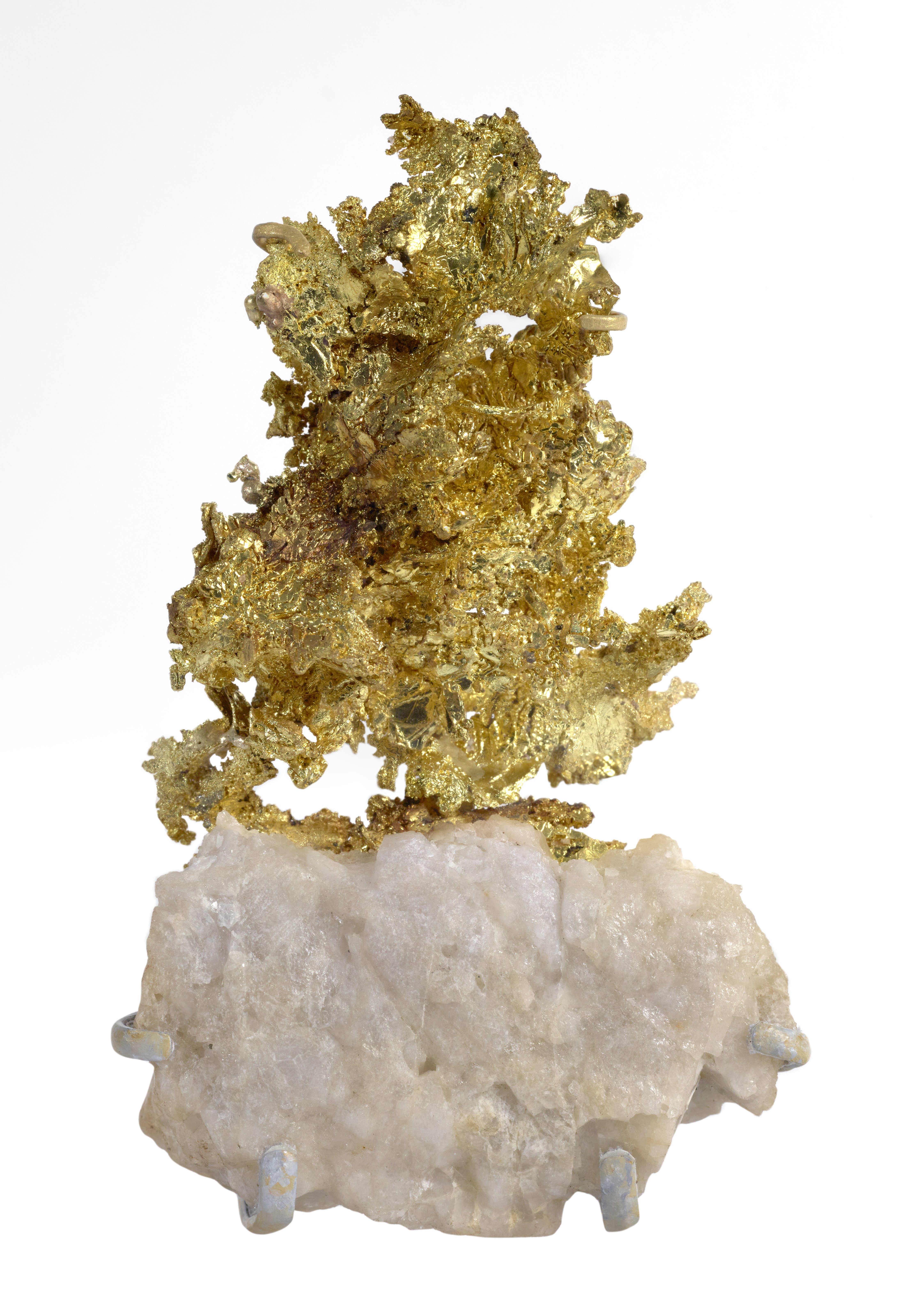 Small JPG1200 x 1678px — 287 KBLarge JPG2880 x 4028px — 1.3 MBFull-sized JPG4501 x 6295px — 2.7 MBOriginal fileTIFF — 4501 x 6295px — 162 MBGold in its natural metallic form on a quartz matrix. While the chemical formula for gold is Au, native gold can also have impurities of silver and copper. In its pure form, gold is dense, soft, malleable, and colored orange-yellow.