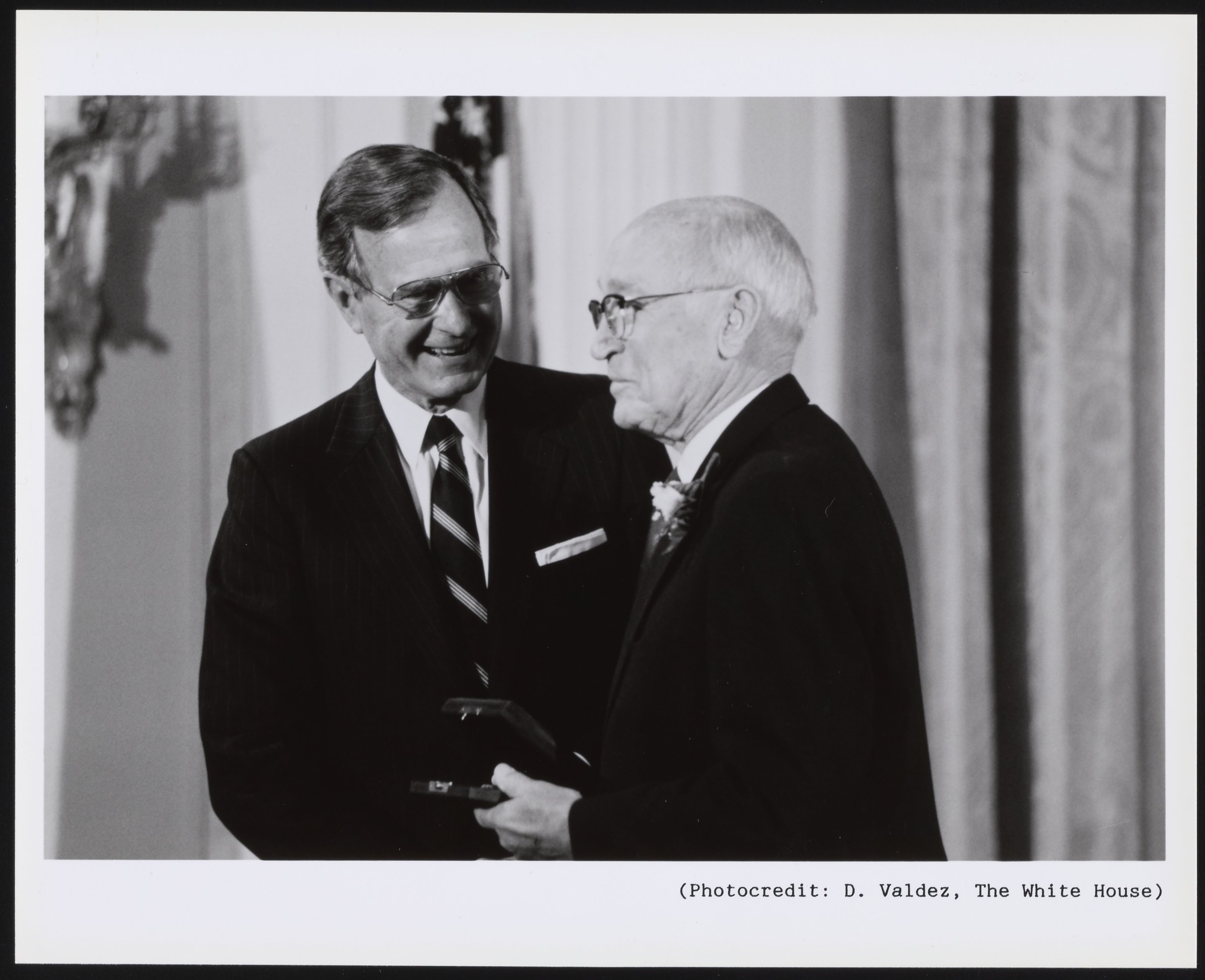 Valdez, D. “Arnold Beckman Receiving the National Medal of Science from President George H. W. Bush,” October 18, 1989. Beckman Historical Collection, Box 56, Folder 61. Science History Institute. Philadelphia. https://digital.sciencehistory.org/works/kk91fk52b.