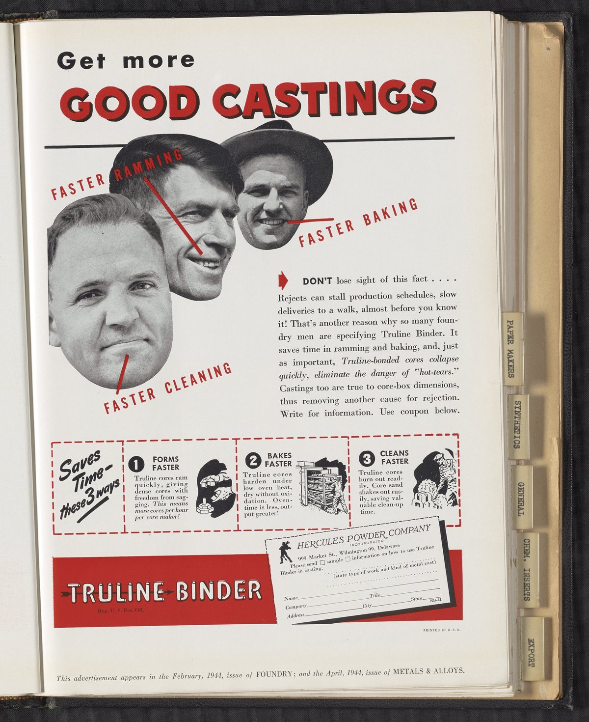 Hercules Incorporated. “Truline Binders: Get More Good Castings.” 1944 Hercules Advertisements, 1944. Records of Hercules Incorporated, Volume 1944. Science History Institute. Philadelphia. https://digital.sciencehistory.org/works/kk91fm30h.