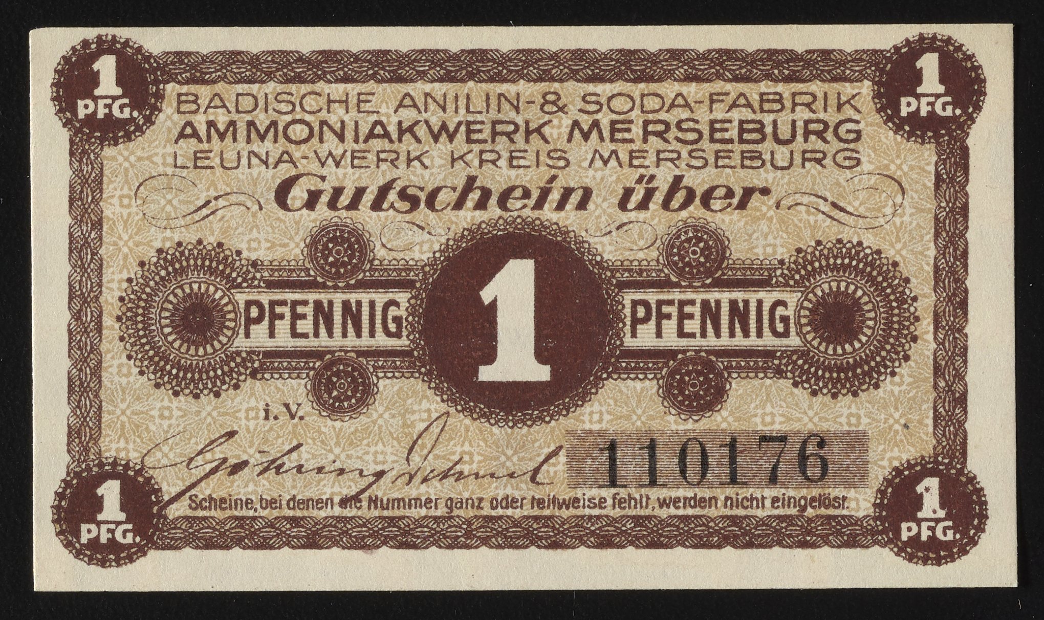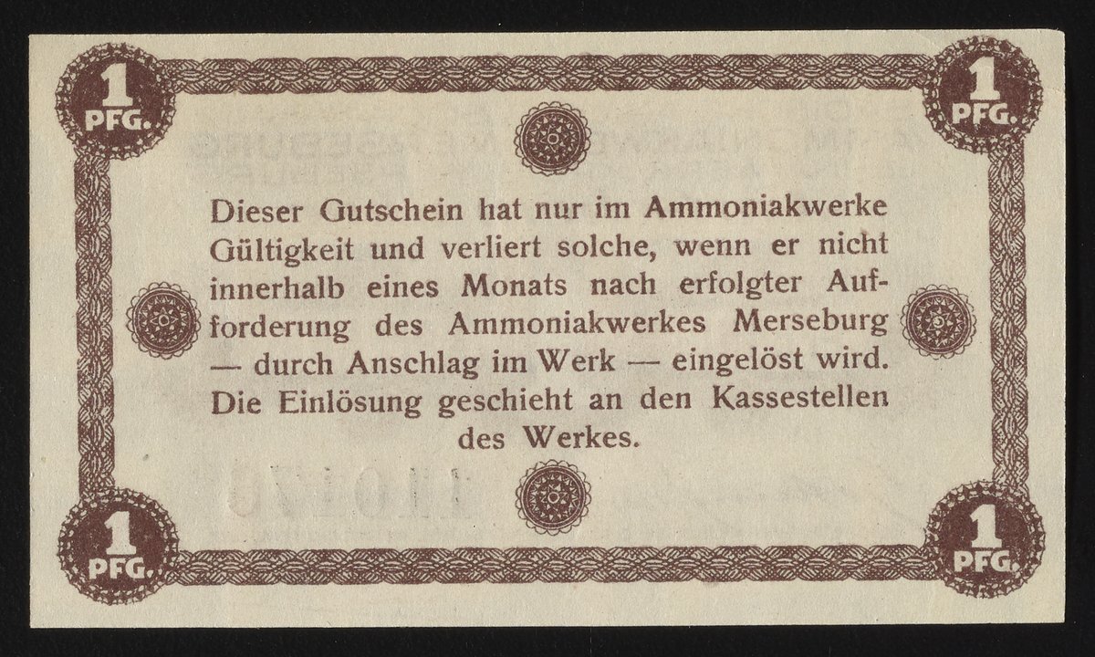 Small JPG1200 x 713px — 261 KBFull-sized JPG2040 x 1212px — 635 KBOriginal fileTIFF — 2040 x 1212px — 7.1 MBThis one Pfennig Gutschein, or voucher, was issued by Badische Anilin- & Soda-Fabrik. Styled after a banknote, the verso of this company scrip includes the terms of the scrip. During World War One, paper money was issued due to the shortage of coins as metal was commonly used for the war effort. This particular voucher was issued by the Ammoniakwerk Merseburg Leuna-werk, or the ammonia works of Merseburg. Paper features a watermark design.