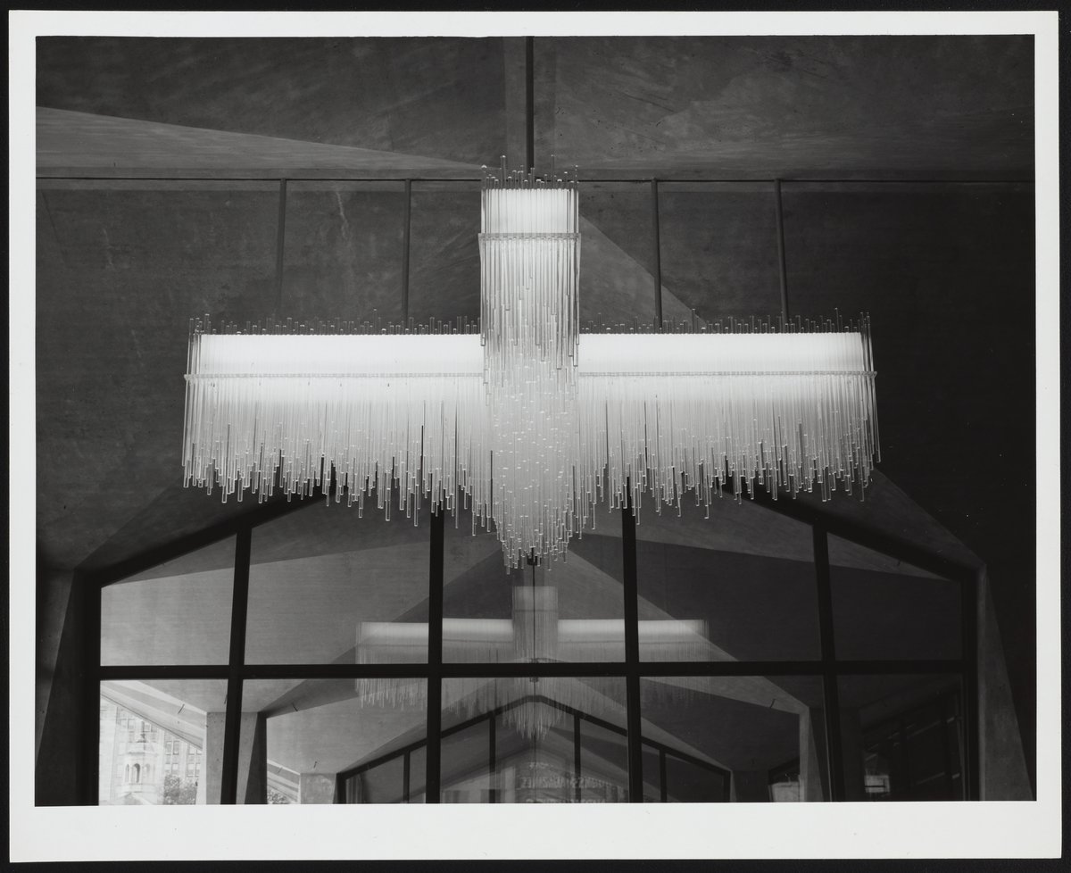 Rohm and Haas Company. “Plexiglas Chandelier at Rohm and Haas Home Office Building ,” June 14, 1965. Rohm & Haas Company Archives, Box Rohm and Haas Building 2 of 2, Folder Photos by Gus Pasquarella. Science History Institute. Philadelphia. https://digital.sciencehistory.org/works/kknzan6.