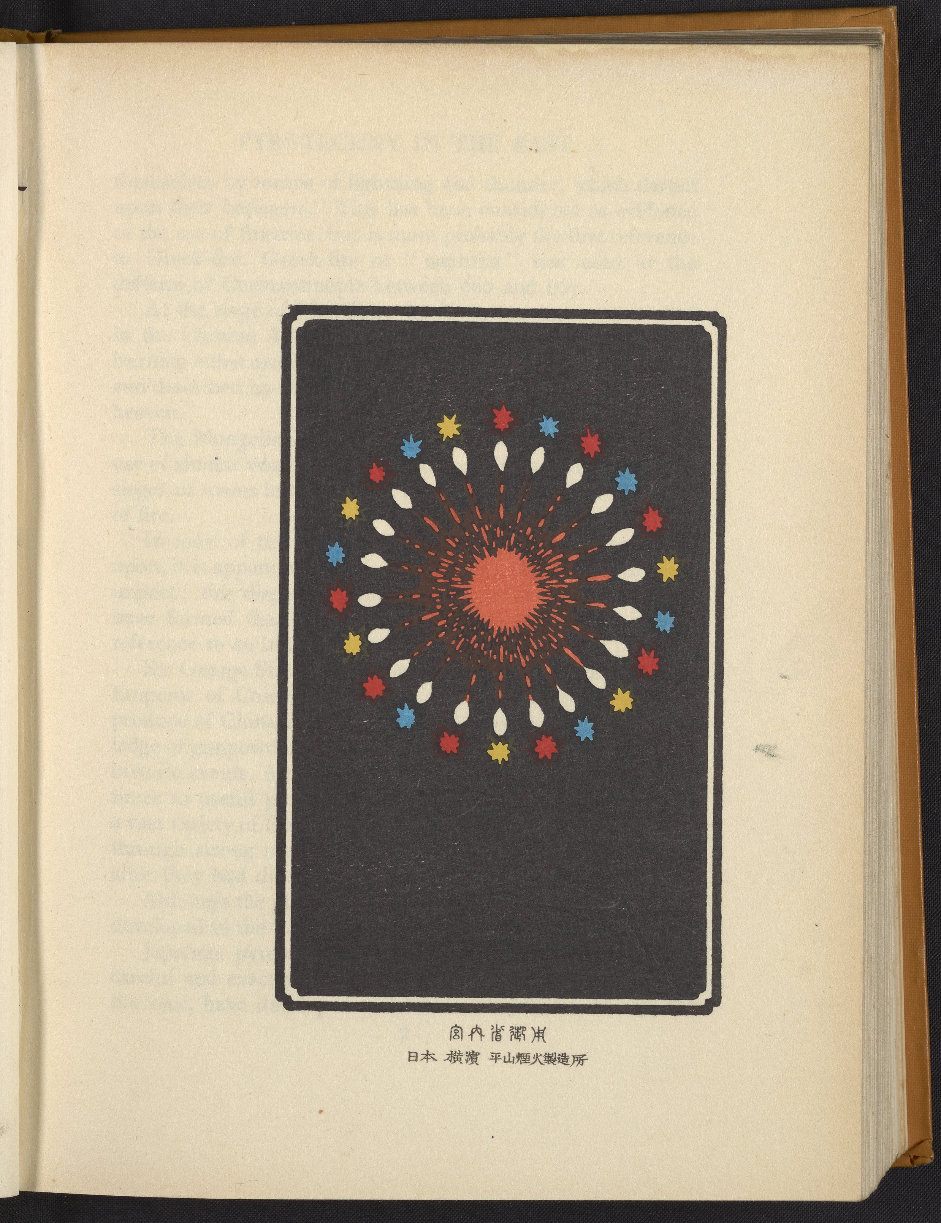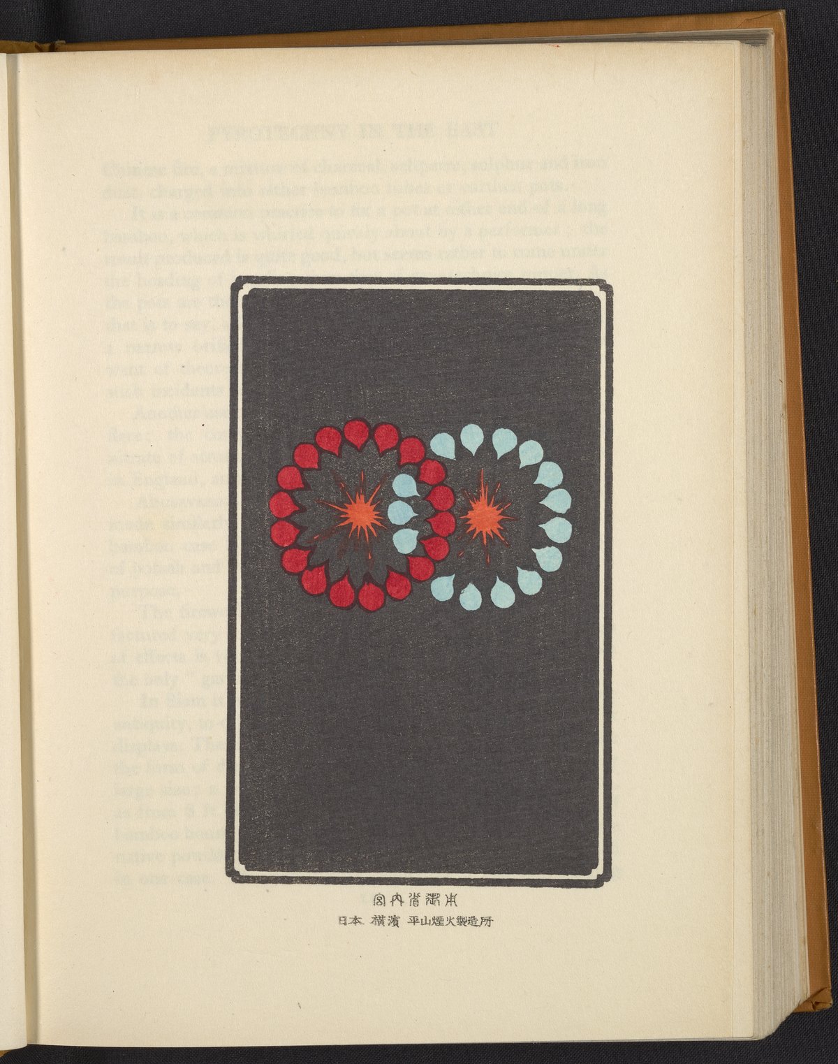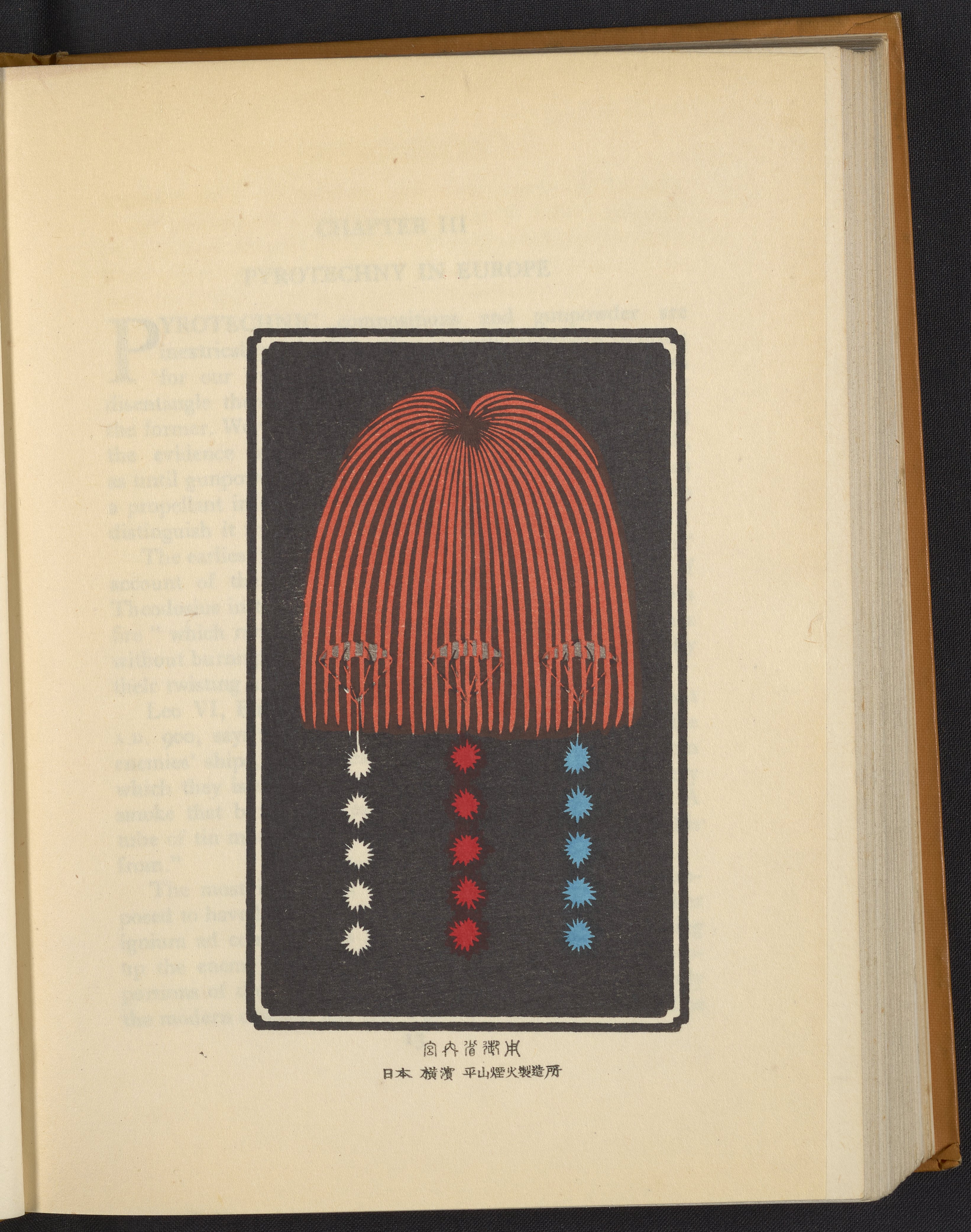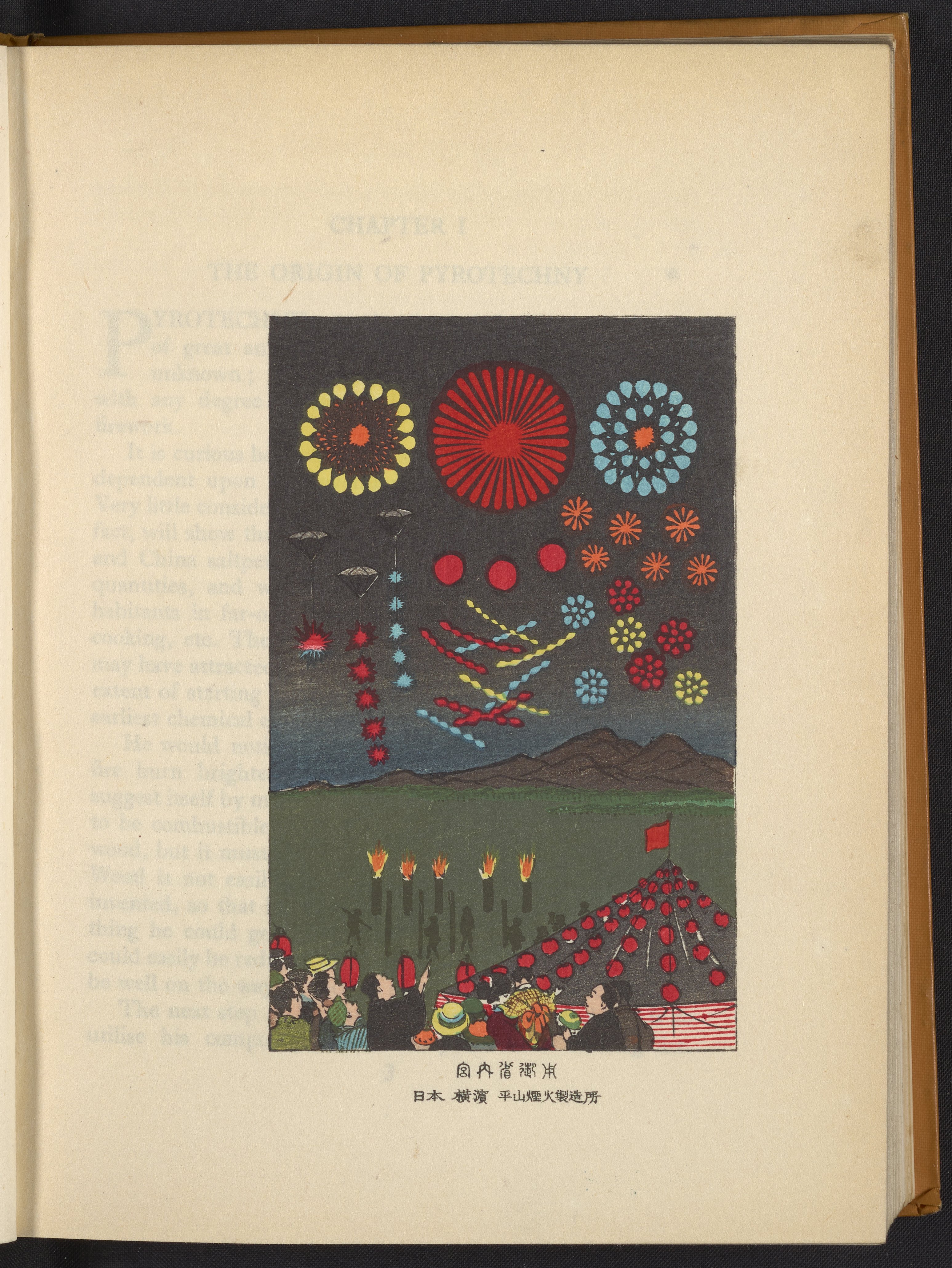Small JPG1200 x 1546px — 365 KBLarge JPG2880 x 3709px — 1.8 MBFull-sized JPG3222 x 4150px — 2.2 MBOriginal fileTIFF — 3222 x 4150px — 38.3 MBVolume containing a history of firework design and creation. The work is divided into two parts, the first containing chapters concerning the history of pyrotechny and firework manufacture, and the second describing various classifications of fireworks and their display. Concludes with a bibliography, a list of principal ingredients used in pyrotechny, and an index. Contains 6 colored Japanese prints of fireworks and 29 black and white printed plates.