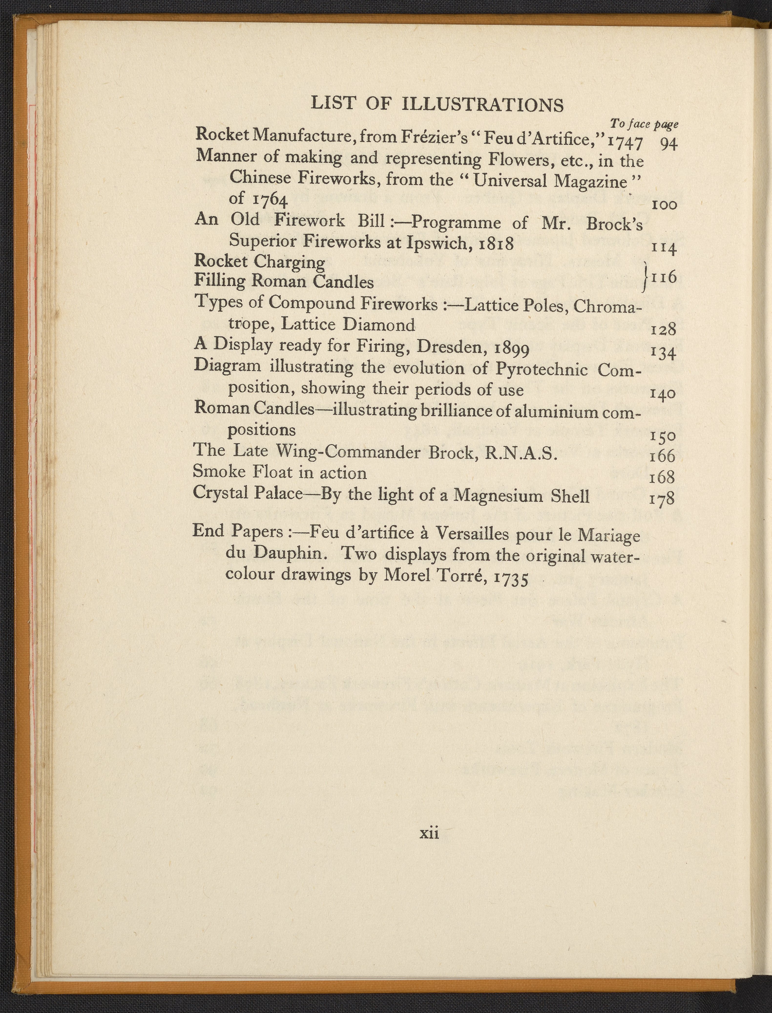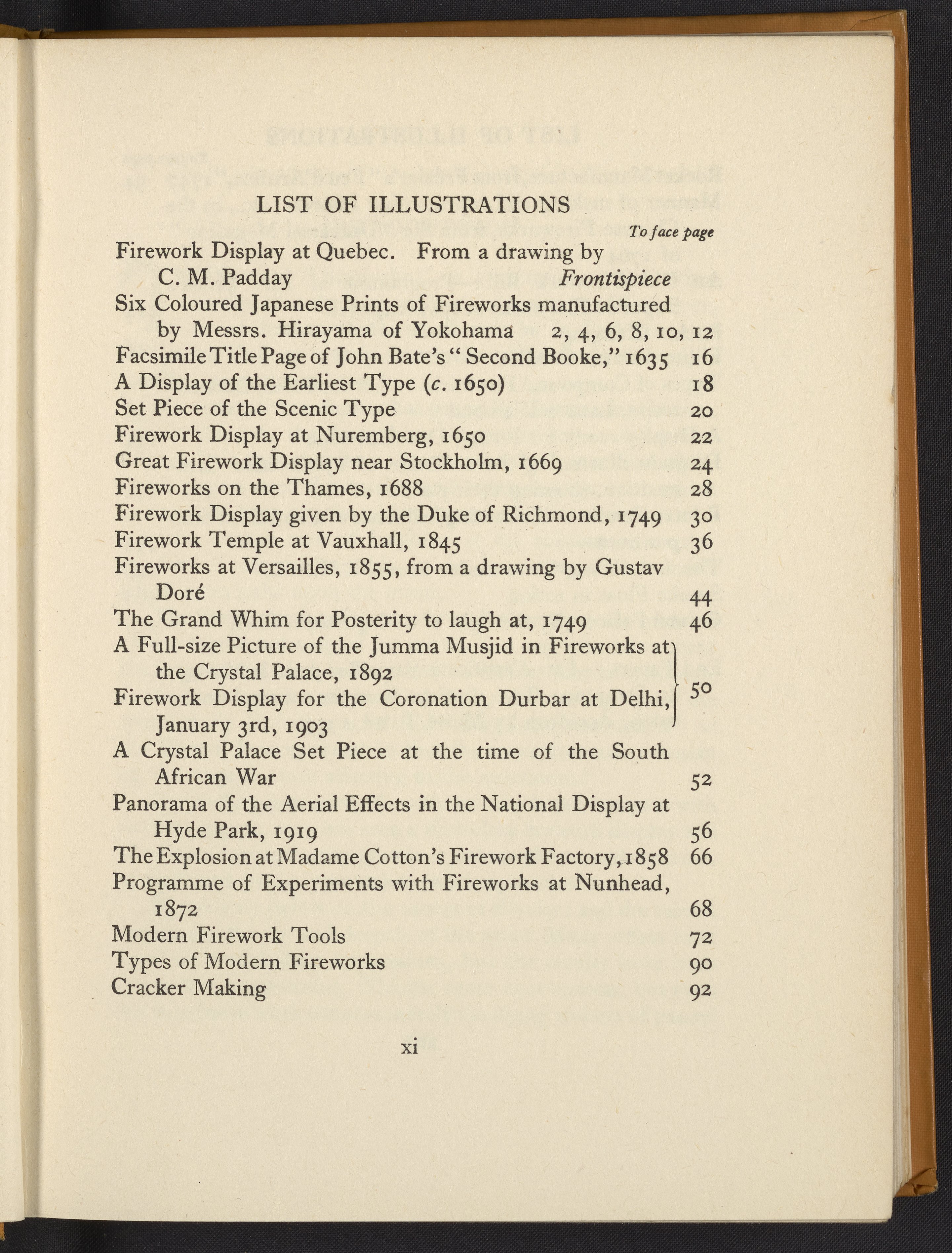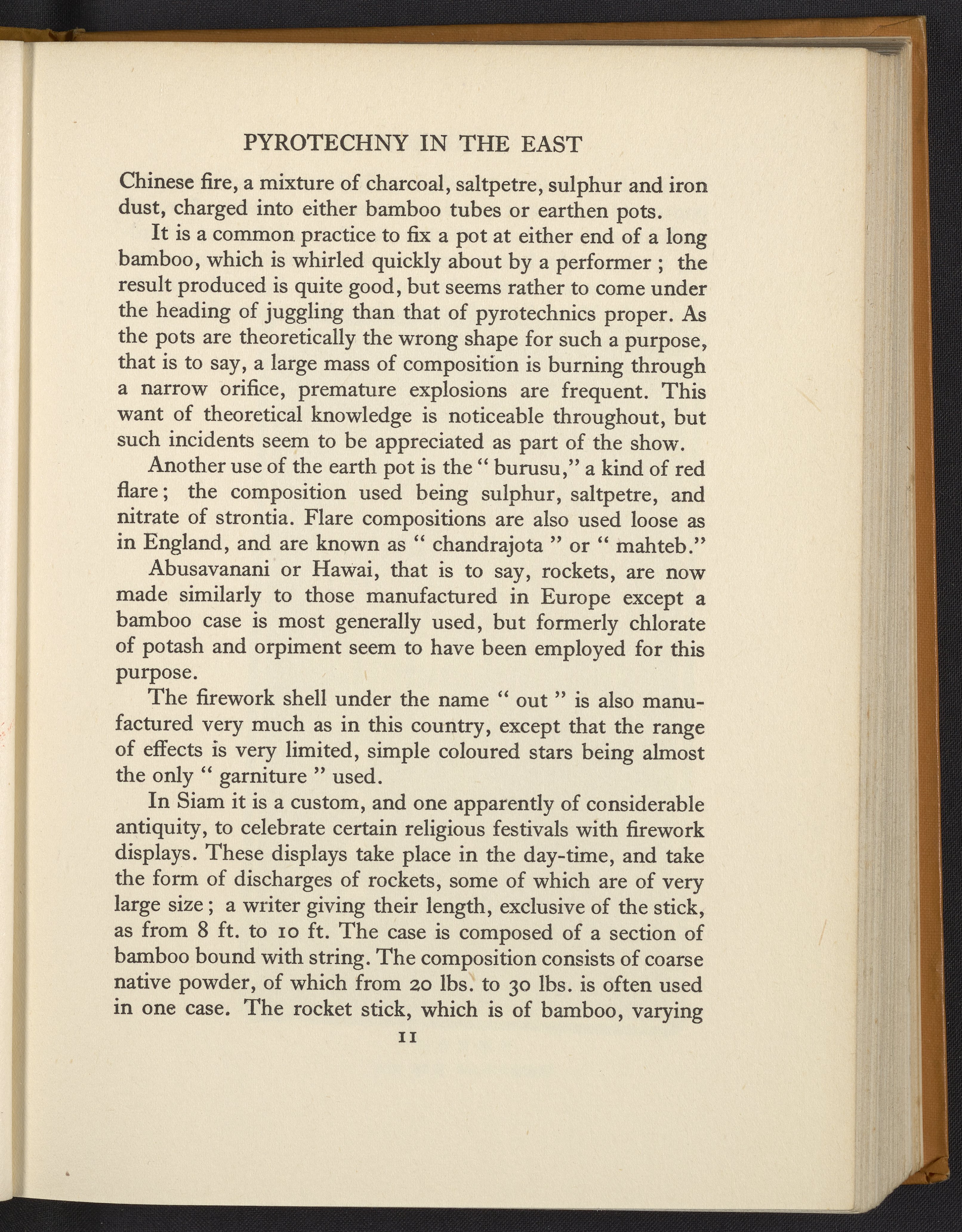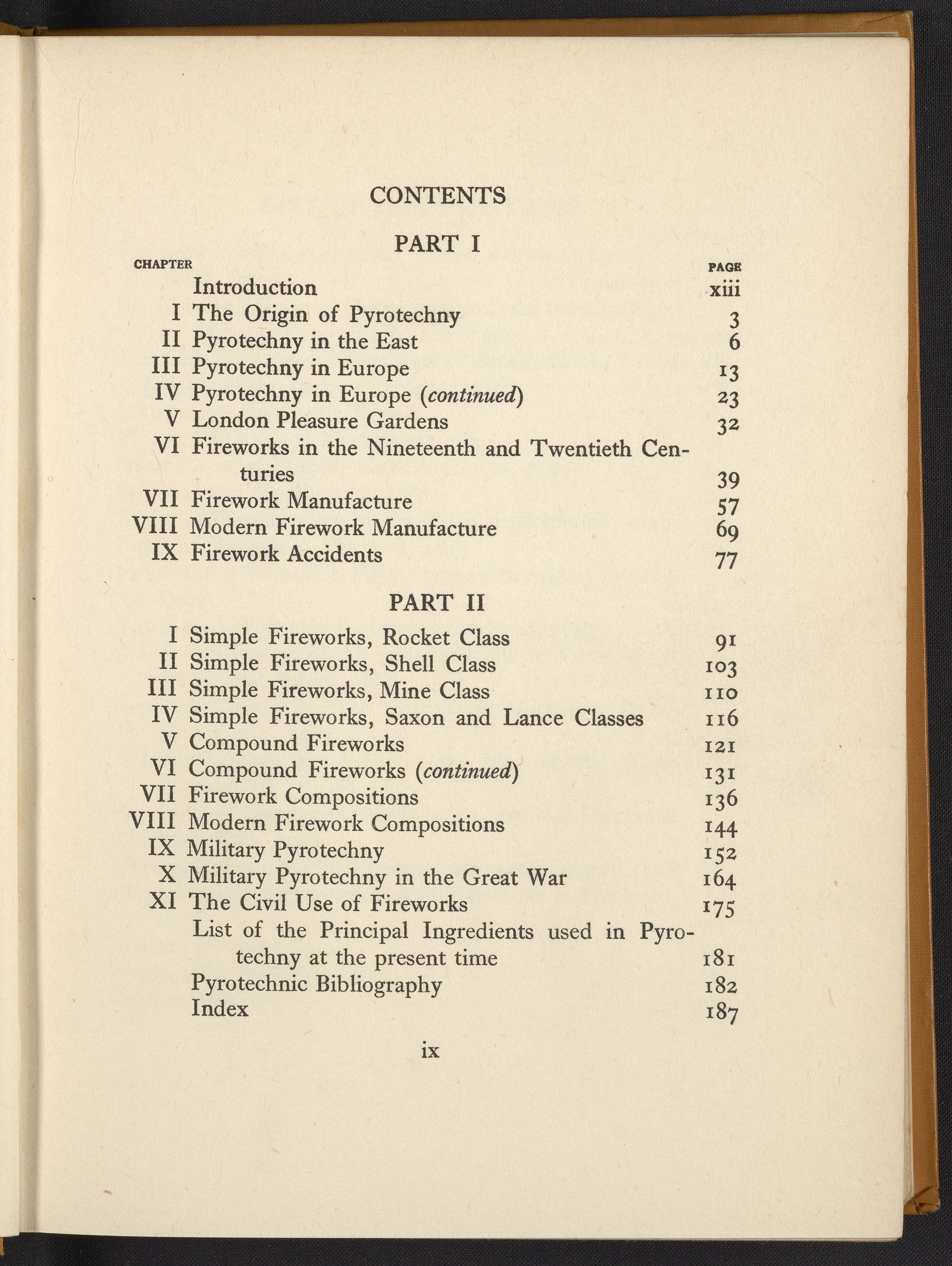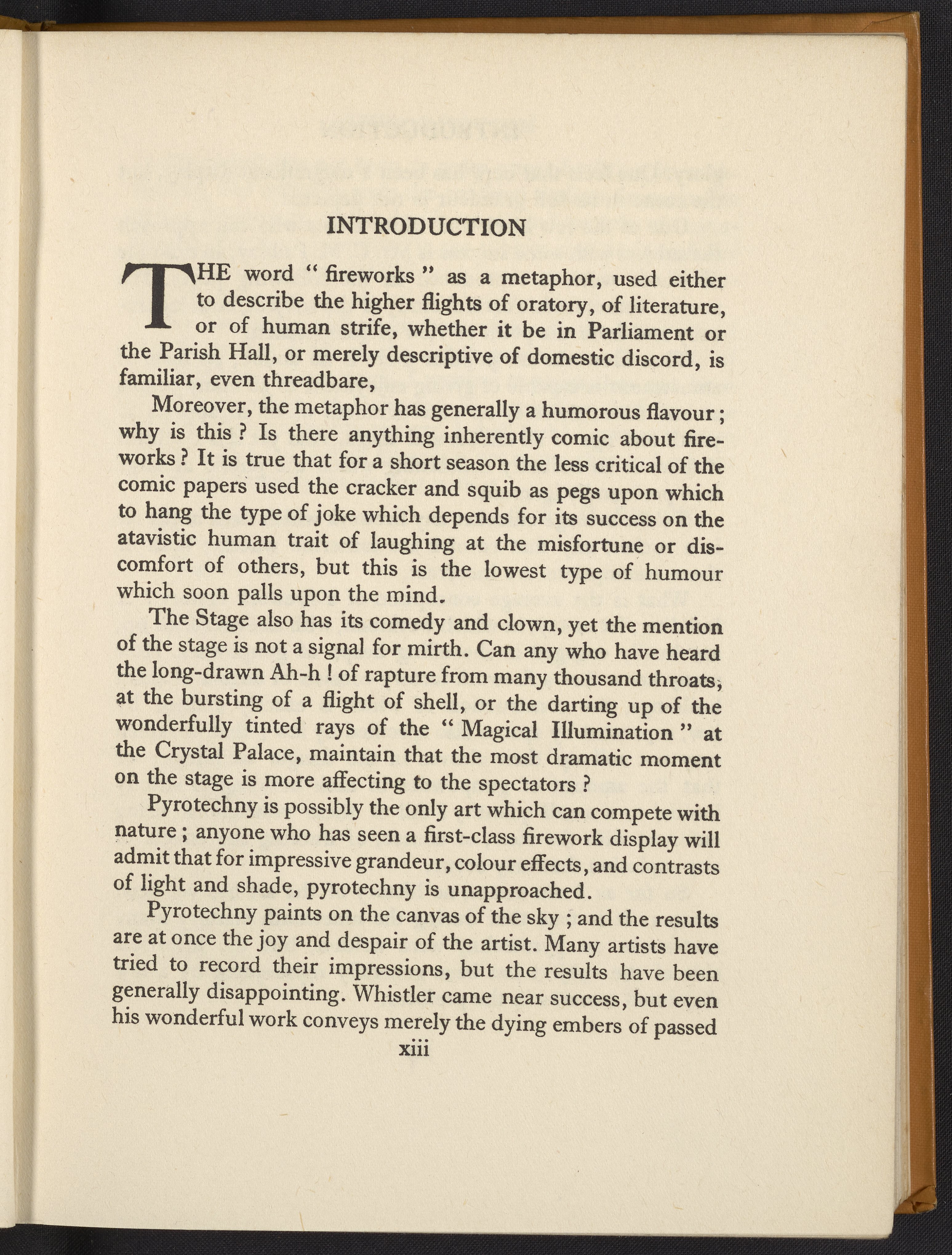 Small JPG1200 x 1546px — 365 KBLarge JPG2880 x 3709px — 1.8 MBFull-sized JPG3222 x 4150px — 2.2 MBOriginal fileTIFF — 3222 x 4150px — 38.3 MBVolume containing a history of firework design and creation. The work is divided into two parts, the first containing chapters concerning the history of pyrotechny and firework manufacture, and the second describing various classifications of fireworks and their display. Concludes with a bibliography, a list of principal ingredients used in pyrotechny, and an index. Contains 6 colored Japanese prints of fireworks and 29 black and white printed plates.