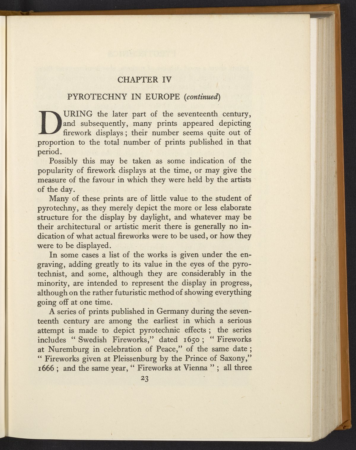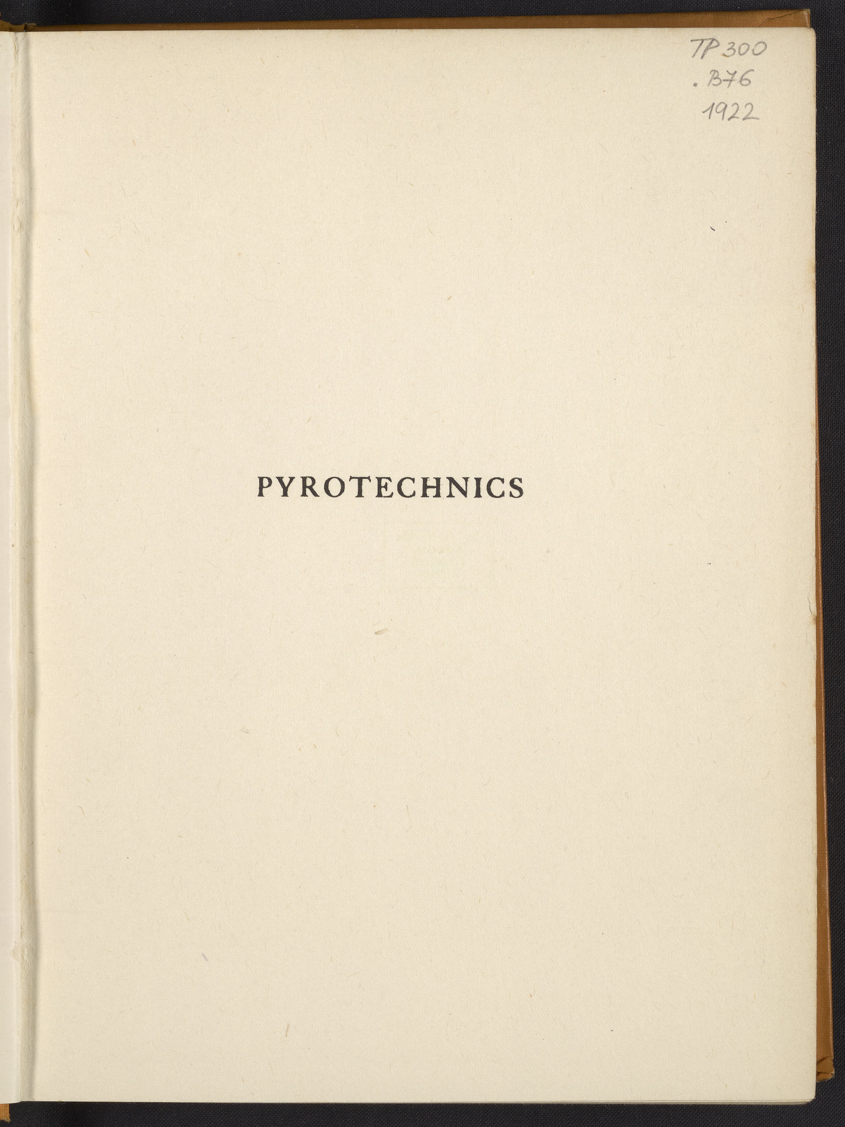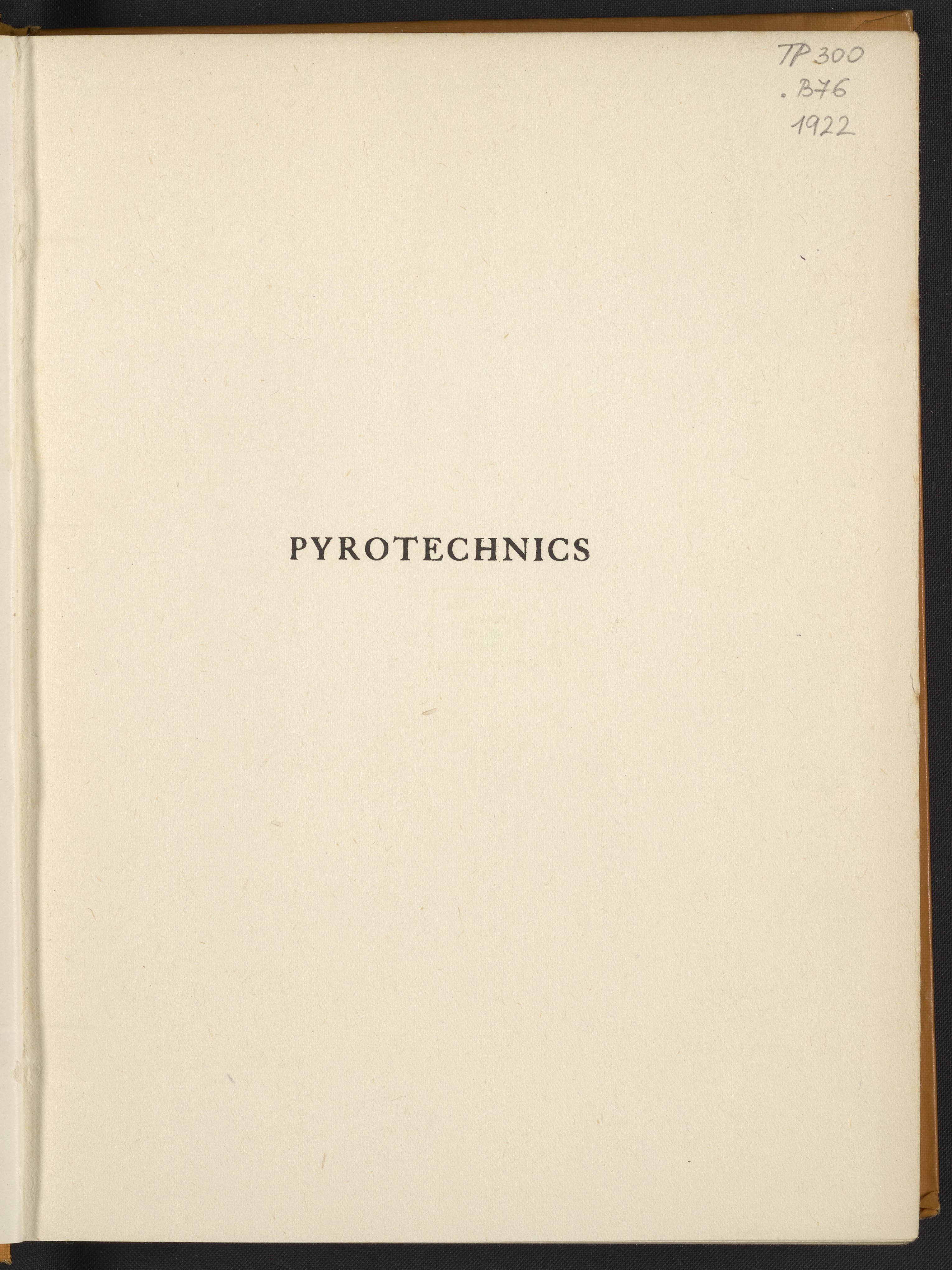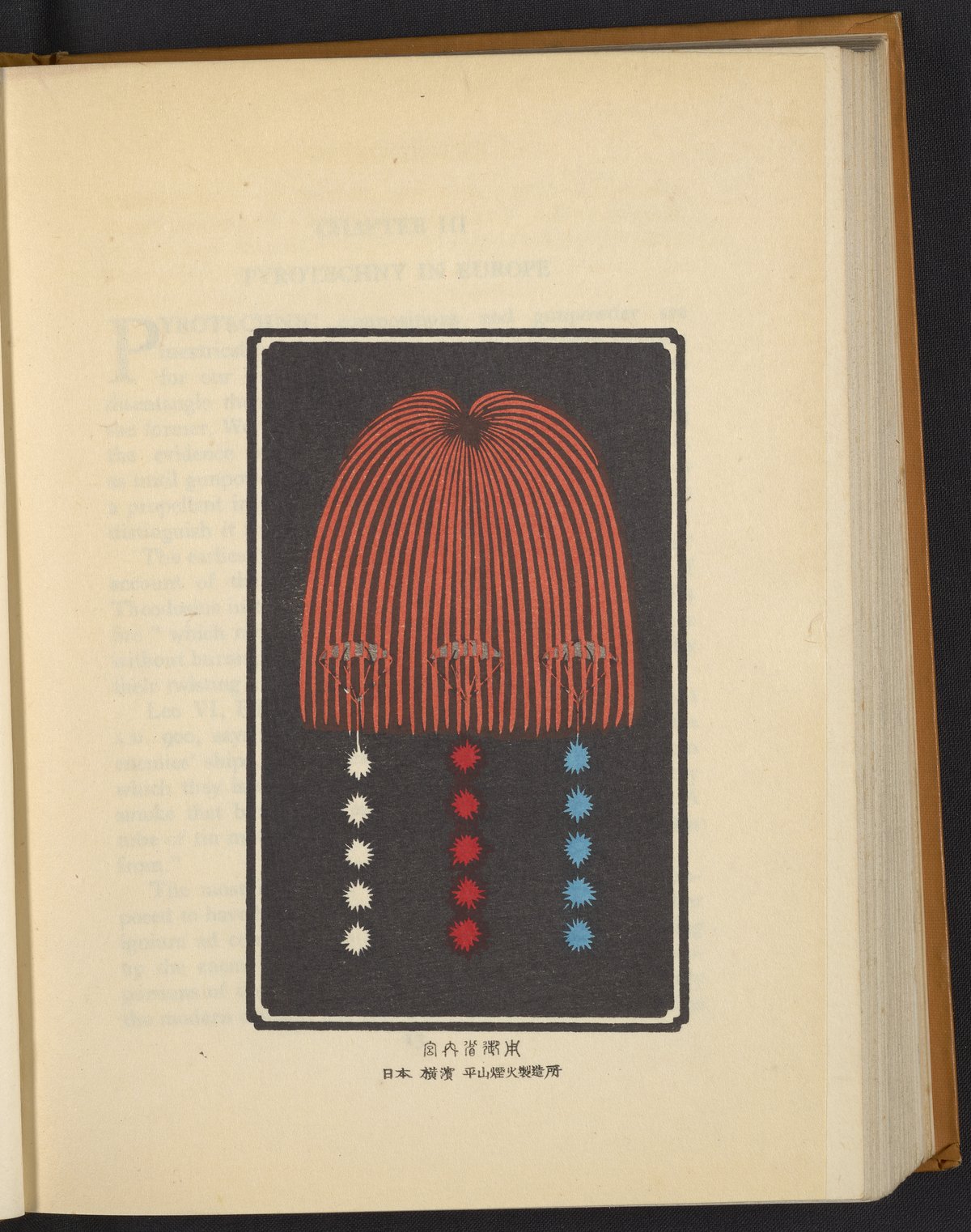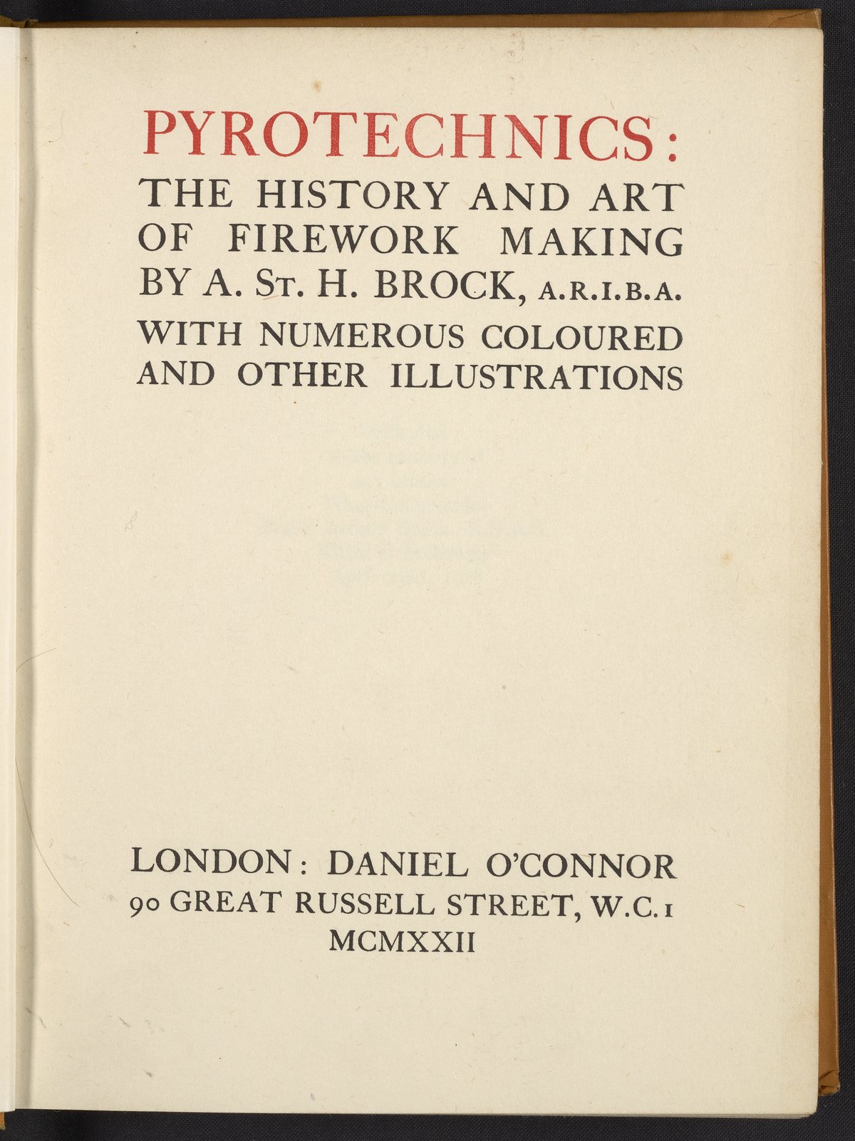 Brock, Alan St. H. (Alan St. Hill). “Pyrotechnics: The History and Art of Firework Making.” D. O'Connor, 1922. TP300 .B76 1922. Science History Institute. Philadelphia. https://digital.sciencehistory.org/works/kp0n53g.
