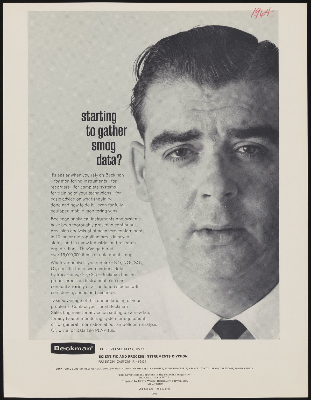 Erwin Wasey, Ruthrauff, and Inc. Beckman Instruments. “Starting to Gather Smog Data?,” 1964. Beckman Historical Collection, Box 49, Folder 22. Science History Institute. Philadelphia. https://digital.sciencehistory.org/works/kp78gg381.