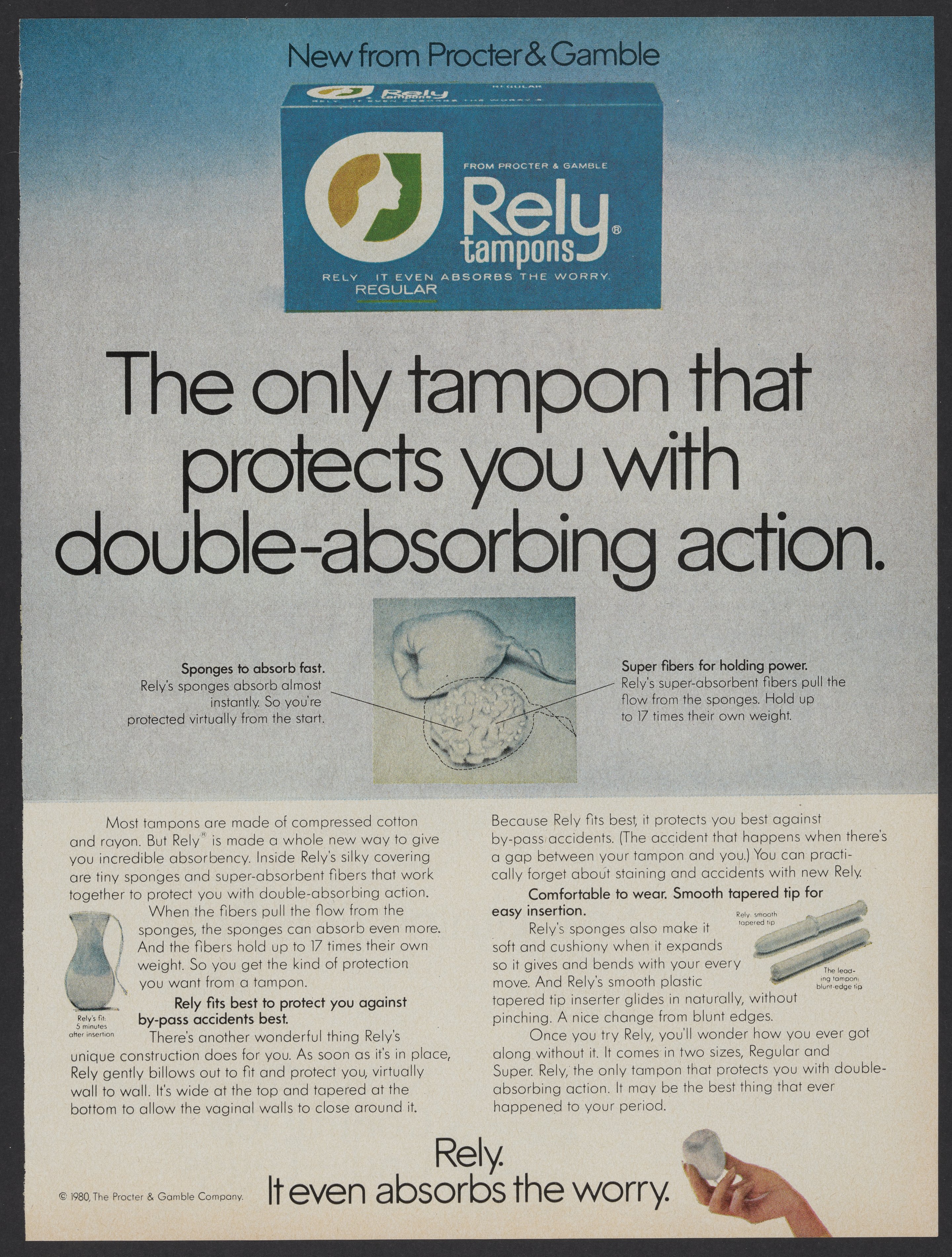 Procter & Gamble Company. “Rely Tampons Advertisement,” 1980. Science History Institute. Philadelphia. https://digital.sciencehistory.org/works/kpvi0ra.