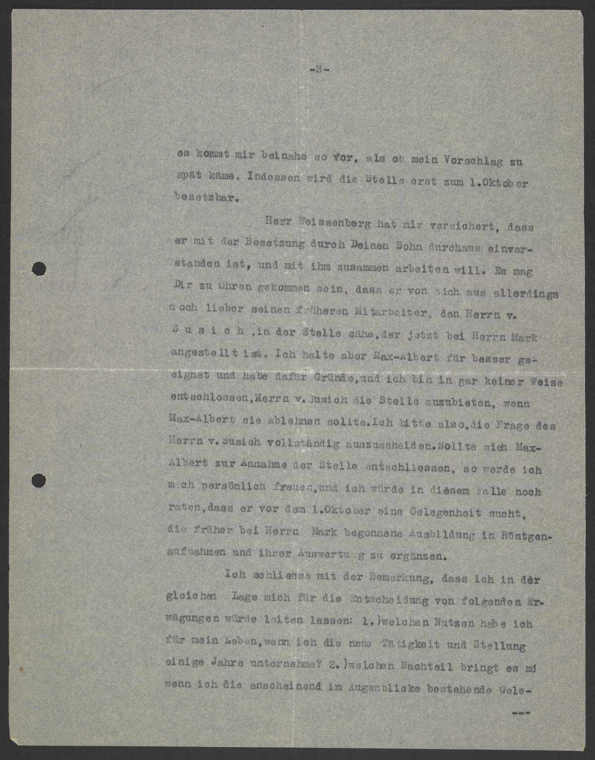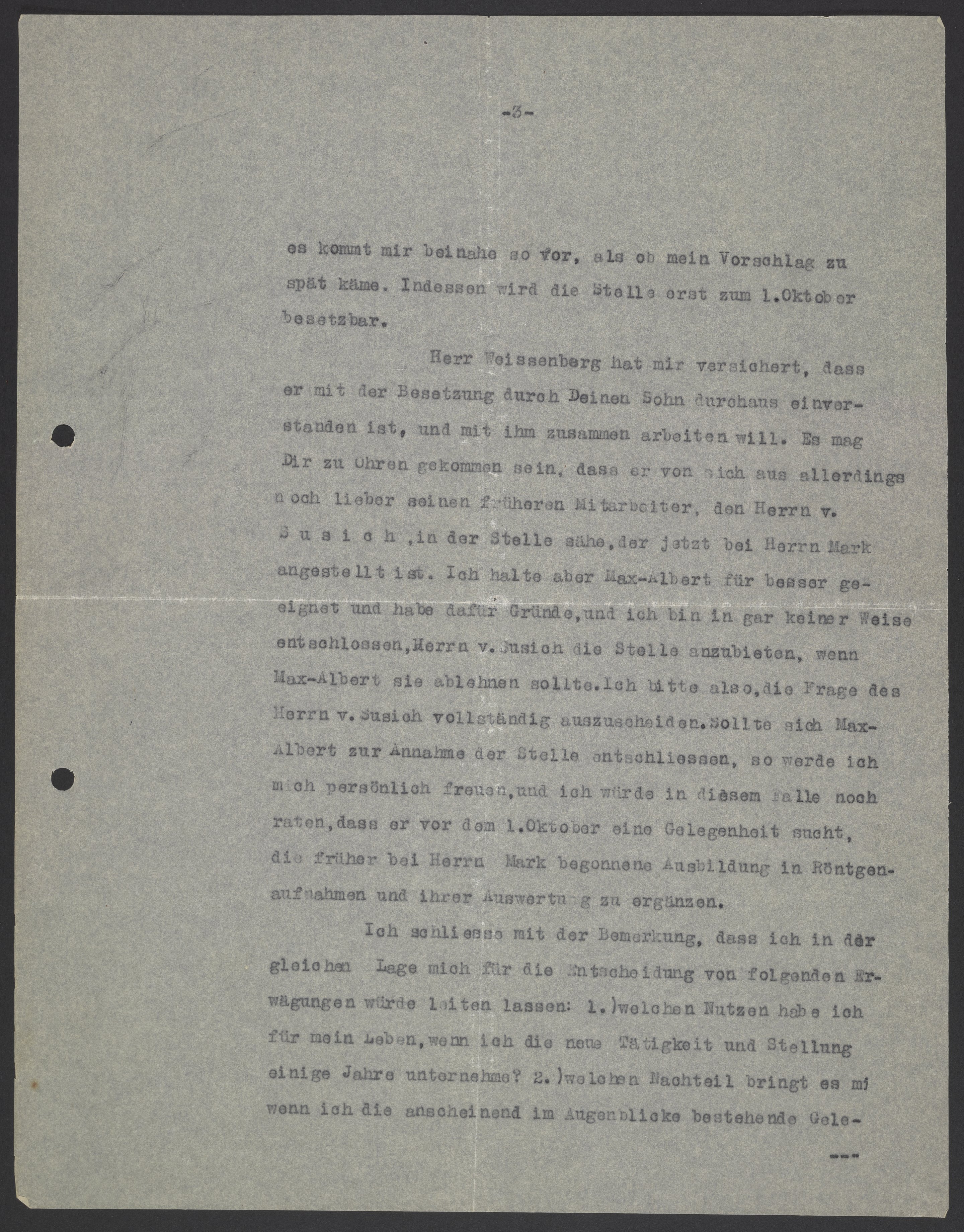 Herr Weissenberg hat mir versichert, dass er mit der Besetzung durch Deinen Sohn durchaus einverstanden ist, und mit ihm zusammen arbeiten will. Es mag Dir zu Ohren gekommen sein, dass er von sich aus allerdings noch lieber seinen früheren Mitarbeiter, den Herrn v. Susich, , der jetzt bei Herrn Mark angestellt ist. Ich halte aber Max-Albert für besser geeignet und habe dafür Gründe, und ich bin in gar keiner Weise entschlossen, Herrn v. Susich die Stelle anzubieten, wenn Max-Albert sie ablehnen sollte. Ich bitte also, die Frage des Herrn v. Susich vollständig auszuscheiden. Sollte sich Max-Albert zur Annahme der Stelle entschliessen, so werde ich mich persönlich freuen, und ich würde in diesen Falle noch raten, dass er vor dem 1. Oktober eine Gelegenheit sucht, die früher bei Herrn Mark begonnene Ausbildung in Röntgenaufnahmen und ihrer Auswertung zu ergänzen.