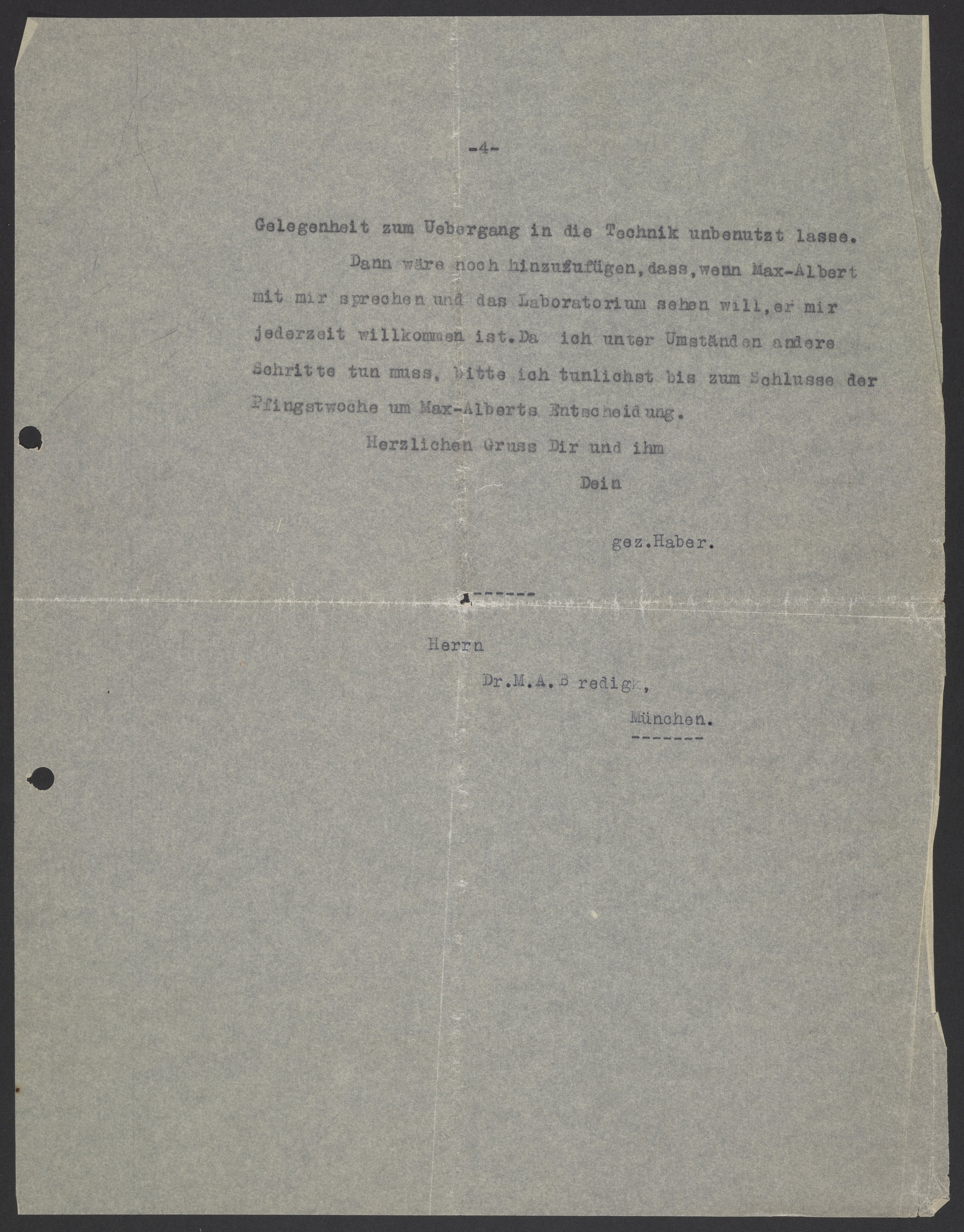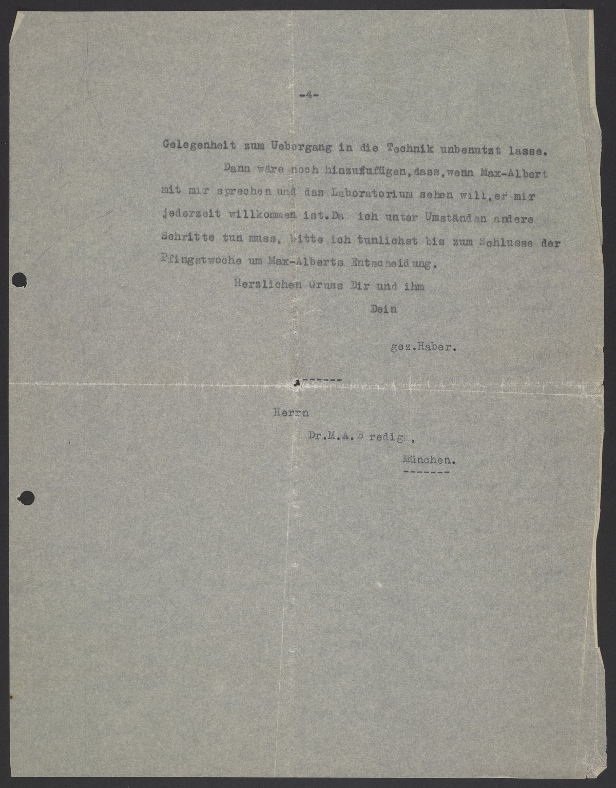 Small JPG1200 x 1541px — 340 KBLarge JPG2880 x 3698px — 2.1 MBFull-sized JPG5493 x 7053px — 6.9 MBOriginal fileTIFF — 5493 x 7053px — 111 MBFritz Haber (1868-1934), a German chemist who received the Nobel Prize in Chemistry in 1918 for his invention of the Haber–Bosch process, informs his friend and colleague, Georg Bredig (1868-1944), that he would like offer Georg's son, Max Bredig (1902-1977), a position at his institute as an X-ray assistant.