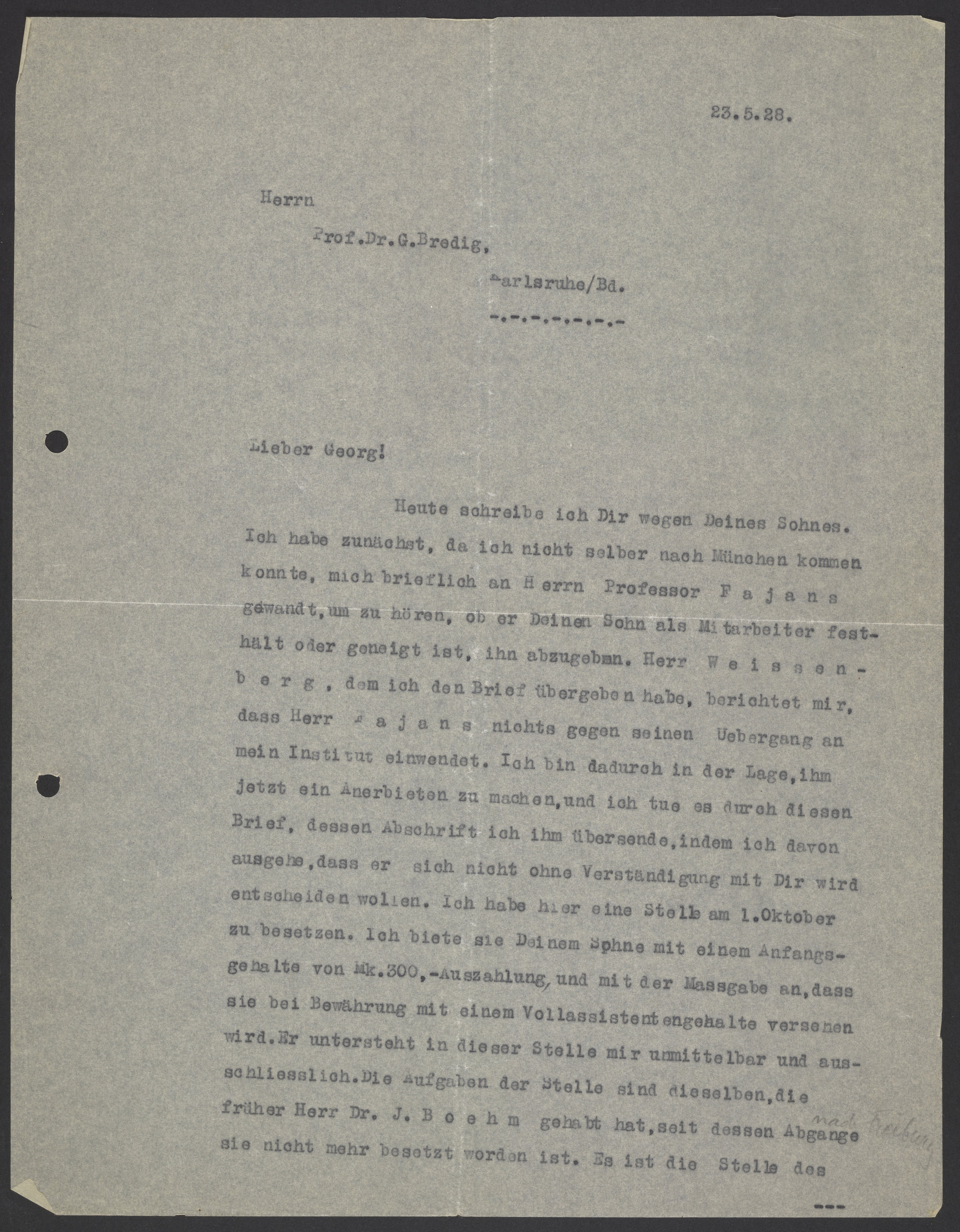 Heute schreibe ich Dir wegen Deines Sohnes. Ich habe zunächst, da ich nicht selber nach München kommen konnte, mich brieflich and Herrn Professor Fajans gewandt, um zu hören, ob er Deinen Sohn als Mitarbeiter festhält oder geneigt ist, ihn abzugeben. Herr Weissenberg, dem ich den Brief übergeben habe, berichtet mir, dass Herr Fajans nicht gegen seinen Übergang an mein Institut einwendet. Ich bin dadurch in der Lage, ihm jetzt ein Anerbieten zu machen, und ich tue es durch diesen Brief, dessen Abschrift ich ihn übersende, indem ich davon ausgehe, dass er sich nicht ohne Verständigung mit Dir wird entscheiden wollen. Ich habe hier eine Stelle am 1. Oktober zu besetzen. Ich biete sie Deinem Sohne mit einem Anfangsgehalte von Mk. 300., - Auszahlung und mit der Massgabe an, dass sie bei der Bewährung mit einem Vollassistentengehalte versehen wird. Er untersteht in dieser Stelle mir unmittelbar und ausschliesslich. Die Aufgabe der Stelle sind dieselben, die früher Herr Dr. J. Boehm gehabt hat., seit dessen Abgang nach Duisburg sie nicht mehr besetzt worden ist. Es ist die Stelle des