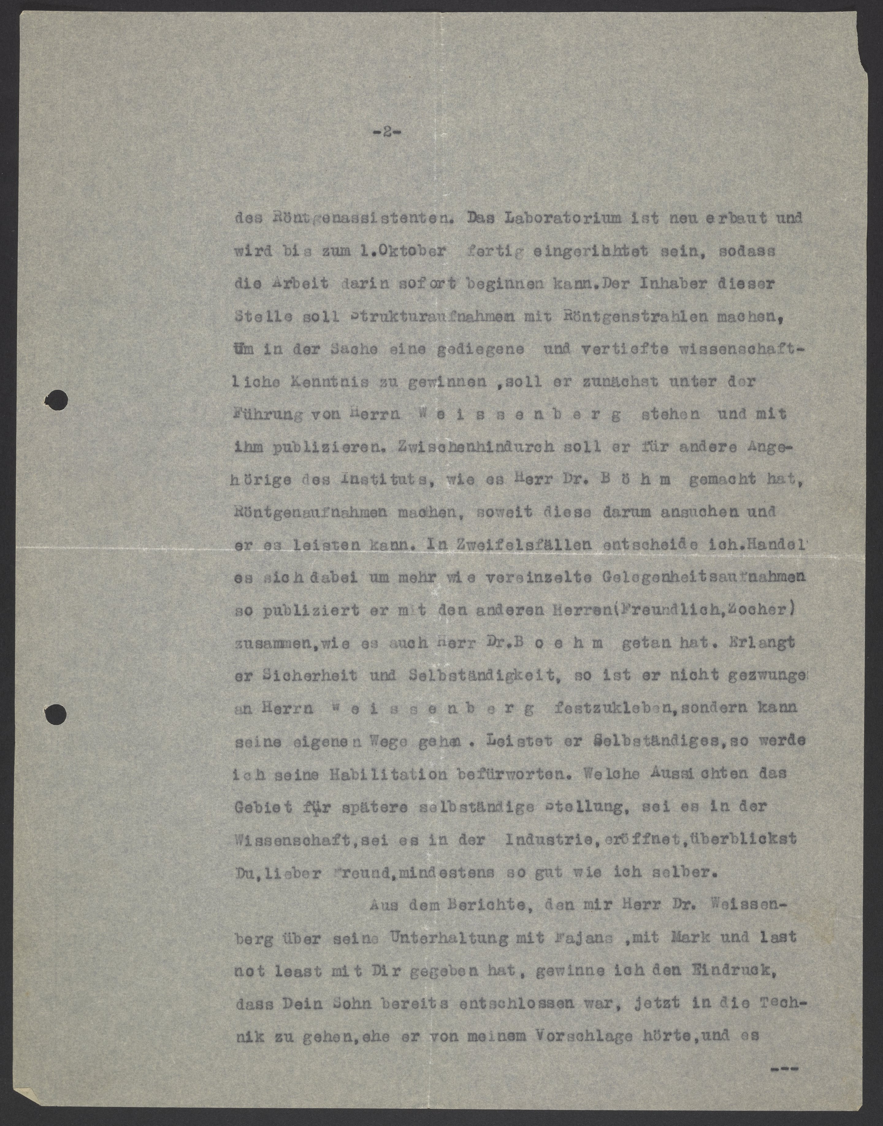 X-ray assistant. The laboratory is newly built and will be fully furnished by October 1st so that work can begin immediately. The occupant of this position should take structural photographs with X-rays. To gain solid and in-depth scientific knowledge of the subject, he should initially be under the guidance of Mr. Weissenberg and publish with him. Occasionally and as time permits, he would take X-rays for other members of the institute, as Dr. Böhm did. If in doubt, I would decide. If it is a question of more than singular X-rays, he would publish together with the other gentlemen (Freundlich, Zocher), as Dr. Böhm did. If he becomes secure and independent in the position, he will not be forced to cling to Mr. Weissenberg, but forge his own path. If he works independently, I will support his habilitation. You, my dear friend, are just as familiar as I am with the opportunities this field opens up for independent positions in the future, be it in science or in industry.