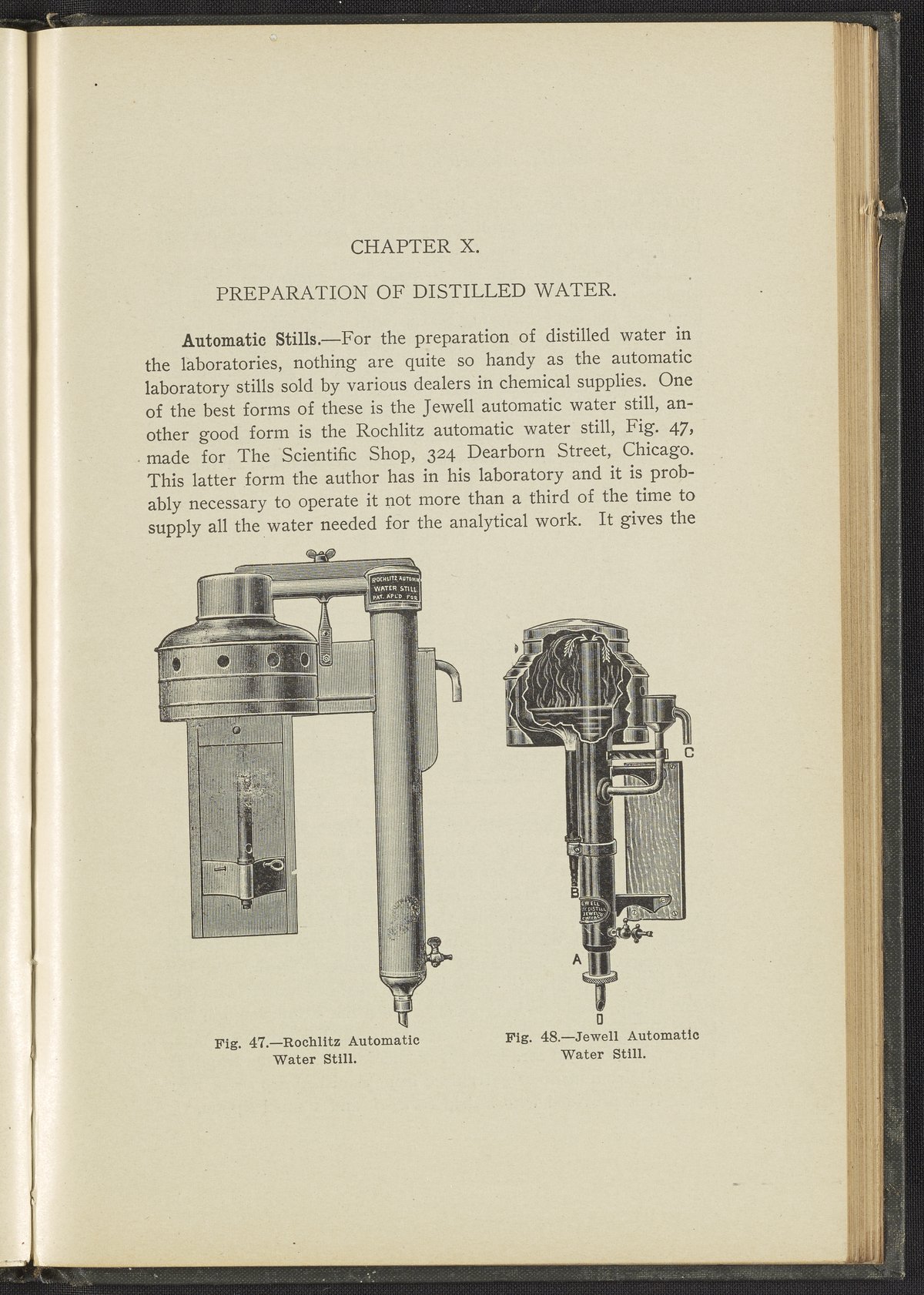 Meade, Richard K. (Richard Kidder). “Fig. 47: Rochlitz Automatic Water Still; Fig. 48: Jewell Automatic Water Still.” The Design and Equipment of Small Chemical Laboratories. Chicago, Illinois: The Chemical Engineer Publishing Co., 1908. QD51 .M43 1908. Science History Institute. Philadelphia. https://digital.sciencehistory.org/works/kupjcfr.