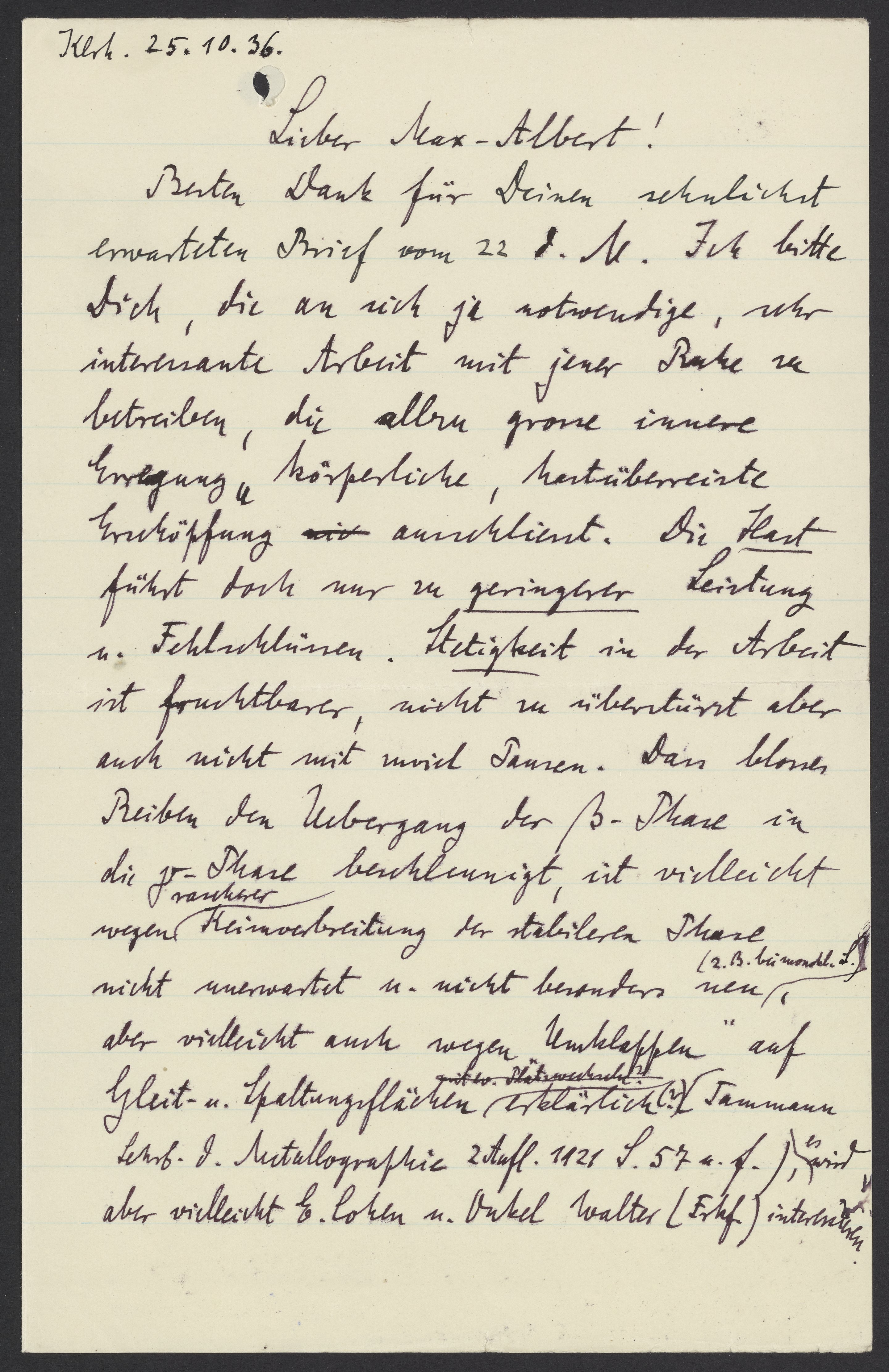 Besten Dank für Deinen sehnlichst erwarteten Brief vom 22 d. M. Ich bitte Dich, die an sich ja notwendige, sehr interessante Arbeit mit jener Ruhe zu betreiben, die allzu grosse innere Erregung u. körperliche, hartüberreizte Erschöpfung ausschliesst. Die Hast führt nur zu geringer Leistung u. Fehlschlüssen. Stetigkeit in der Arbeit ist fruchtbarer, nicht zu überstürzt aber auch nicht mit zuviel Pausen. Dass blosser Reiben den Uebergang der β-Phase nicht unerwartet u. nicht besonders neu (z.B bei monatl. S.), aber vielleicht auch wegen „Umklappen“ auf Gleit - .u. Spaltungsflächer ist erklärlich (?) (Tammann, Lehrb. d. Metallographie 2 Aufl. 1921 S. 57 u.f.), es wird aber vielleicht E. Cohen u. Onkel Walter (Frkf) interessieren.