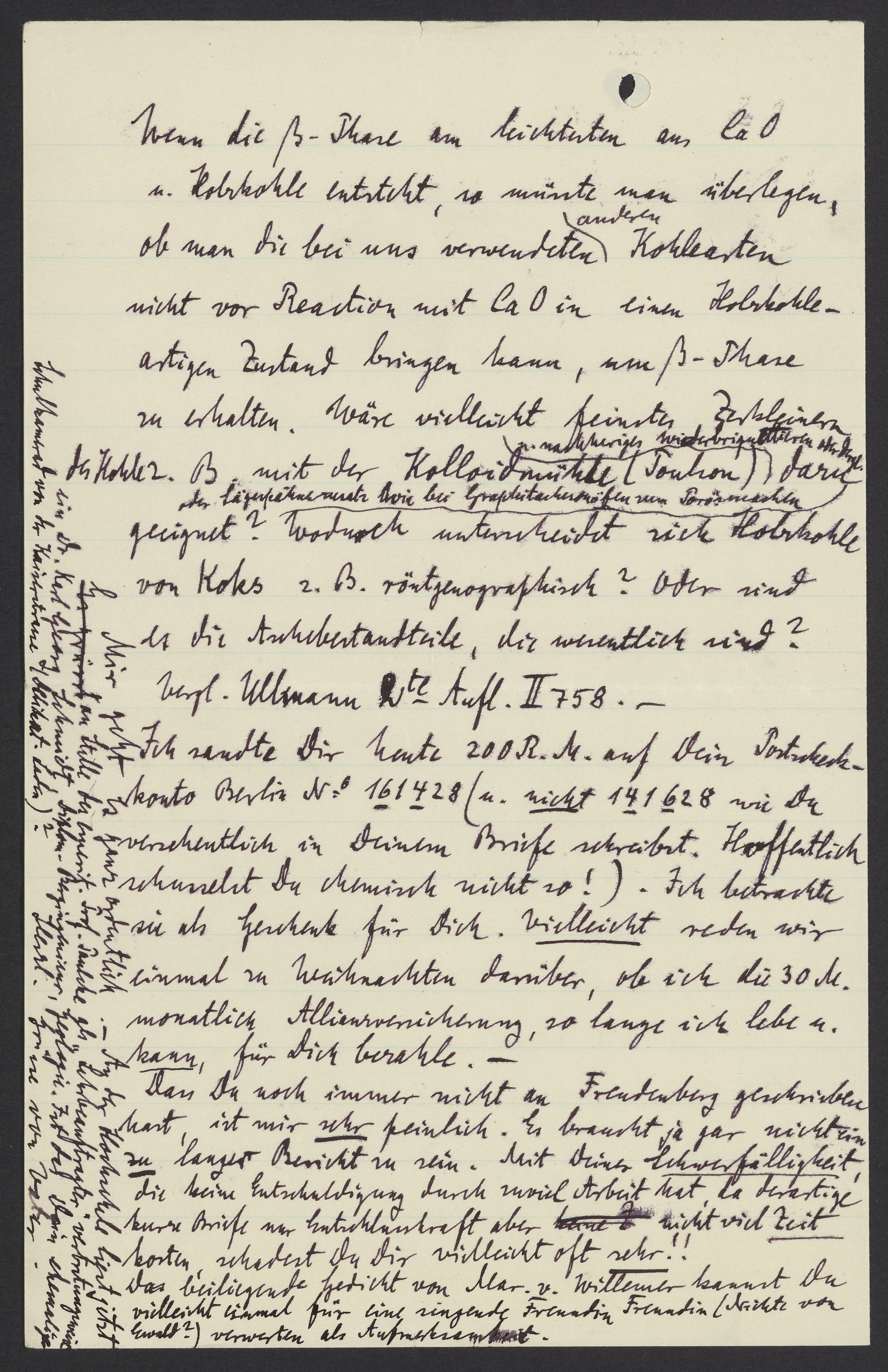Ich sandte Dir heute 200 R.M. auf Dein Postscheckkonto Berlin No. 161428 (u. nicht 141628 wie Du versehentlich in Deinem Briefe schreibst. Hoffentlich schusselst Du chemisch nicht so!) Ich betrachte sie als Geschenk für Dich. Vielleicht reden wir einmal zu Weihnachten darüber, ob ich die 30 M. monatlich Allianzversicherung, so lange ich lebe u. kann, für Dich bezahle.