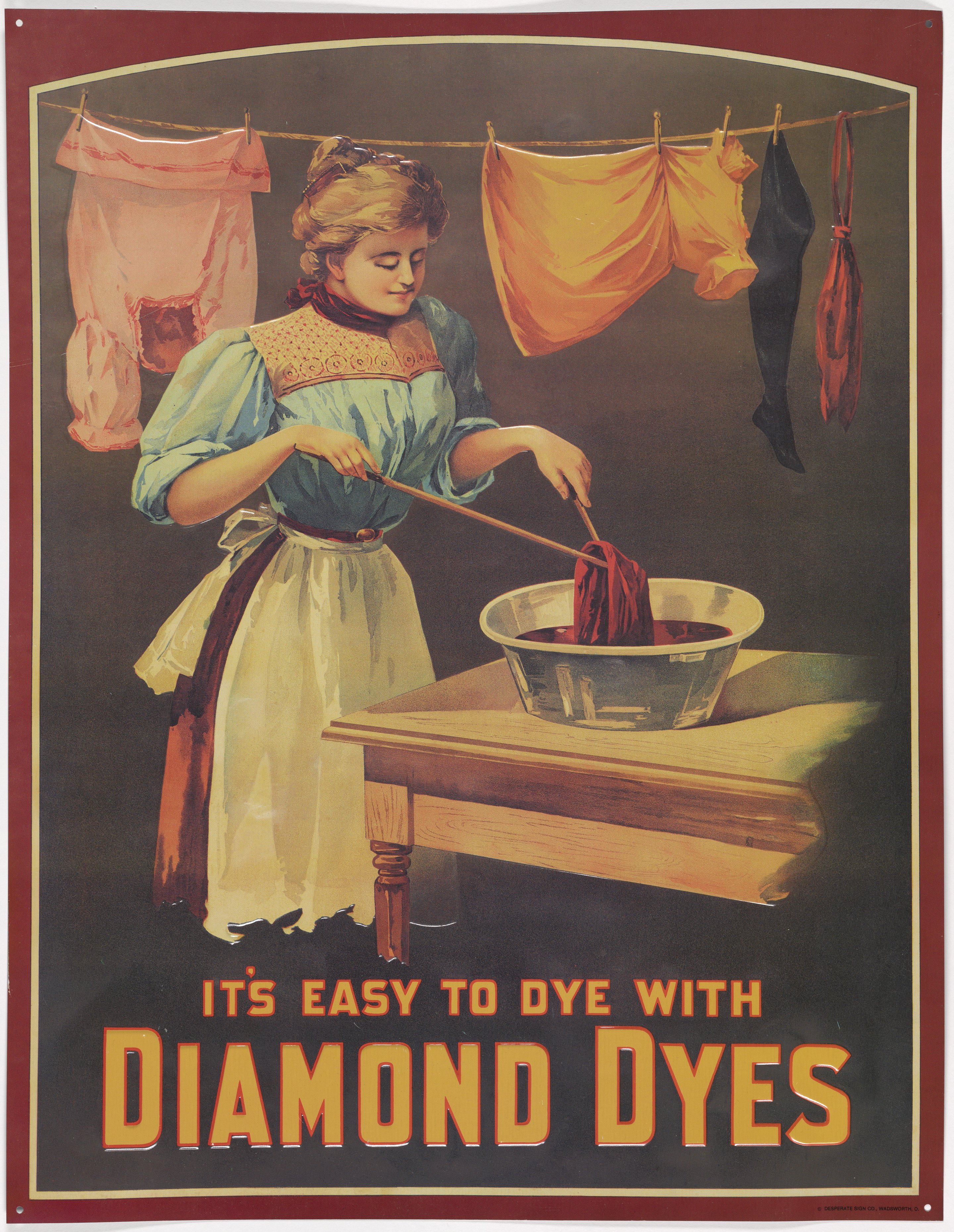“‘It's Easy to Dye with Diamond Dyes’ Tin Sign.” Tin (metal), circa 2000. Science History Institute. Philadelphia. https://digital.sciencehistory.org/works/kw52j813n.