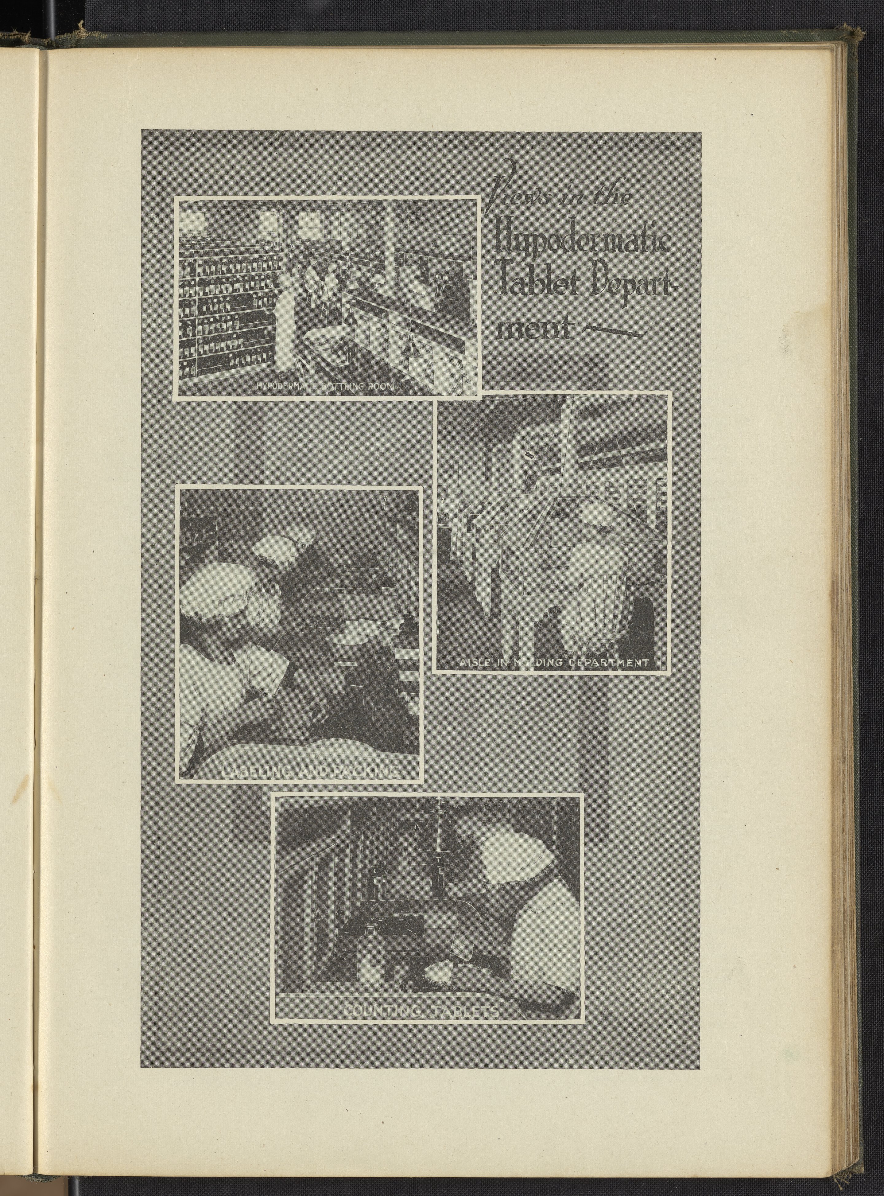 Four photographs of female workers in the hypodermatic bottling room; aisle in molding department, labeling and packing, and counting tablets. Hypodermatic tablets are compressed drugs designed to dissolve in water to become an injectable solution.