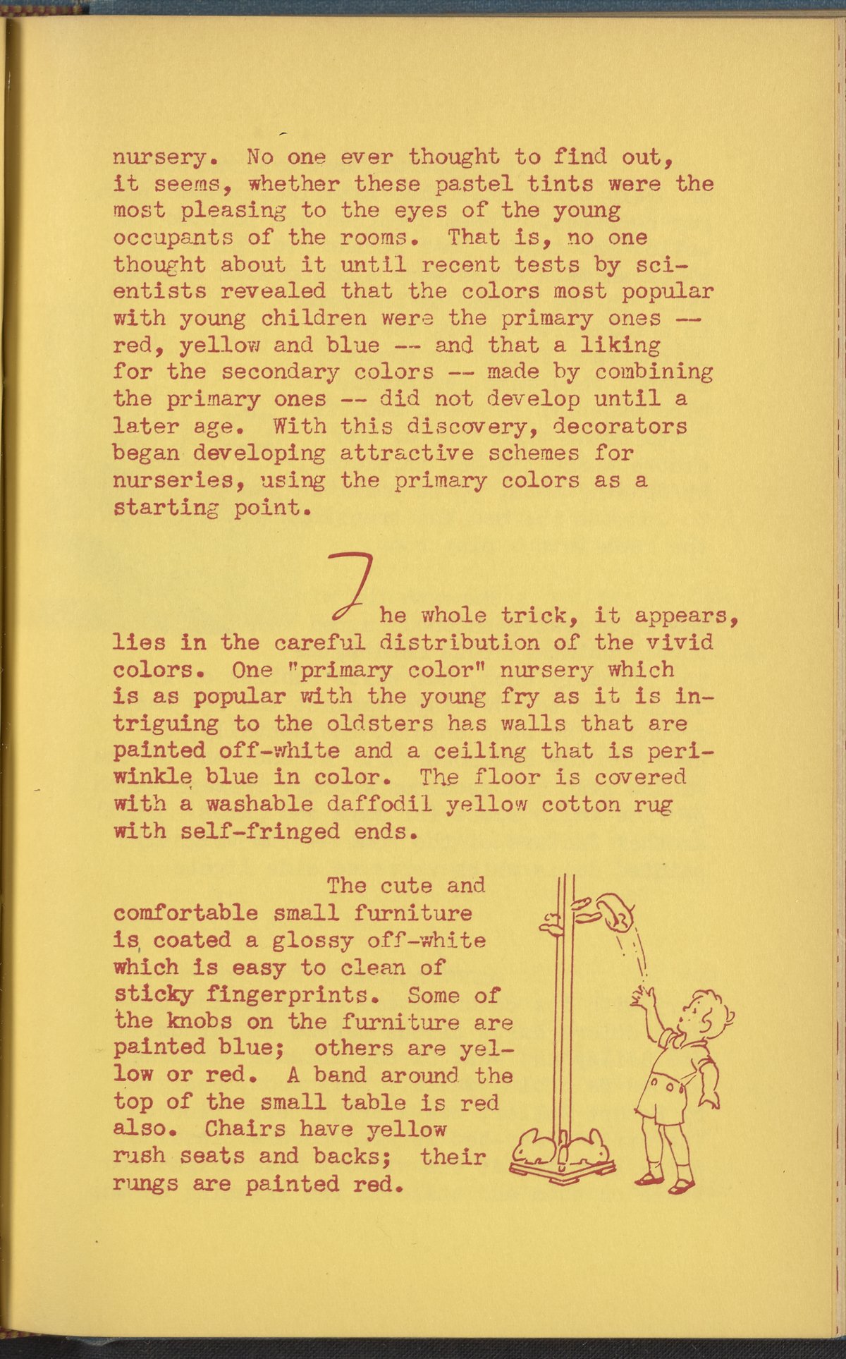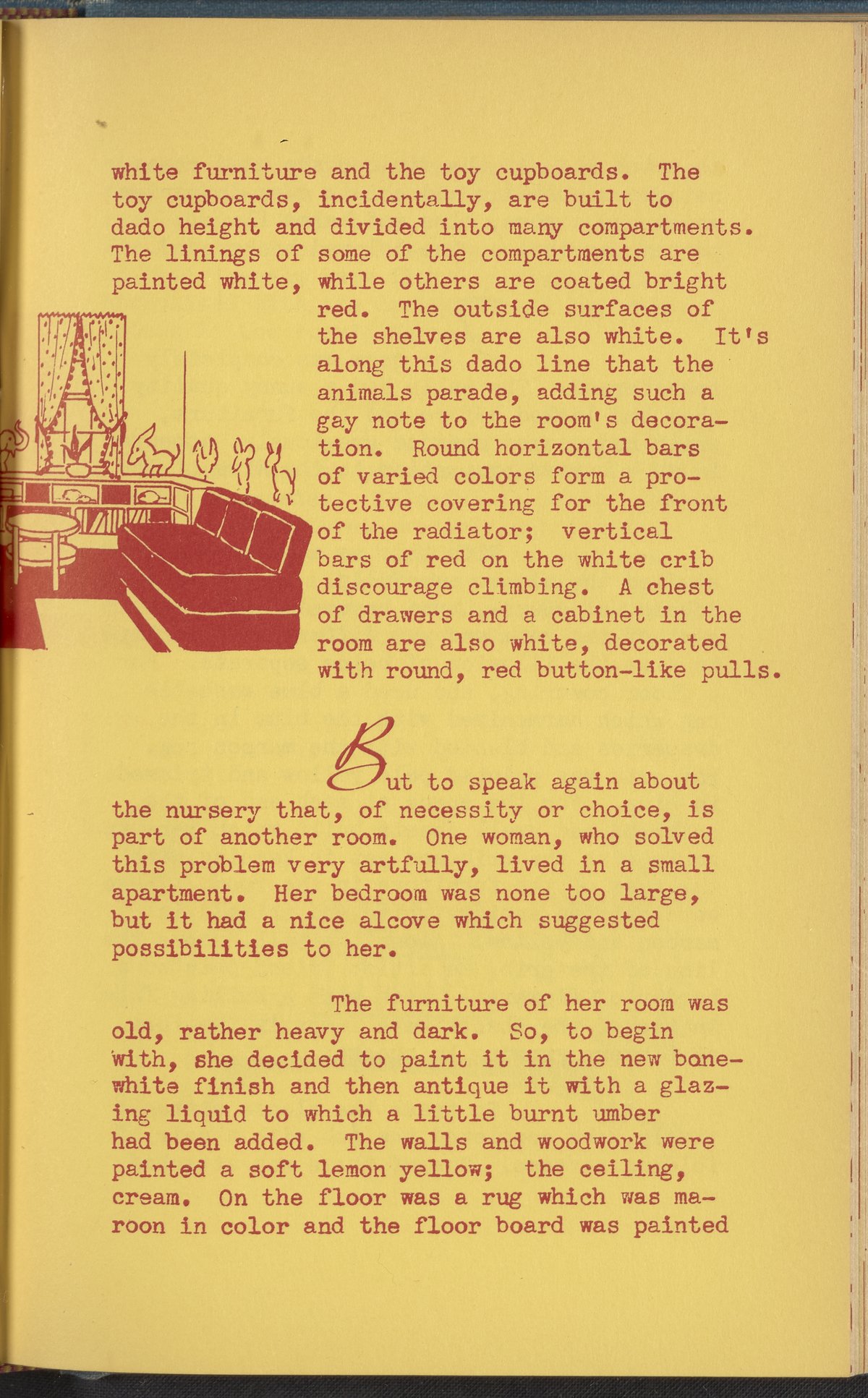 Booklet corresponding to a radio broadcast program created by the National Paint, Varnish, and Lacquer Association. The booklet provides instruction for decorating a child's nursery. Describes how young children prefer rooms decorated with primary color schemes, and describes several nurseries for inspiration. Includes small stylized illustrations throughout and decorated covers.