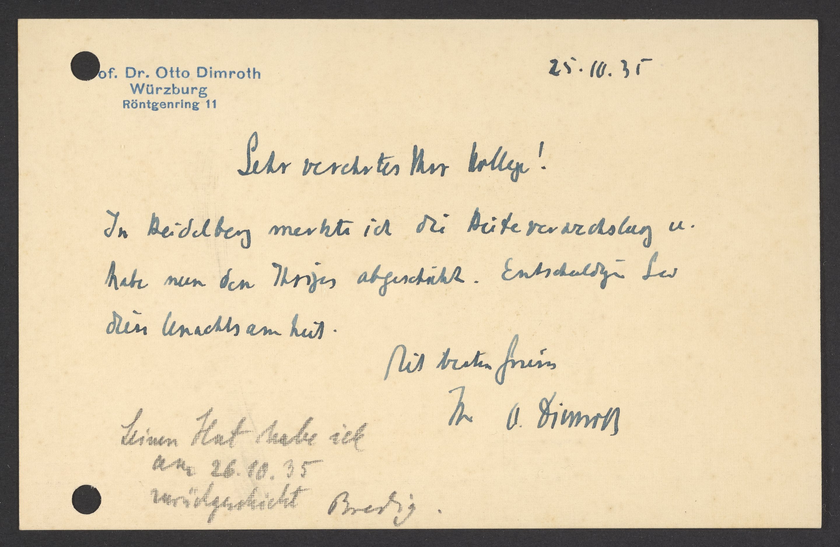 Postcard from Otto Dimroth to Georg Bredig, October 1935