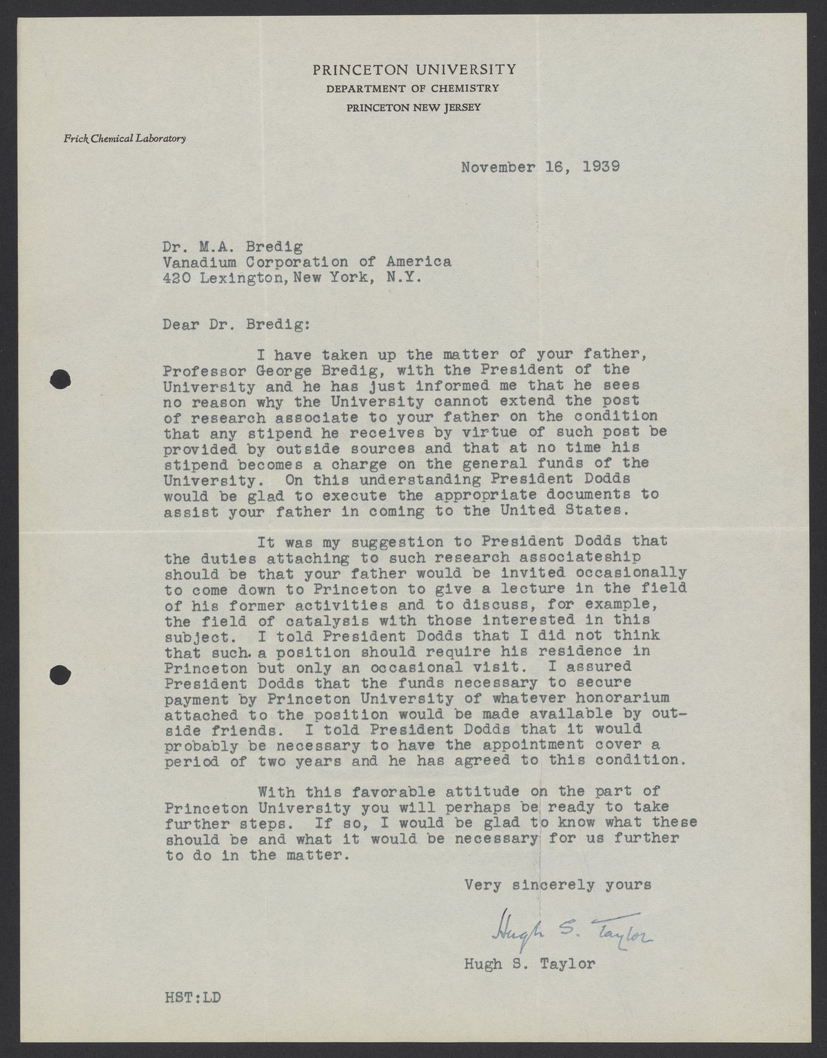 Hugh S. Taylor (1890-1974) informs Max Bredig (1902-1977) that the President of Princeton University, Harold Willis Dodds (1889-1980), believes Princeton may be able to offer Georg Bredig (1868-1944) a research associate position. This position would allow Georg to immigrate to the United States.