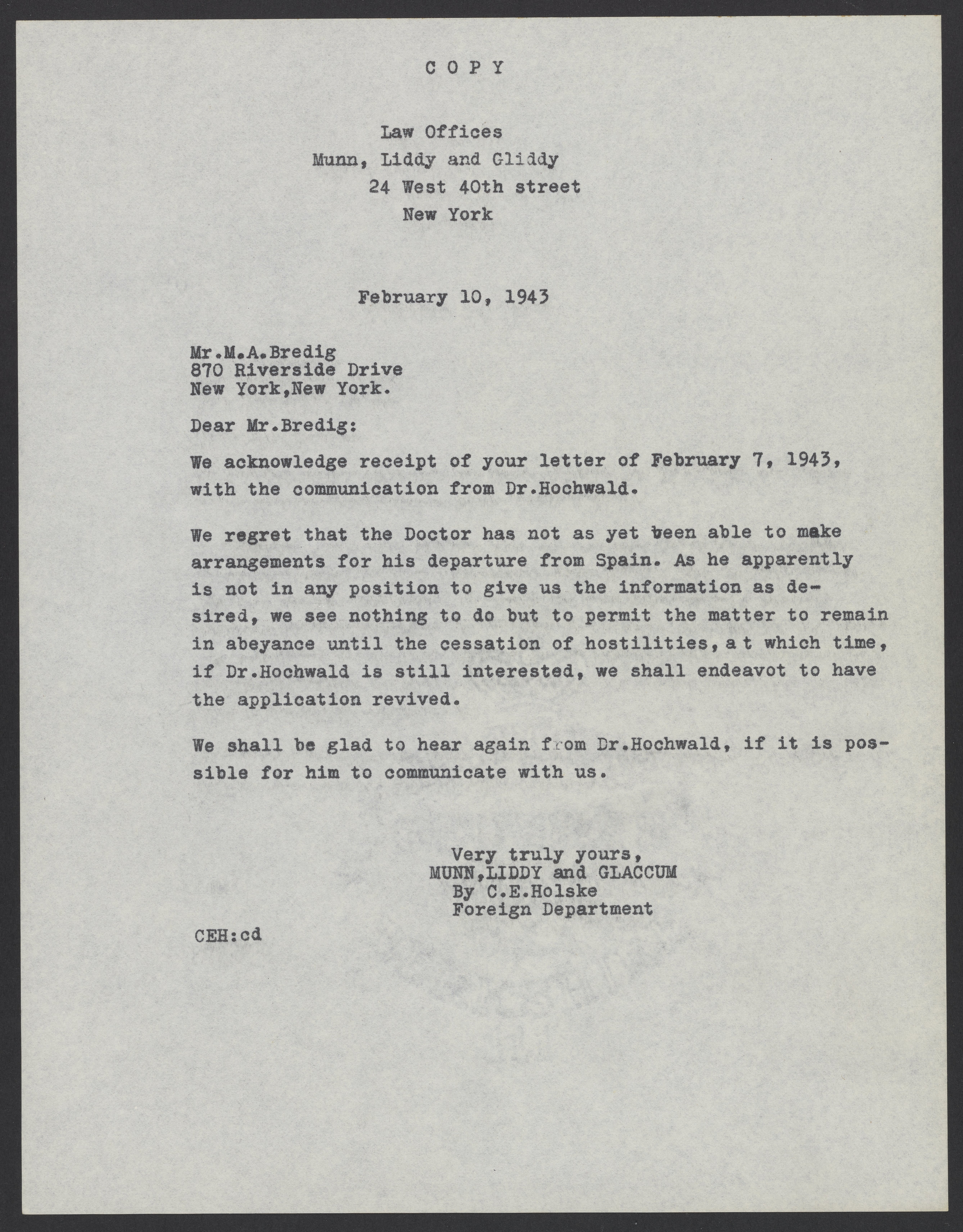 Letter from attorney Clarence Holske to Max Bredig (1902-1977) in which he expresses regret that Fritz Hochwald (1897-1969) has not been able to depart from Spain, where he had been interned in the Miranda de Ebro concentration camp. Holske informs Bredig that the revival of Hochwald's patent application will have to wait until Hochwald's situation has stabilized.