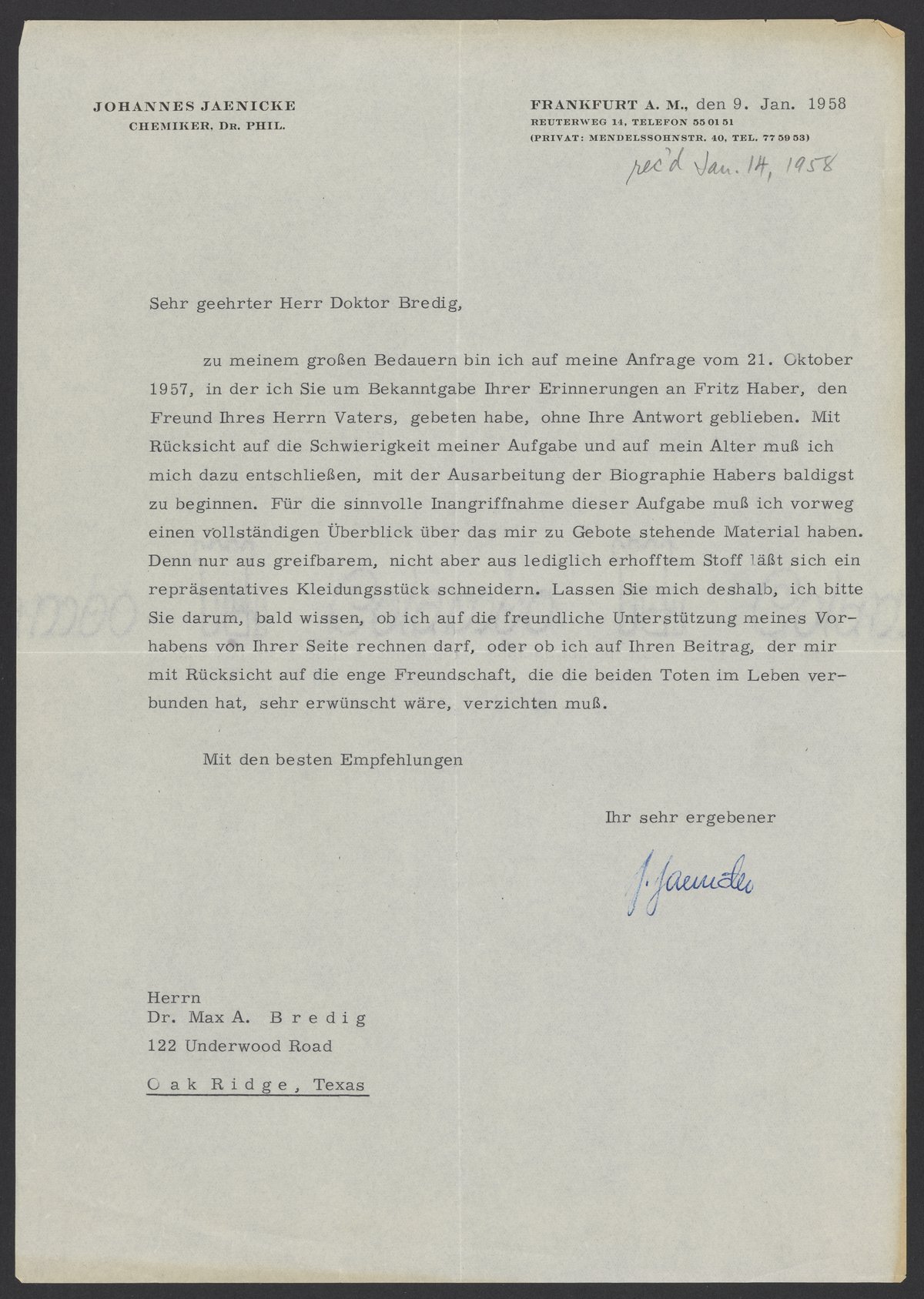Letter from Johannes Jaenicke to Max Bredig, January 9, 1958