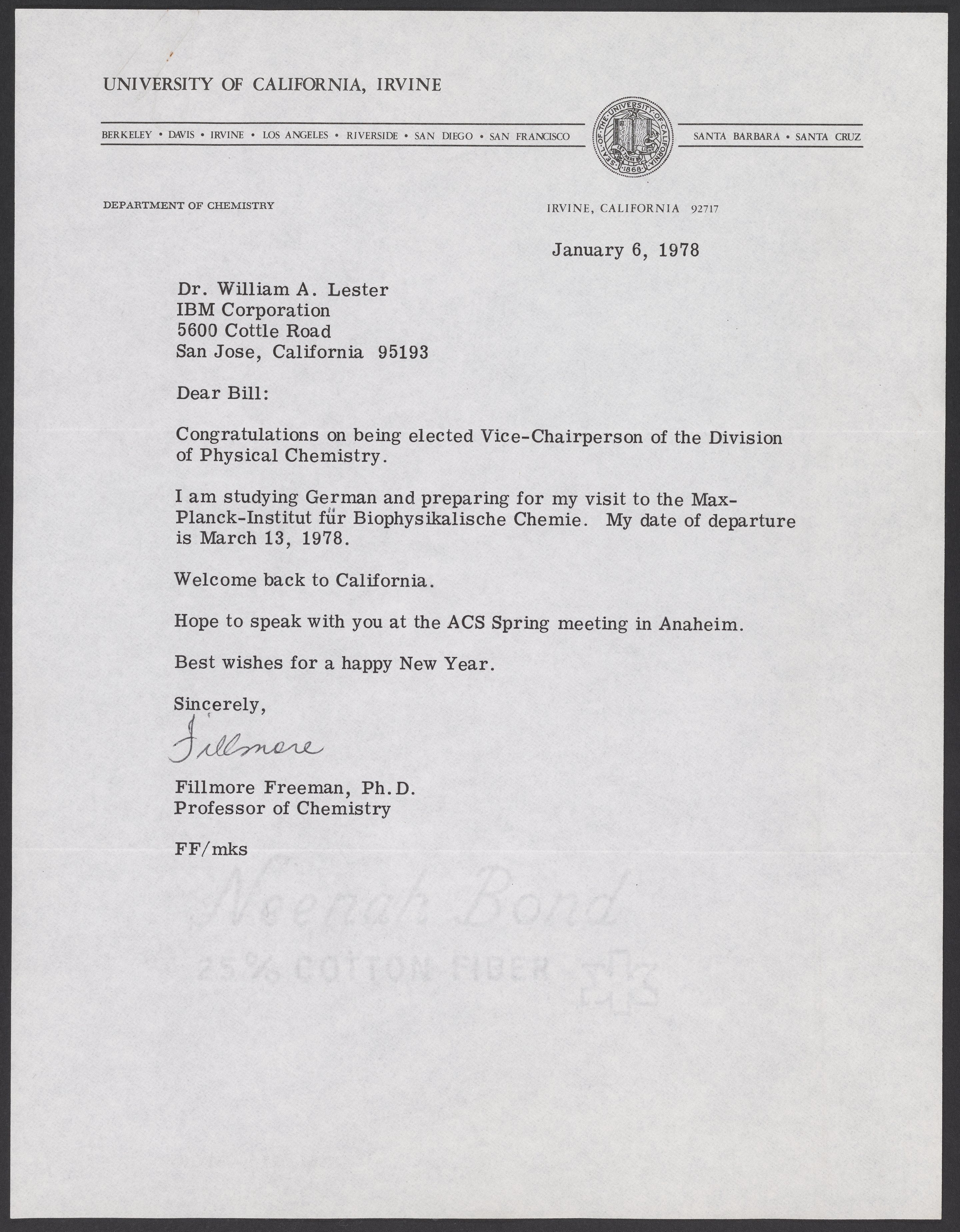Letter to William A. Lester, Jr. from Fillmore Freeman, January 6, 1978