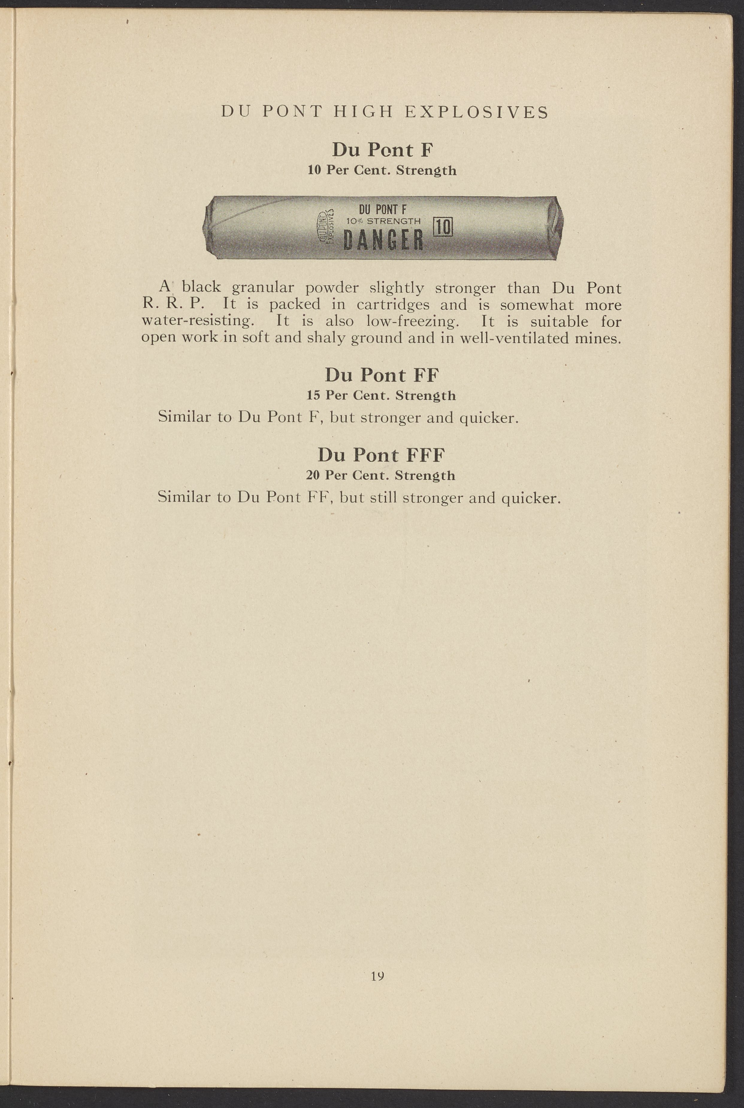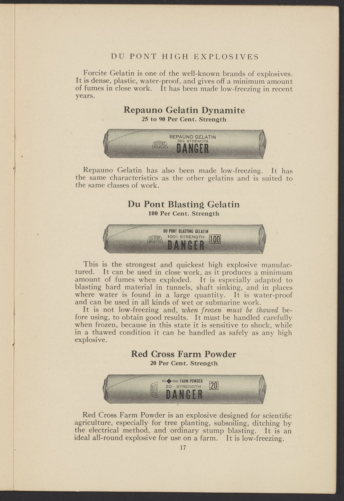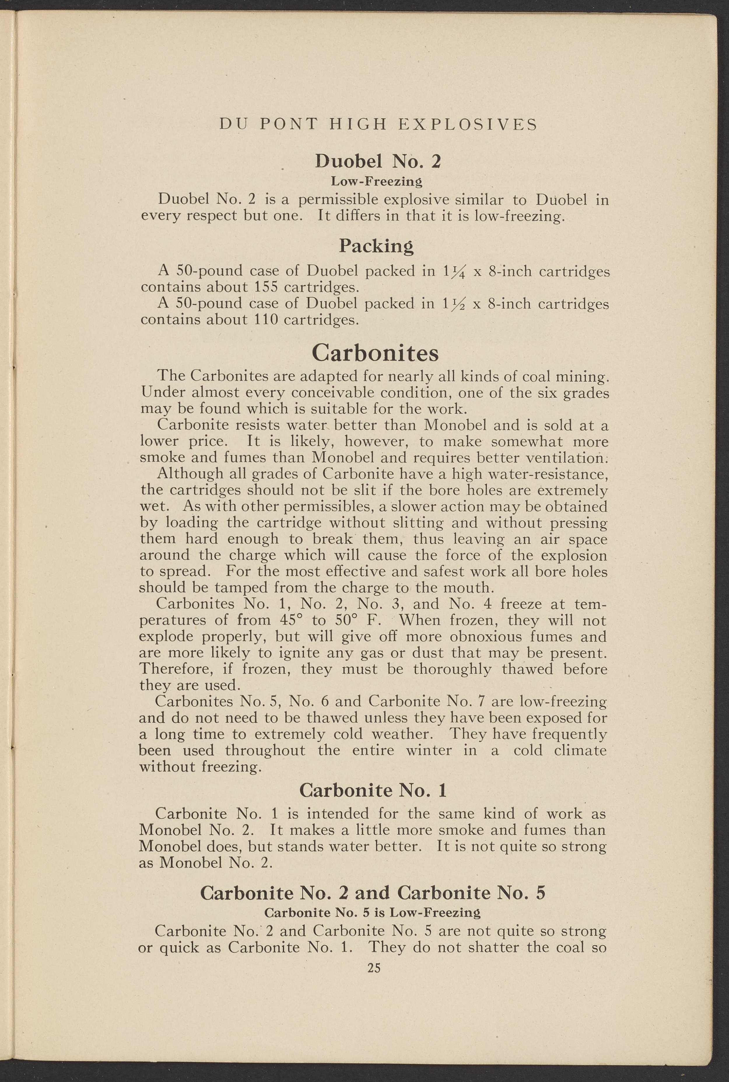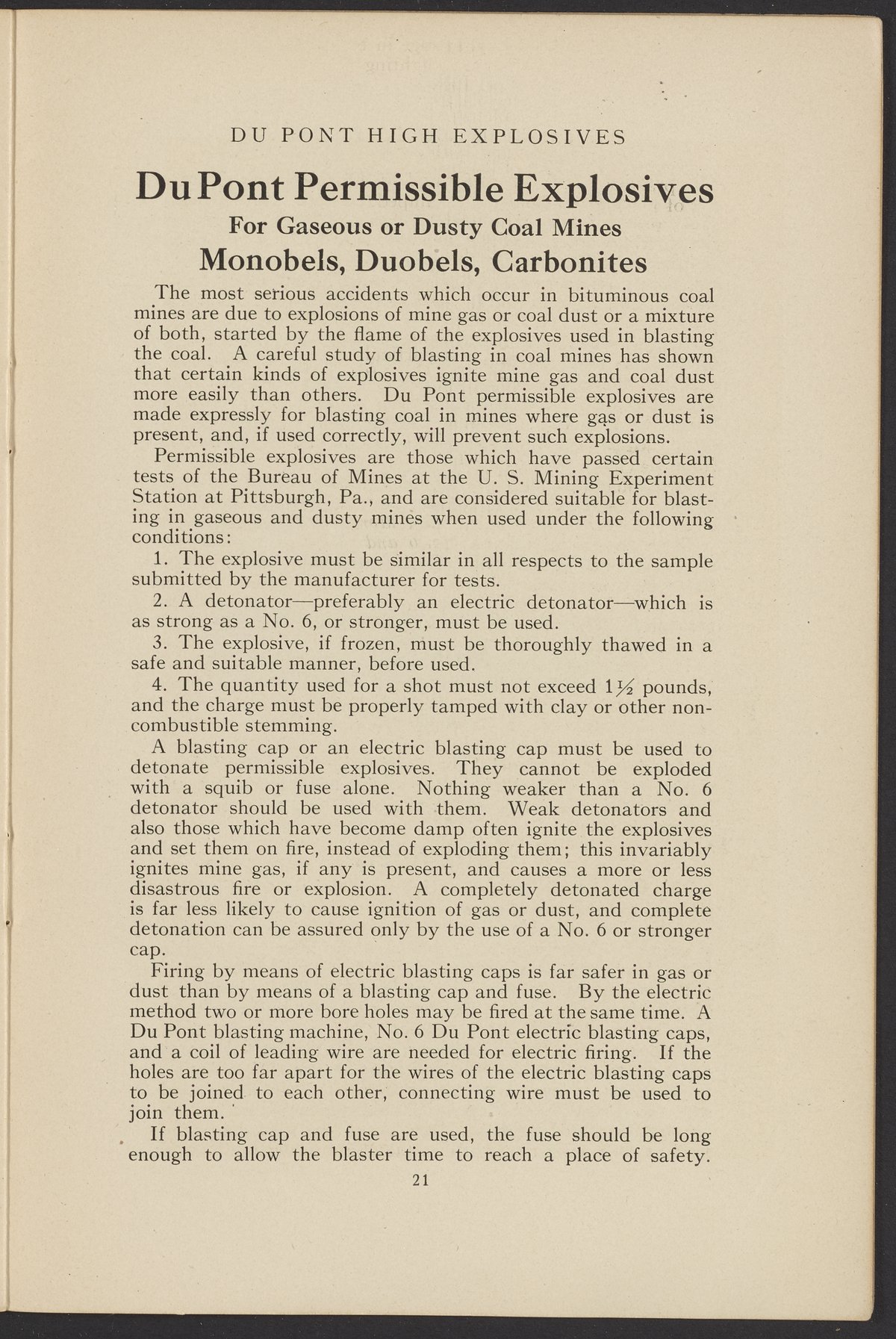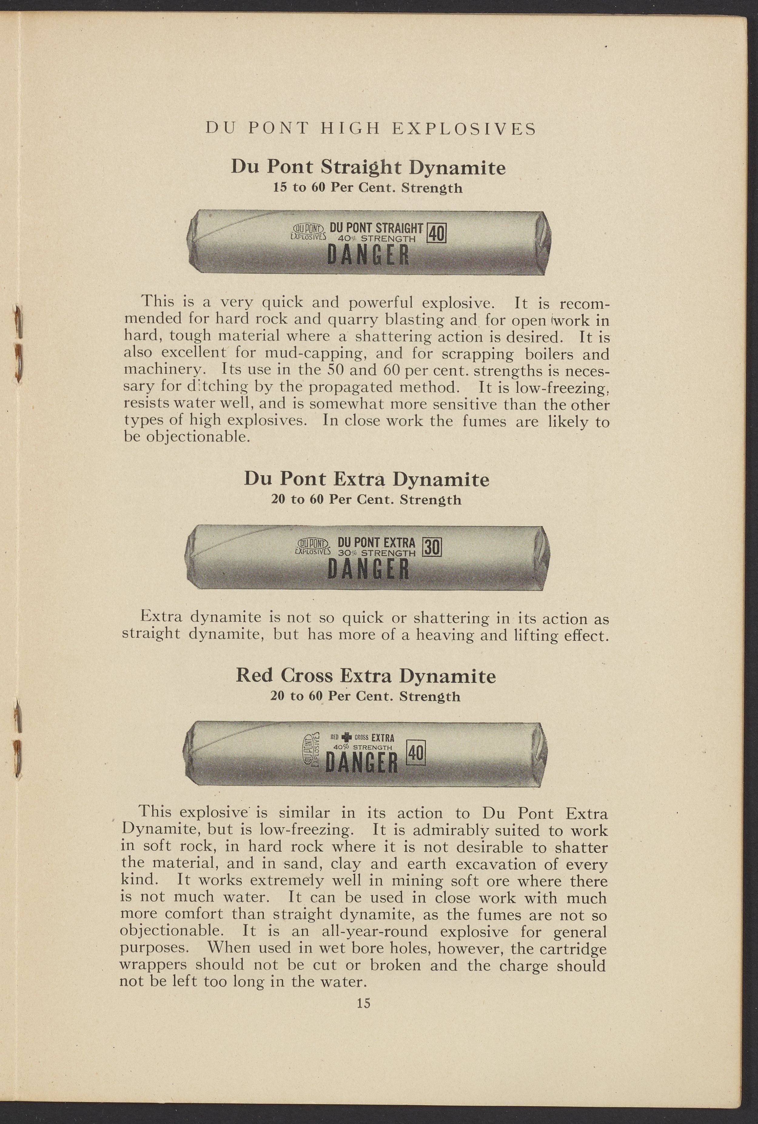 Small JPG1200 x 1774px — 392 KBFull-sized JPG2508 x 3708px — 1.5 MBOriginal fileTIFF — 2508 x 3708px — 26.7 MBCatalog advertising explosives manufactured and produced by the E.I. du Pont de Nemours & Company. Includes two sections, dynamite grade markings and monobels, duobels, and carbonites. Each provides discussion on the important properties of each product and their intended usage. Includes black and white engravings. Work is digitized in its entirety.