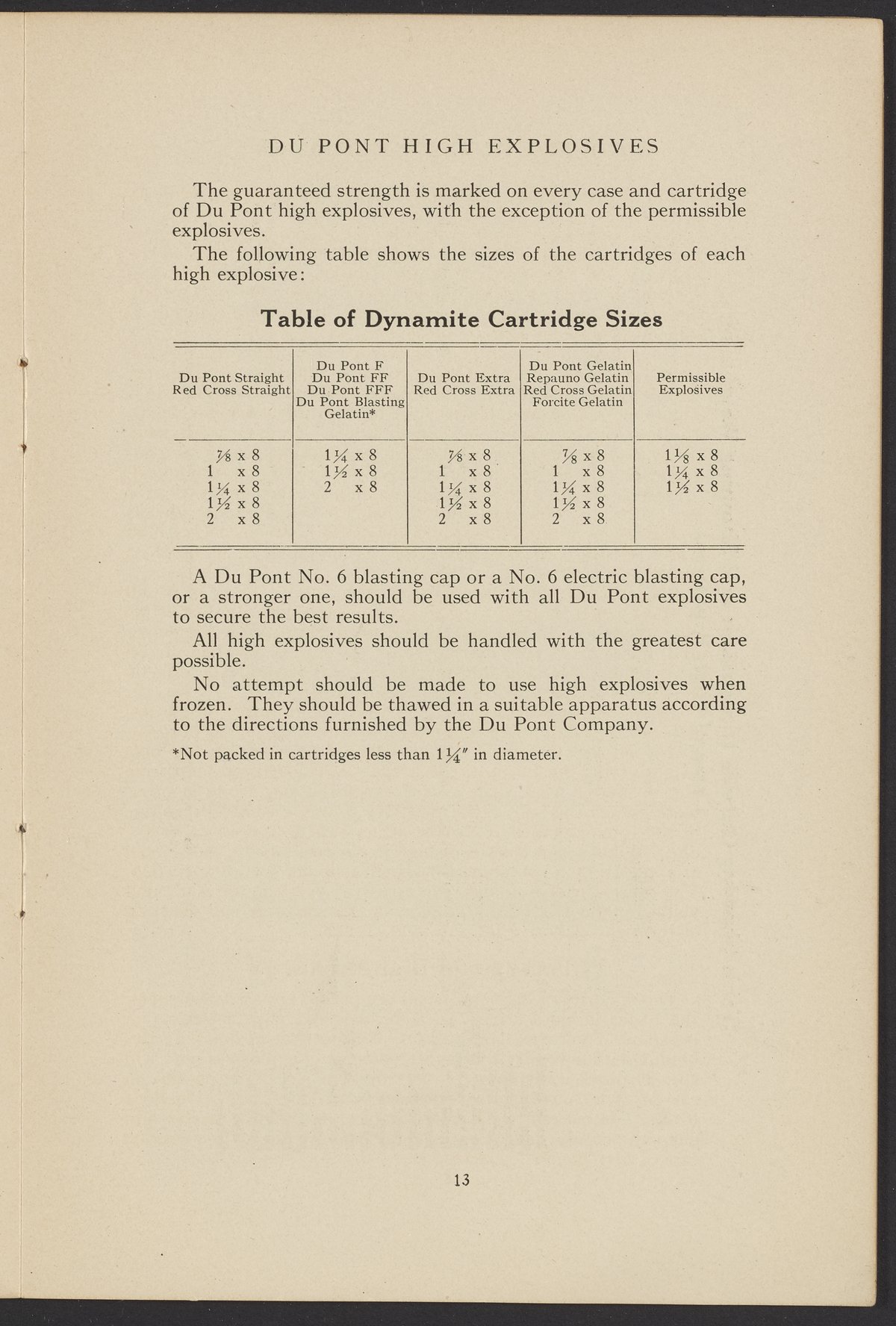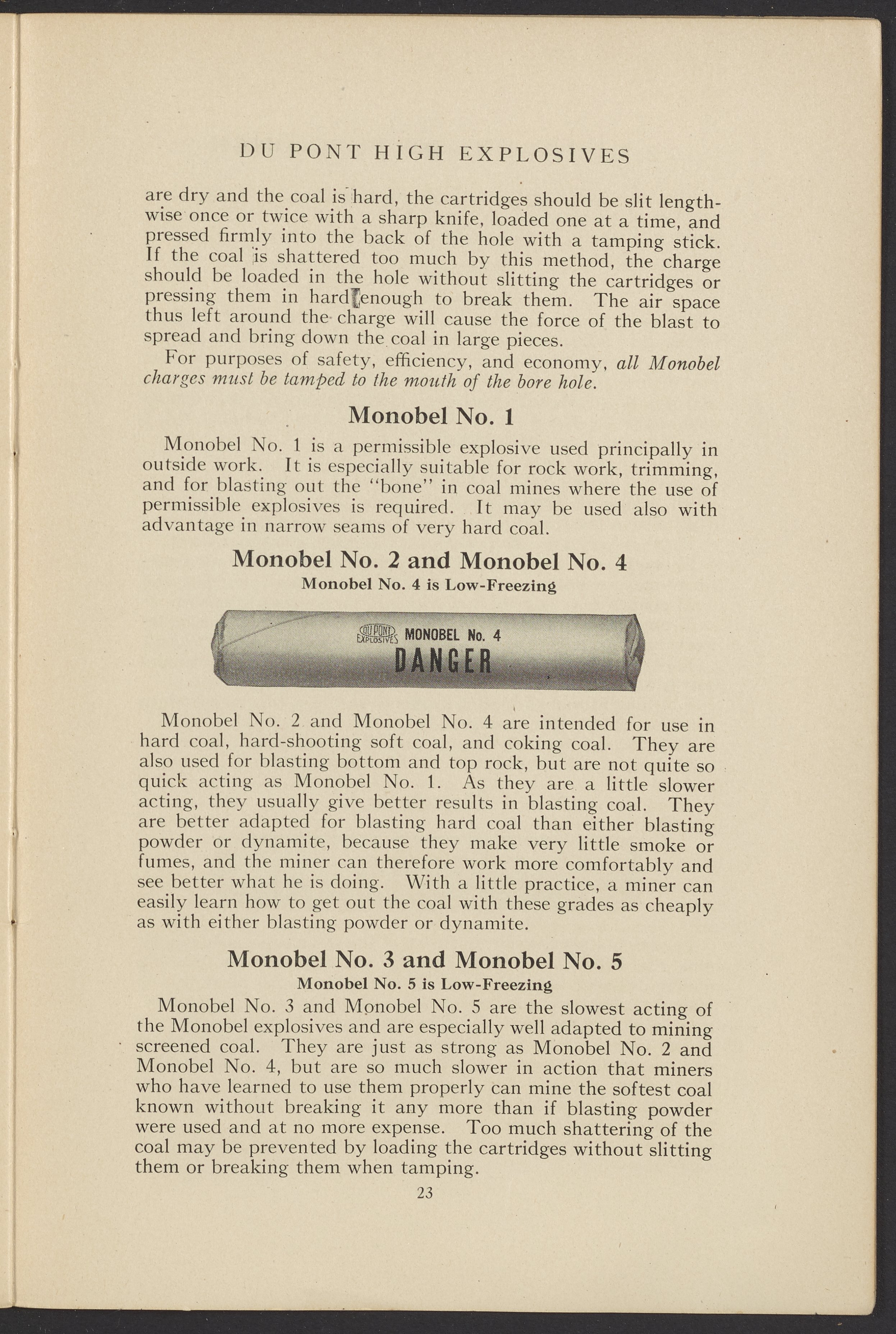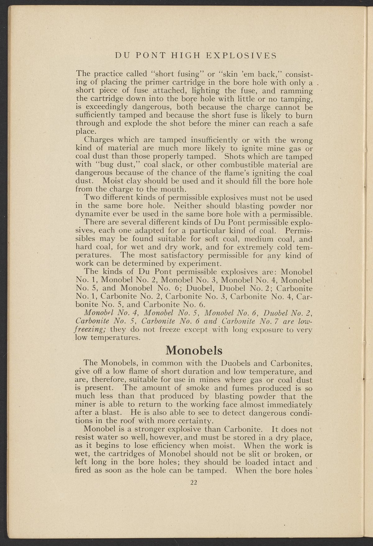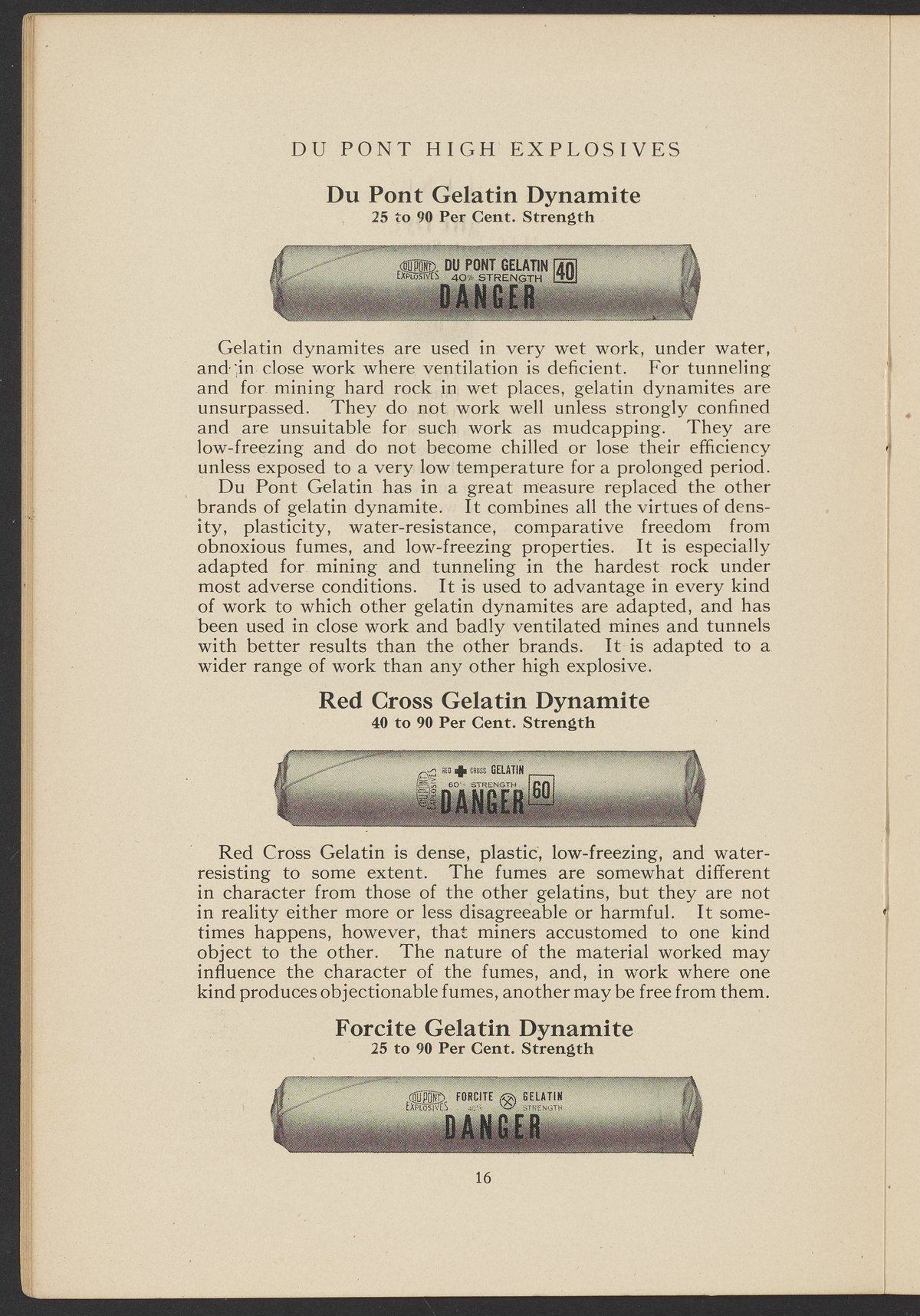 Small JPG1200 x 1774px — 392 KBFull-sized JPG2508 x 3708px — 1.5 MBOriginal fileTIFF — 2508 x 3708px — 26.7 MBCatalog advertising explosives manufactured and produced by the E.I. du Pont de Nemours & Company. Includes two sections, dynamite grade markings and monobels, duobels, and carbonites. Each provides discussion on the important properties of each product and their intended usage. Includes black and white engravings. Work is digitized in its entirety.