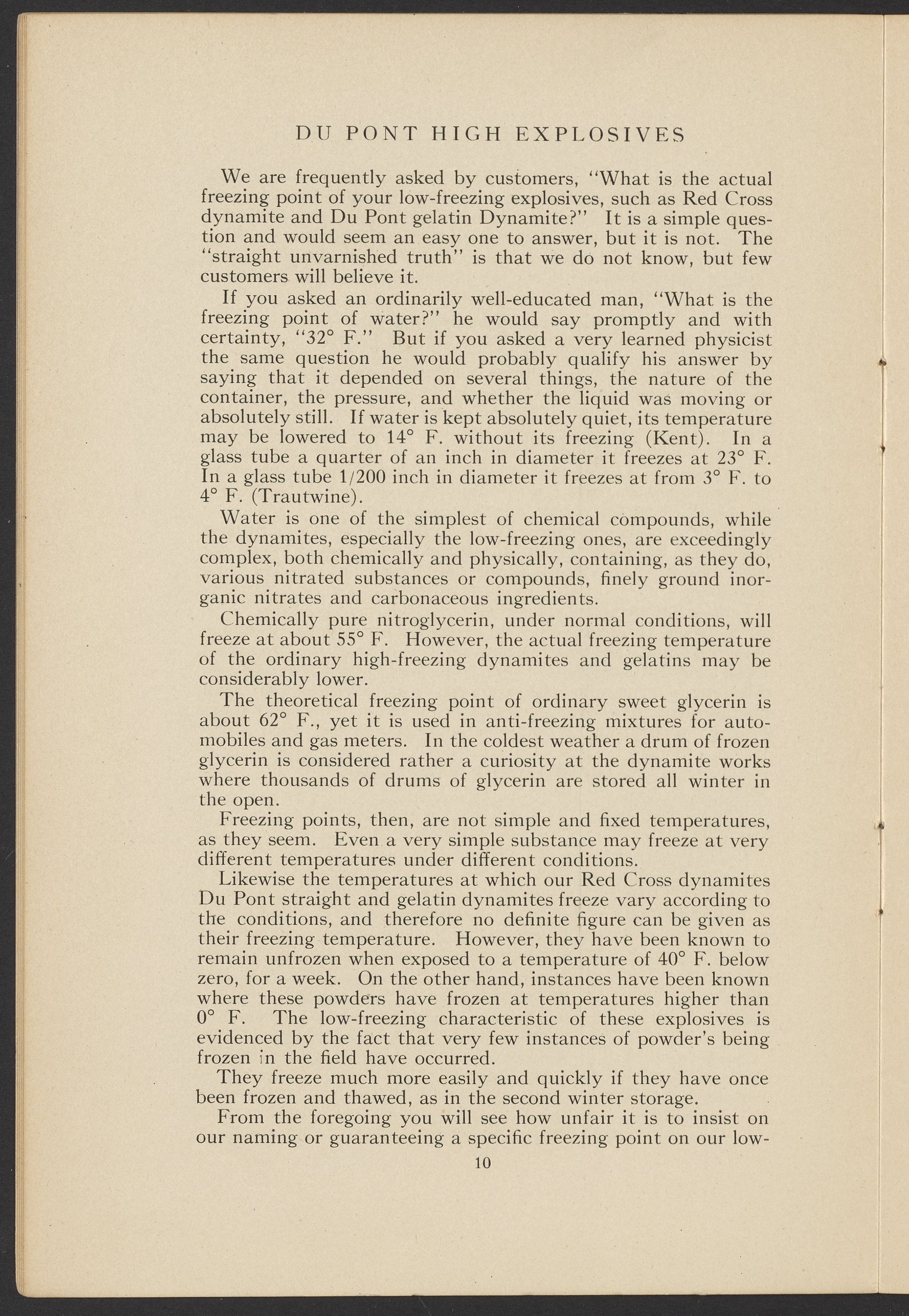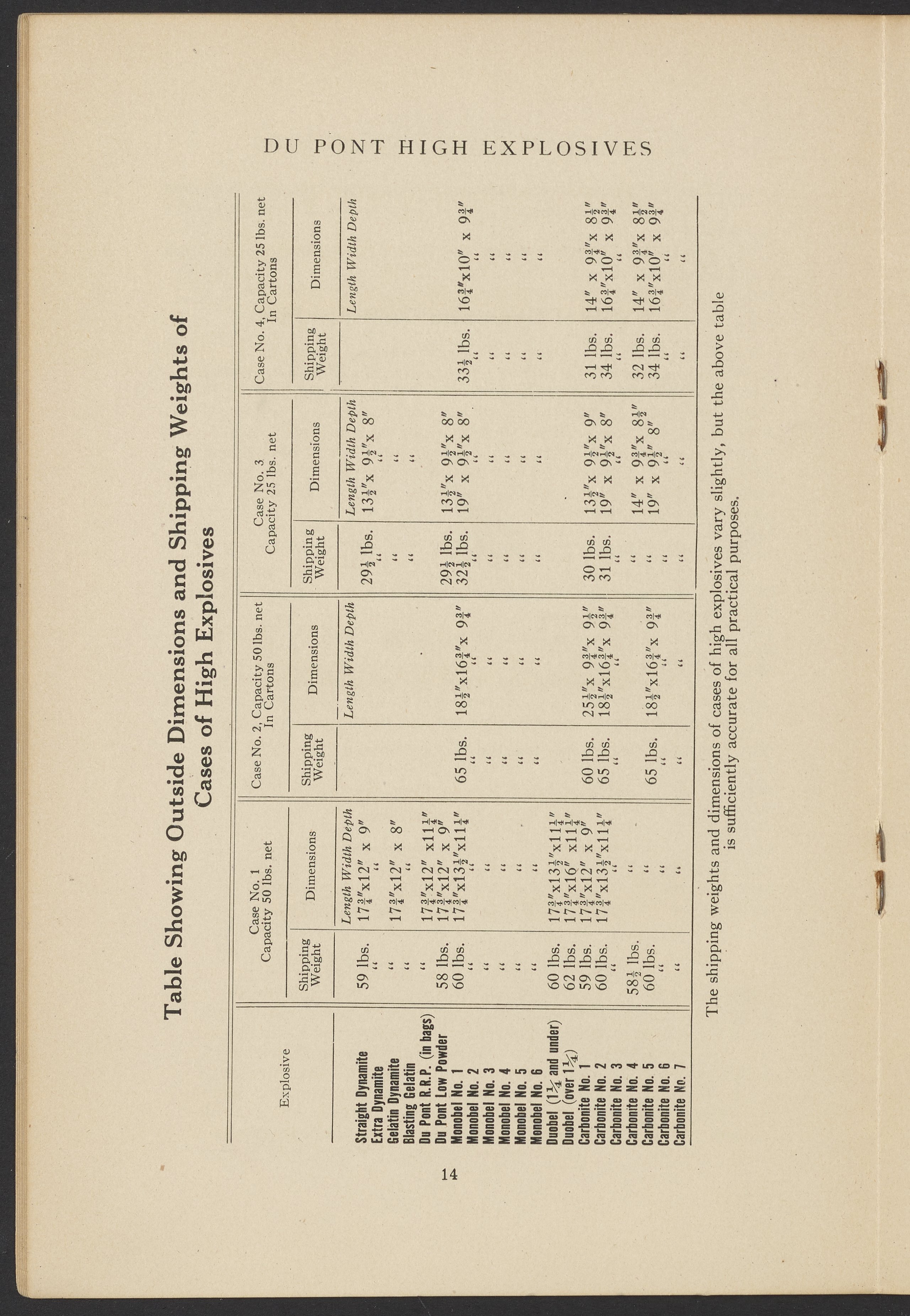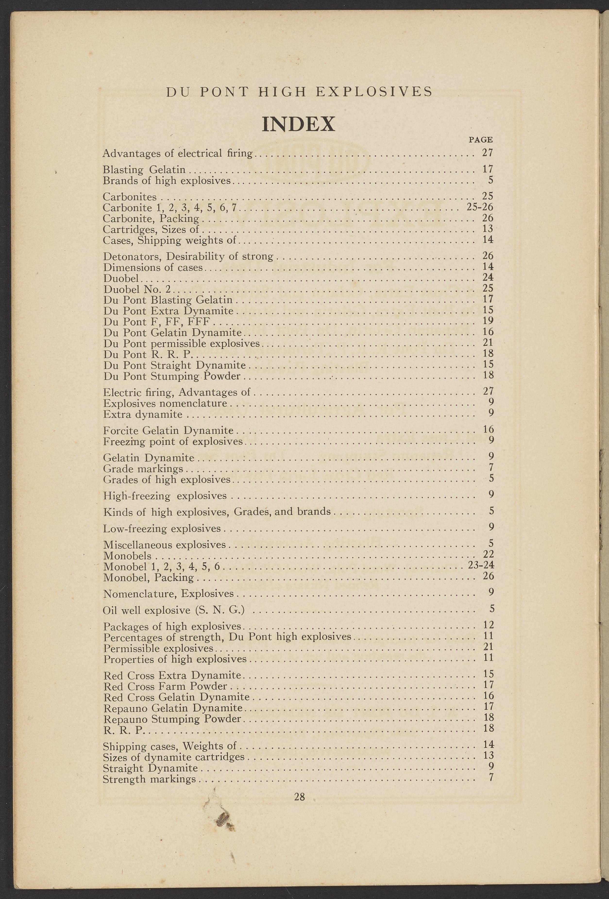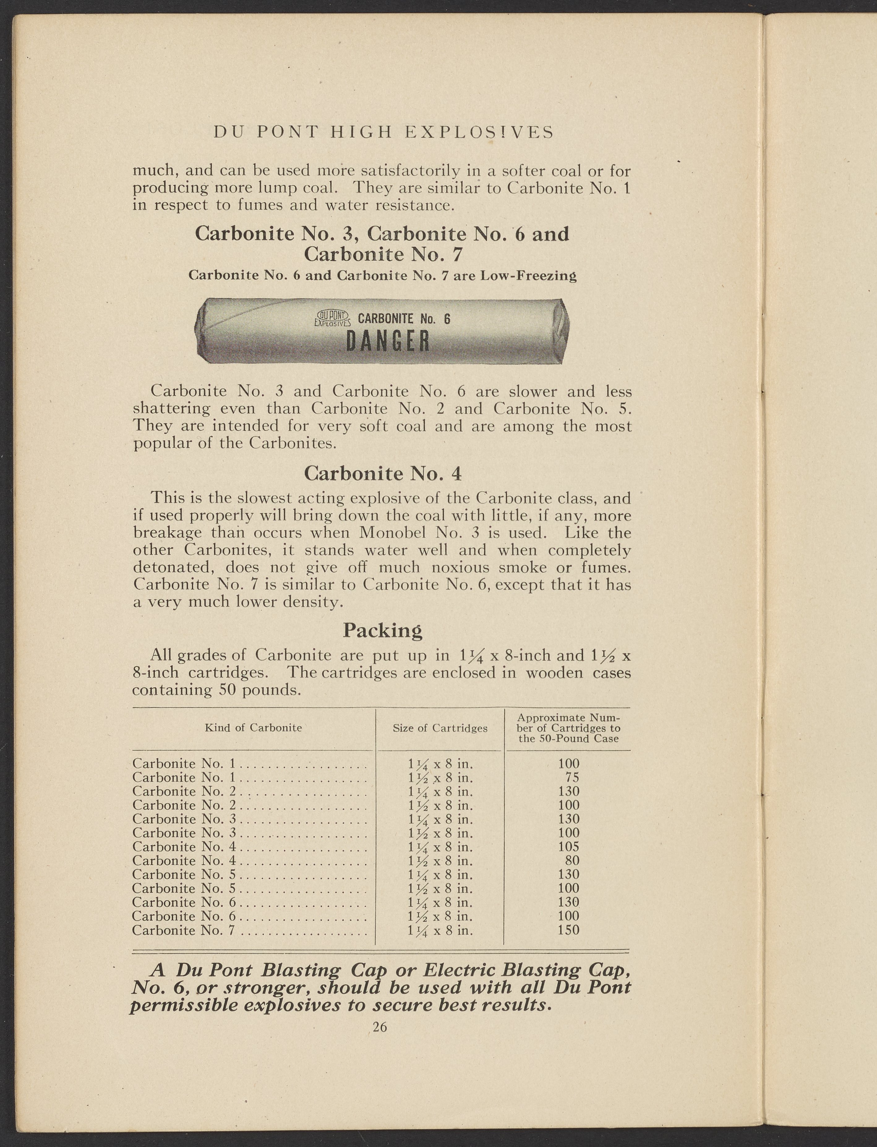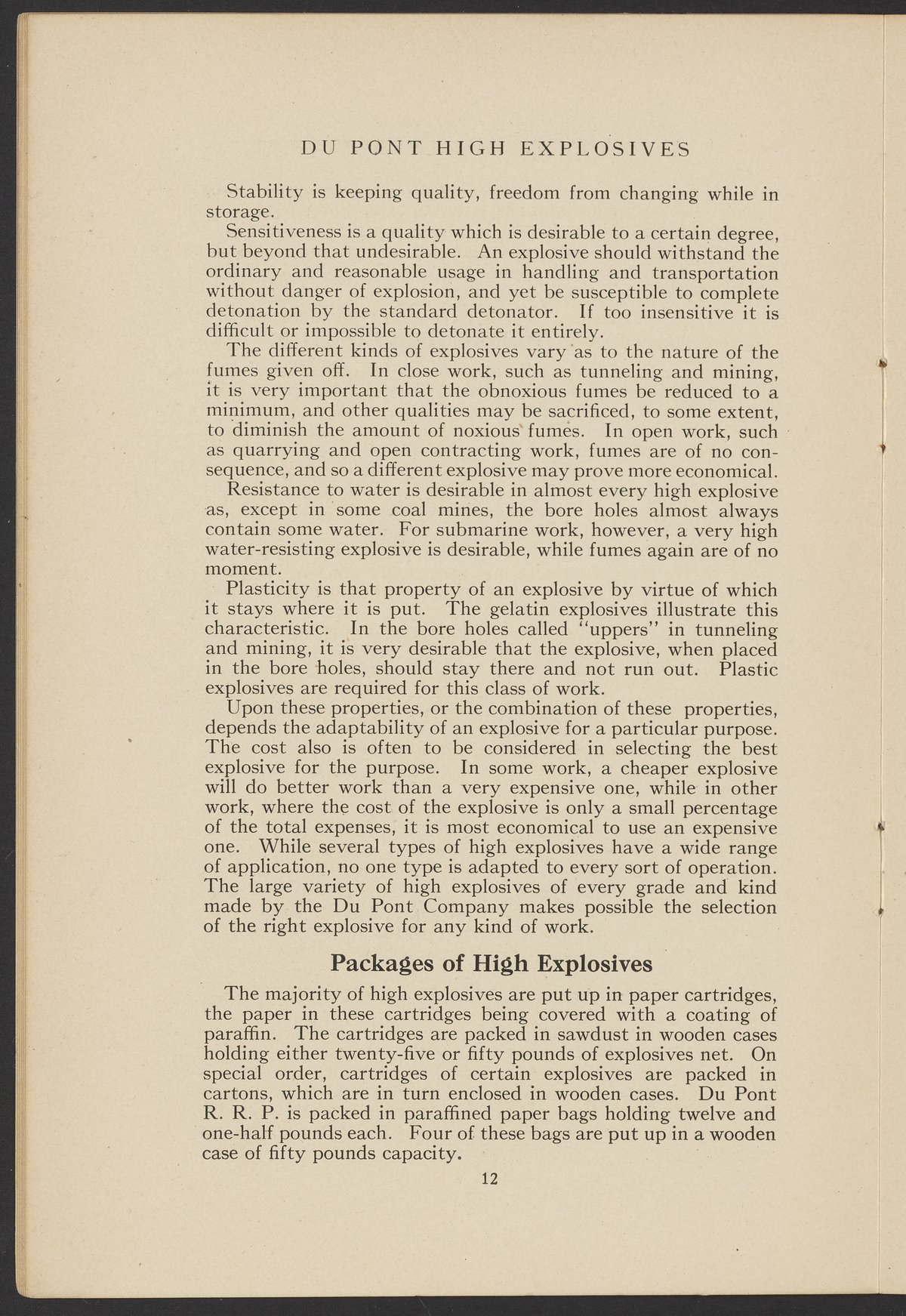 Small JPG1200 x 1774px — 392 KBFull-sized JPG2508 x 3708px — 1.5 MBOriginal fileTIFF — 2508 x 3708px — 26.7 MBCatalog advertising explosives manufactured and produced by the E.I. du Pont de Nemours & Company. Includes two sections, dynamite grade markings and monobels, duobels, and carbonites. Each provides discussion on the important properties of each product and their intended usage. Includes black and white engravings. Work is digitized in its entirety.