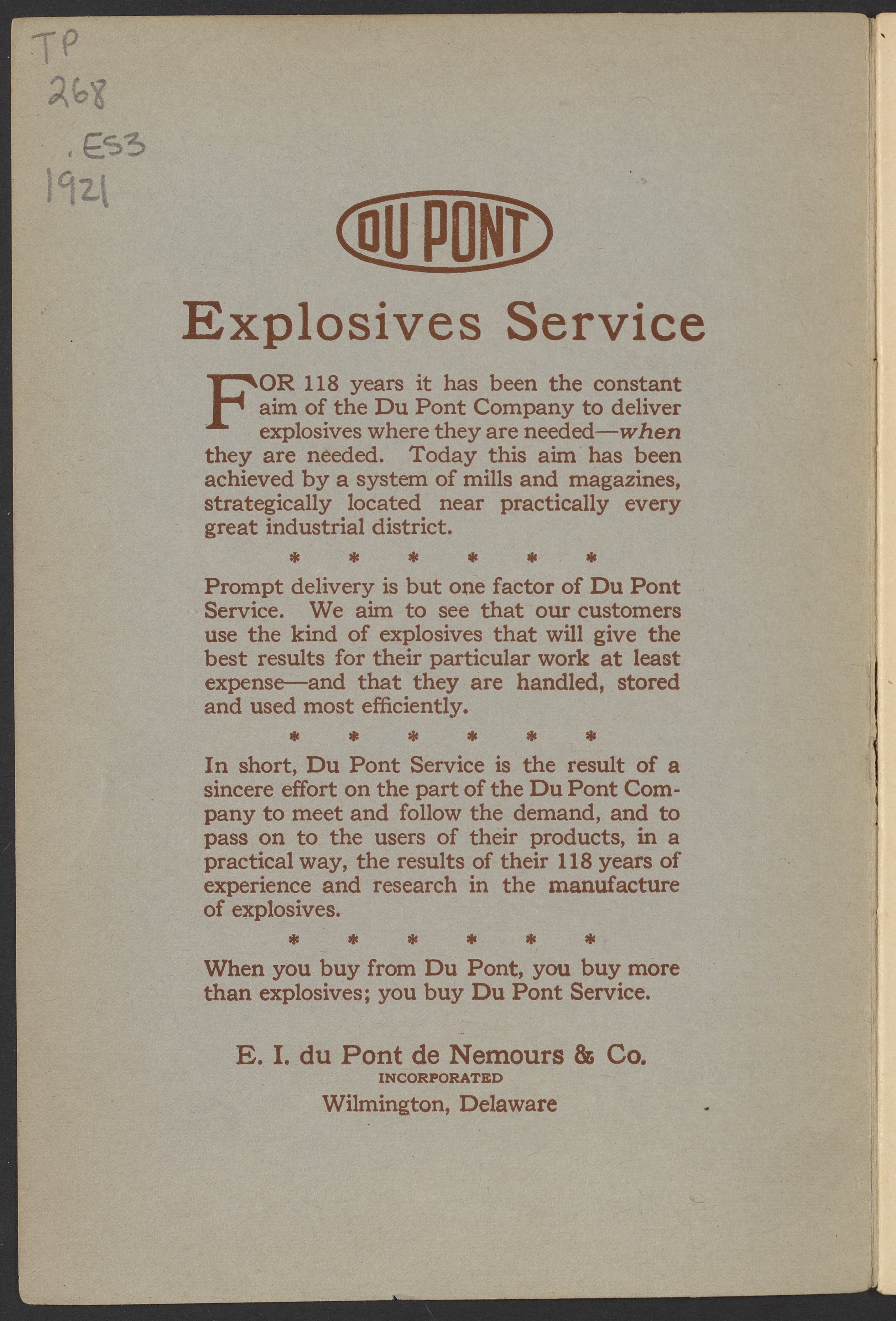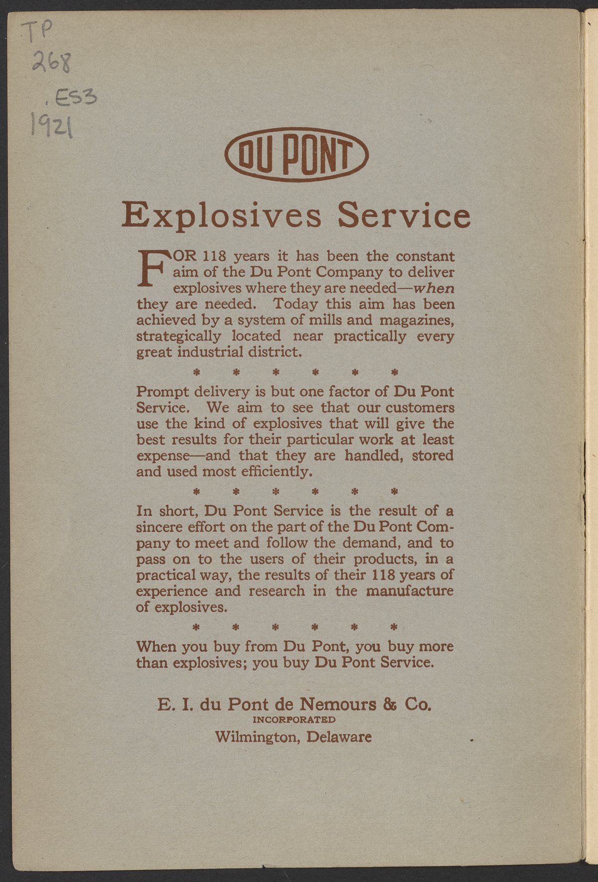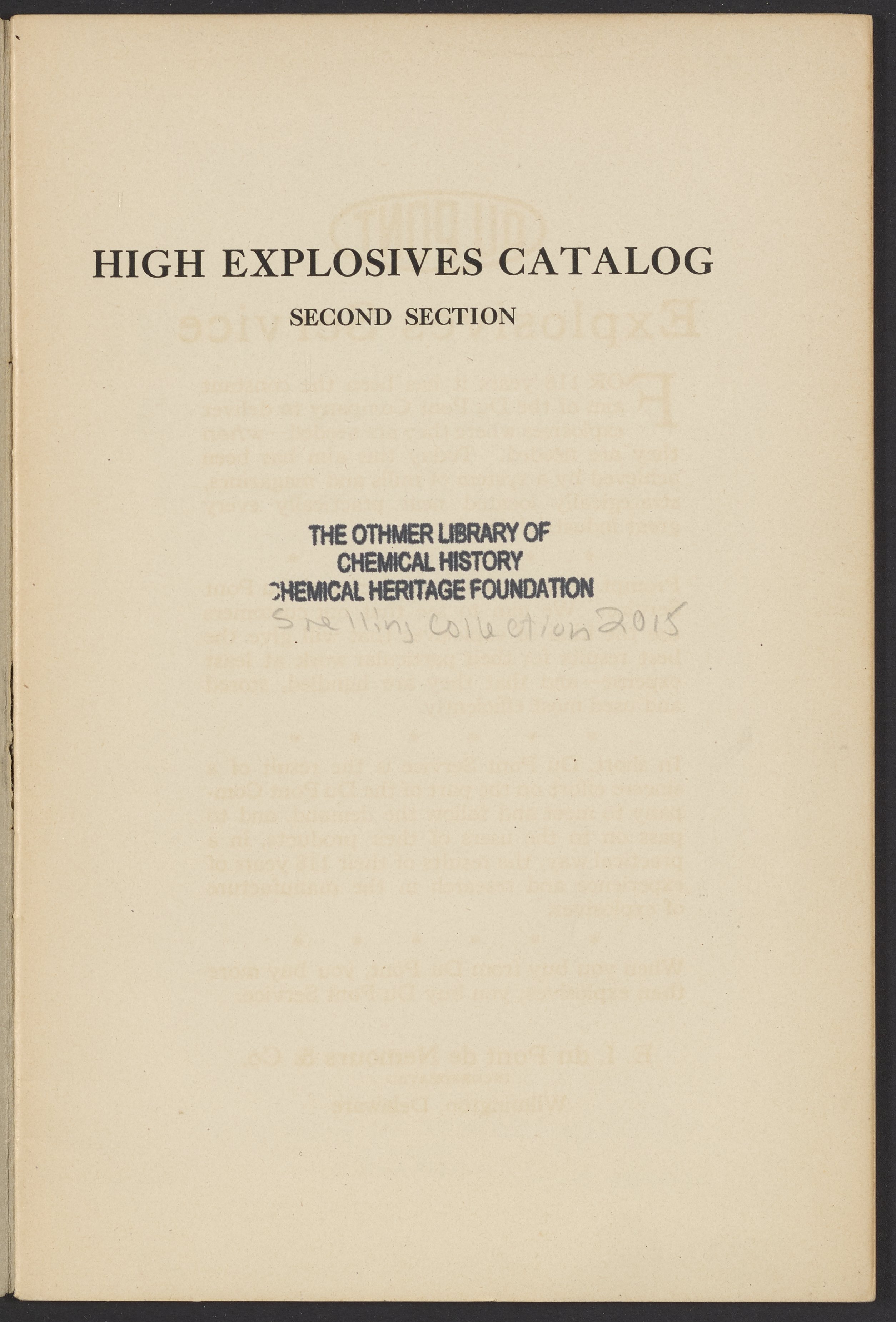 E.I. du Pont de Nemours & Company. “High Explosives, Kinds, Grades and Brands, Important Properties of Each Kind and Class of Work to Which Each Is Particularly Adapted.” Wilmington, Delaware: E.I. du Pont de Nemours & Company, 1921. TP268 .E53 1921. Science History Institute. Philadelphia. https://digital.sciencehistory.org/works/l961ifd.