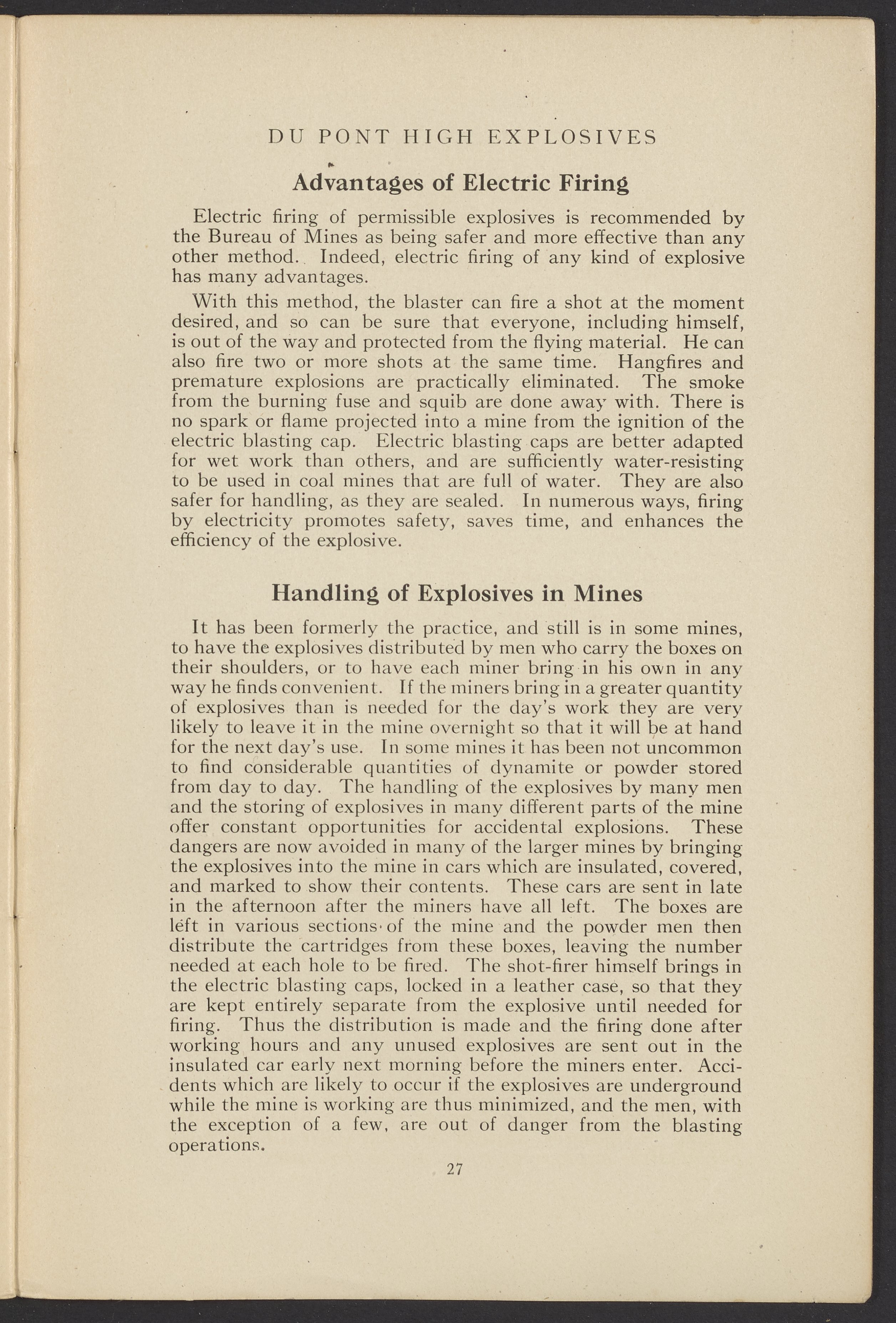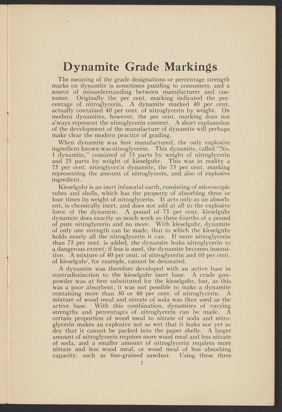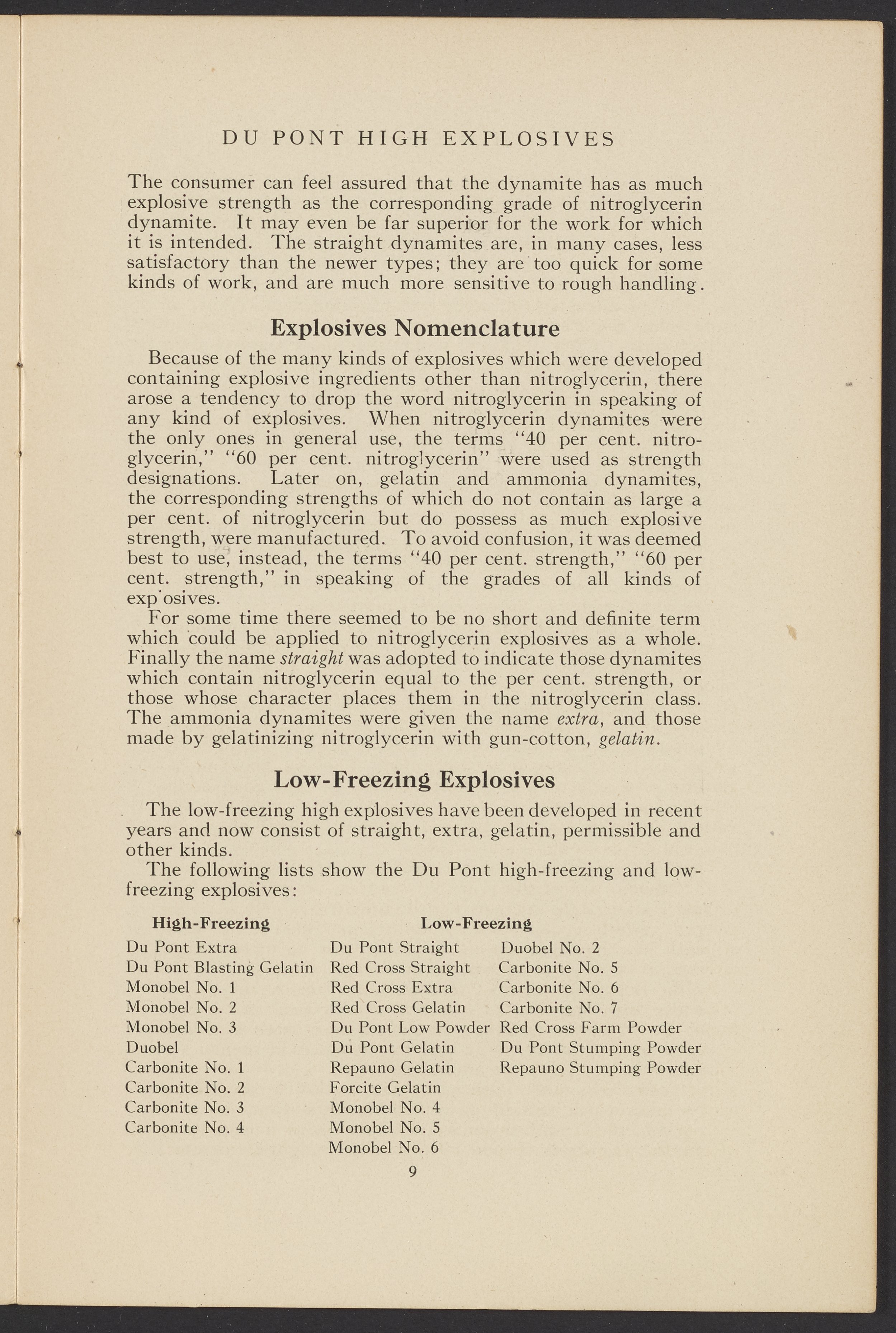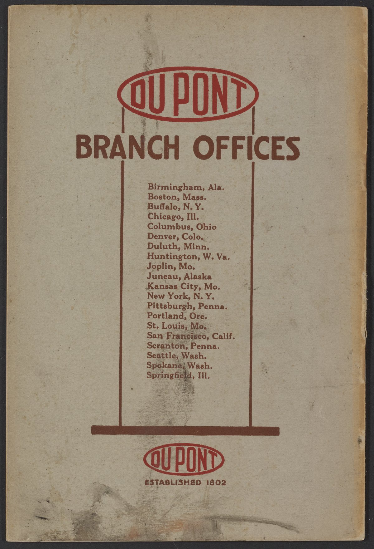 E.I. du Pont de Nemours & Company. “High Explosives, Kinds, Grades and Brands, Important Properties of Each Kind and Class of Work to Which Each Is Particularly Adapted.” Wilmington, Delaware: E.I. du Pont de Nemours & Company, 1921. TP268 .E53 1921. Science History Institute. Philadelphia. https://digital.sciencehistory.org/works/l961ifd.