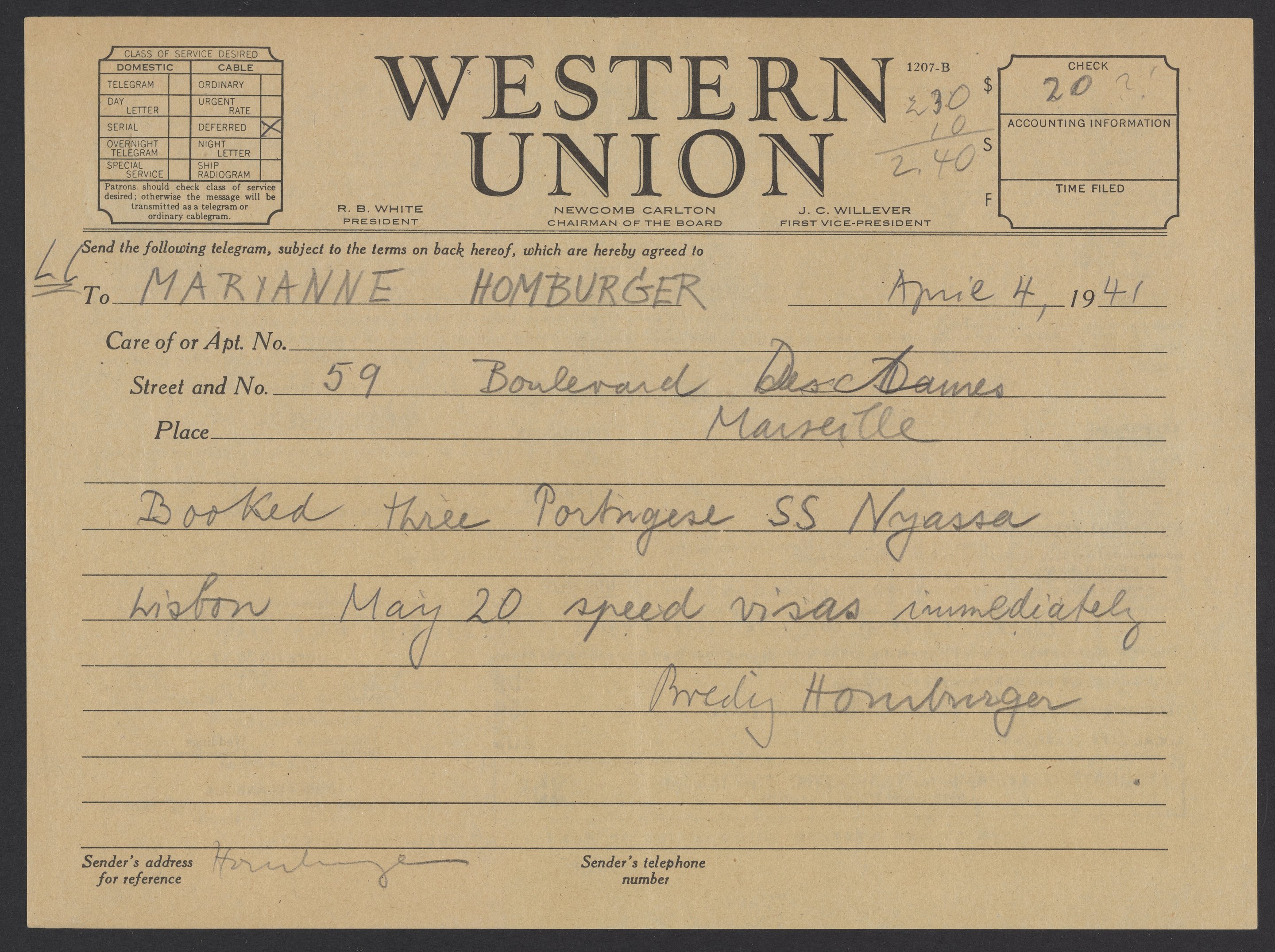 Telegram from Max Bredig to Marianne Homburger, April 4, 1941