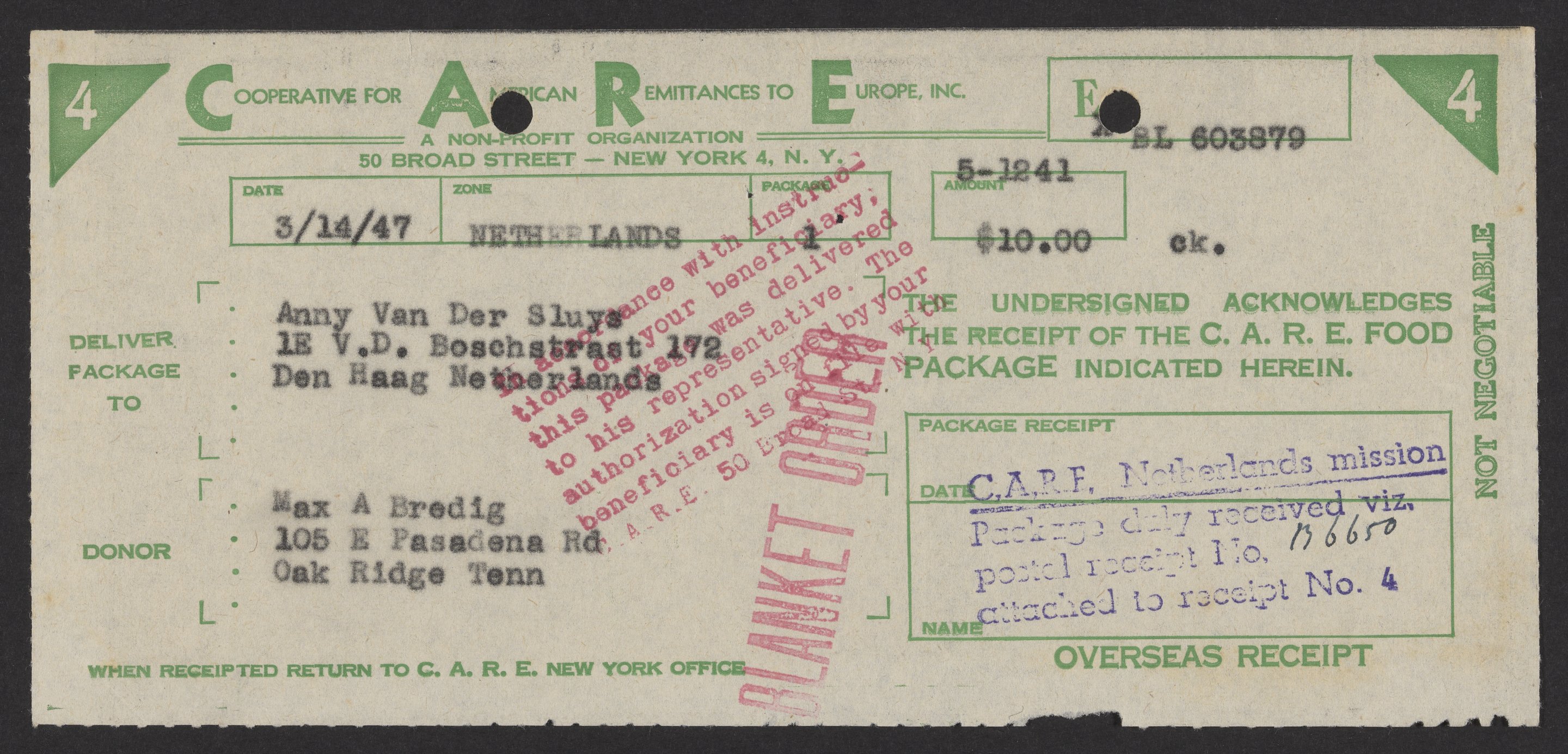 Small JPG1200 x 577px — 137 KBLarge JPG2880 x 1385px — 742 KBFull-sized JPG4934 x 2373px — 2.0 MBOriginal fileTIFF — 4934 x 2373px — 33.5 MBReceipts for the delivery of a food package from Cooperative American Remittances to Europe (CARE), from Max Albert Bredig (1902-1977). Receipts mention his friends Anny van der Sluys and Hans Calmeier. CARE, founded in 1945, is now known as Cooperative for Assistance and Relief Everywhere.