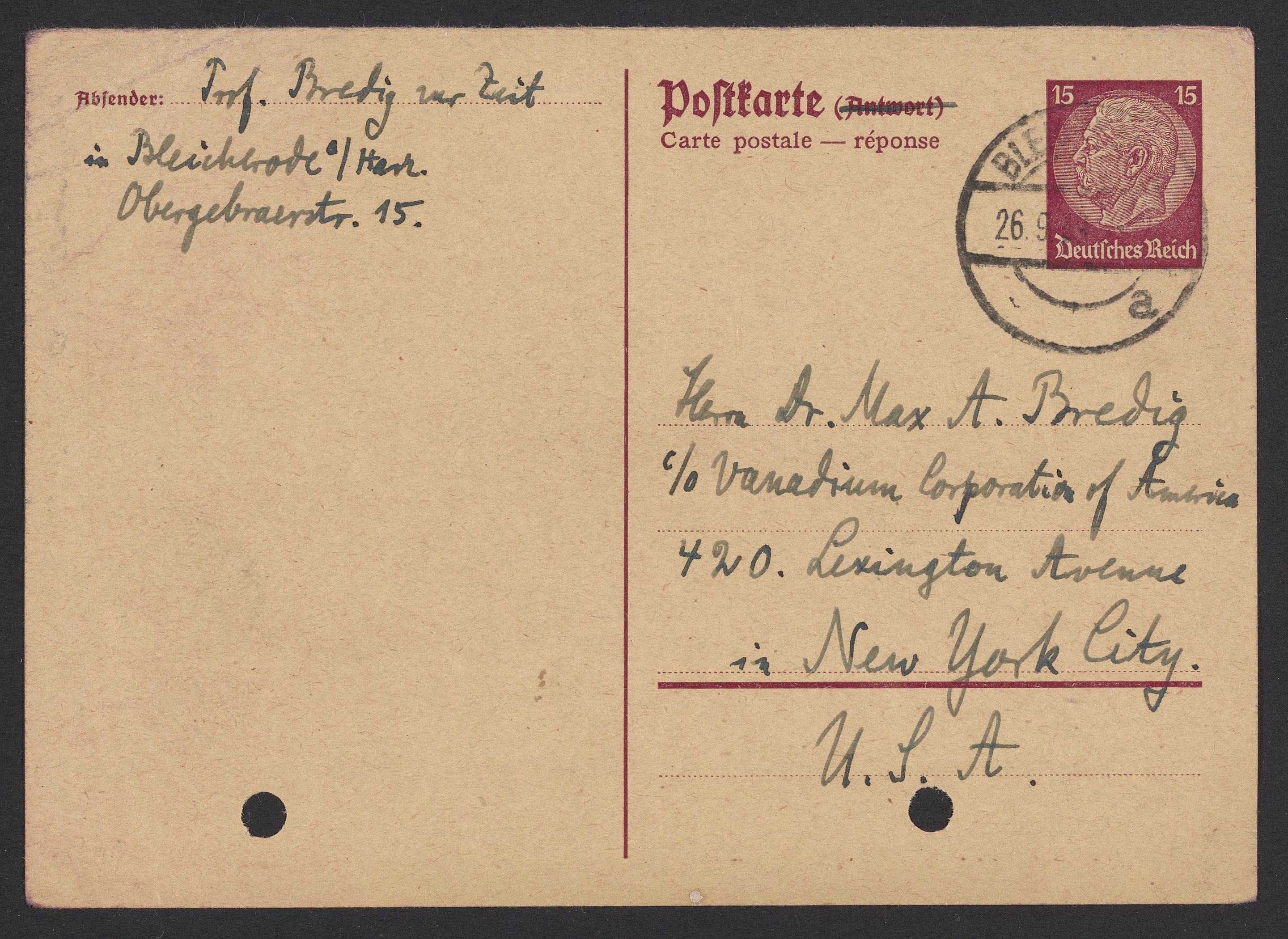 Bredig, Georg. “Postcard from Georg Bredig to Max Bredig, September 26, 1939,” September 26, 1939. Papers of Georg and Max Bredig, Box 7, Folder 15. Science History Institute. Philadelphia. https://digital.sciencehistory.org/works/liu5yr9.
