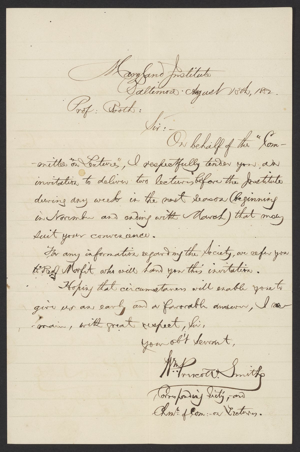 Small JPG1200 x 1805px — 317 KBFull-sized JPG2193 x 3298px — 919 KBOriginal fileTIFF — 2193 x 3298px — 20.7 MBJames Curtis Booth (1810-1888) is invited to deliver two lectures at the Maryland Institute.