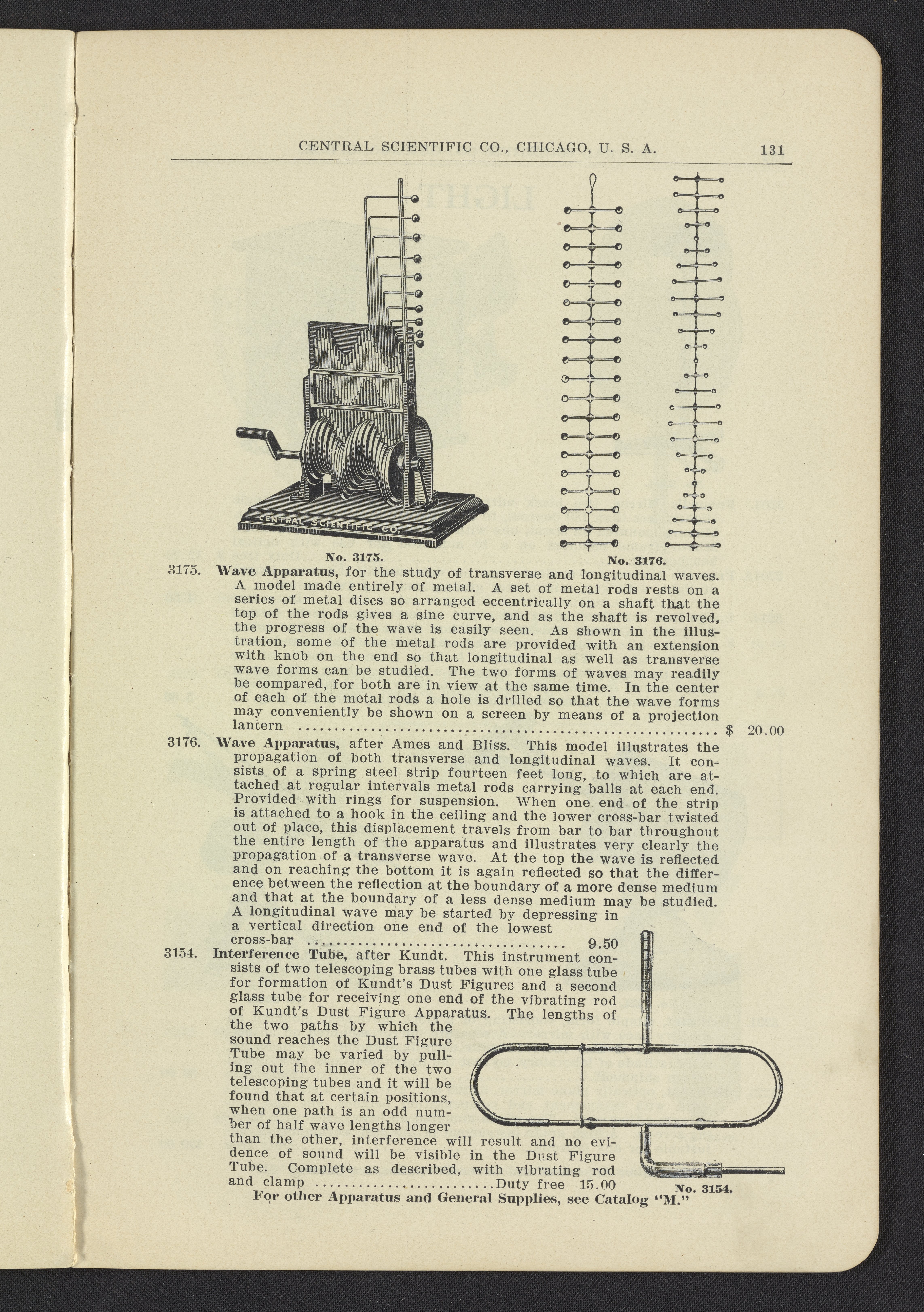 Central Scientific Company. “Wave Apparatus.” Physical Apparatus for Universities and Colleges Manufactured and Imported by Central Scientific Co. Chicago, Illinois: Central Scientific Company, 1912. Q185.7 .C46 1912. Science History Institute. Philadelphia. https://digital.sciencehistory.org/works/lkoyc84.