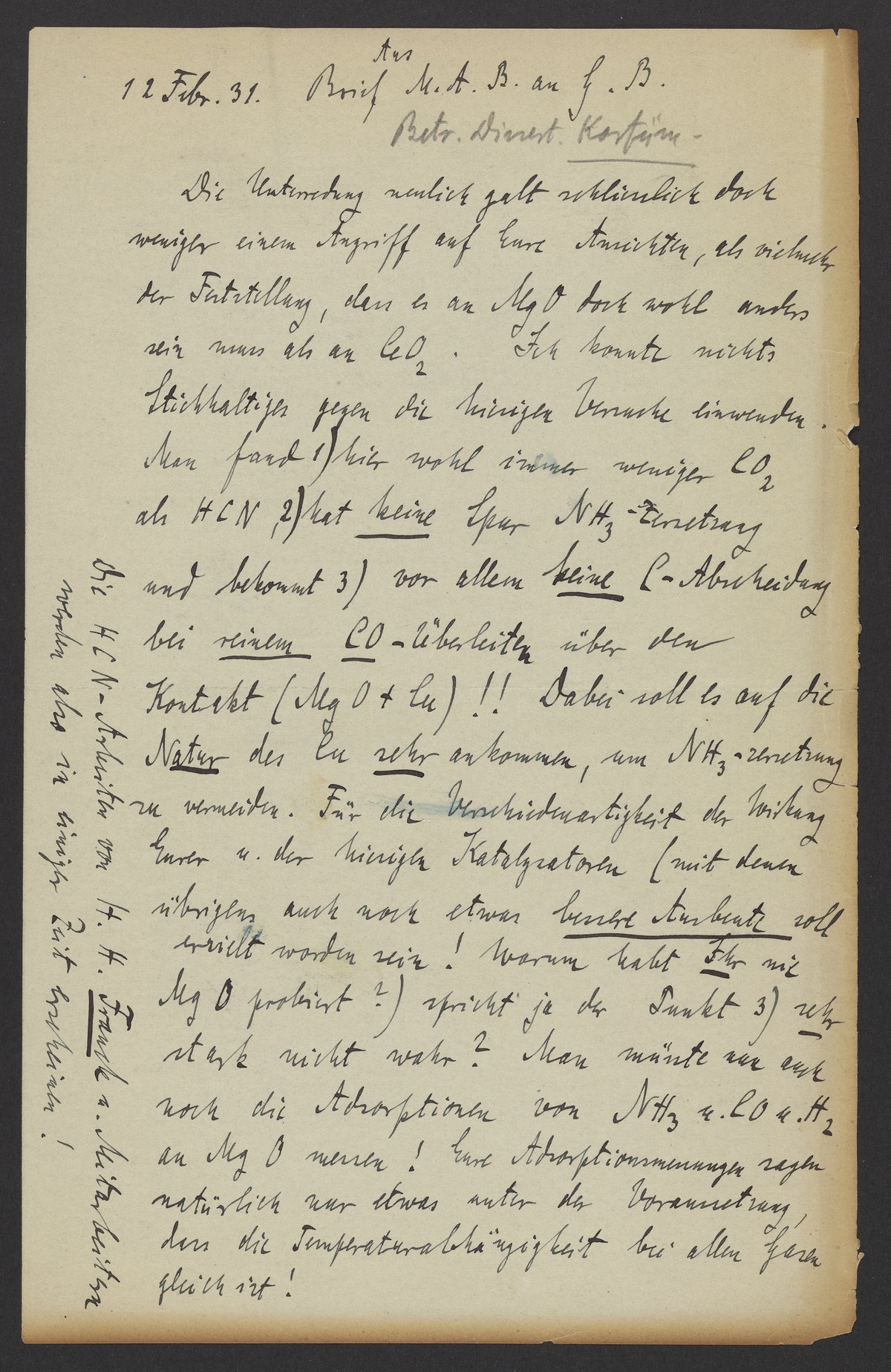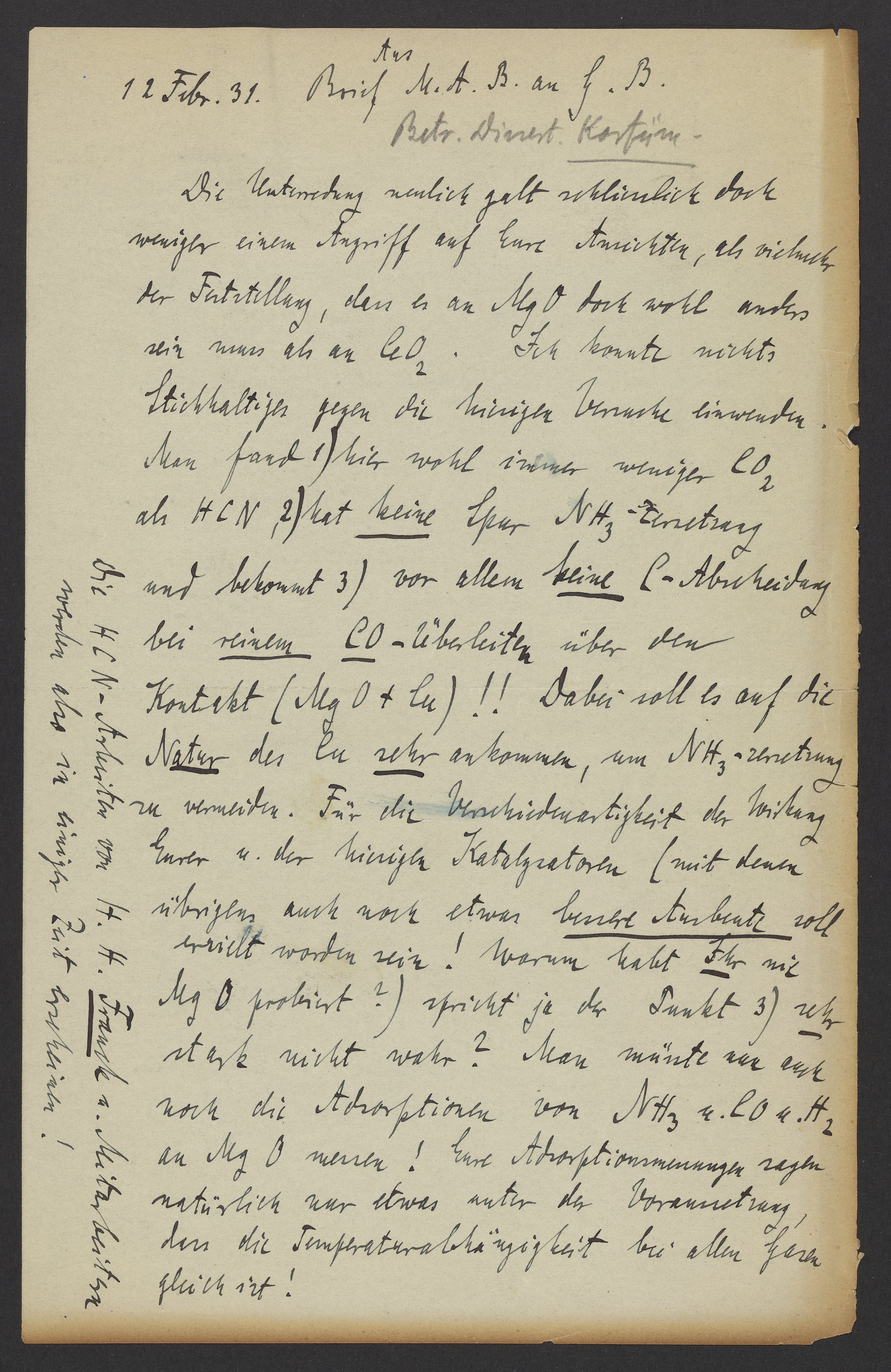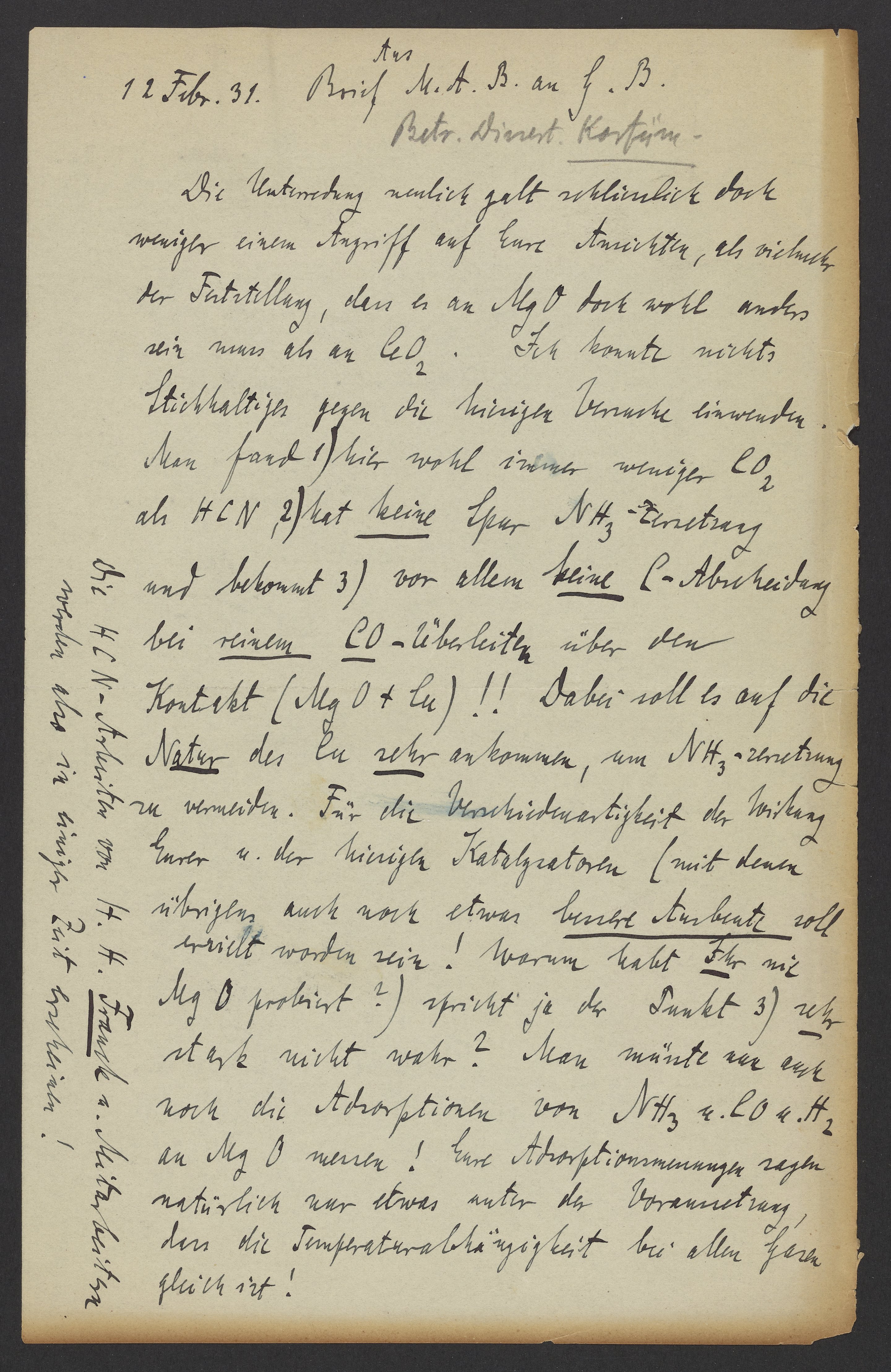 Die Unterredung neulich galt schliesslich davon weniger einem Angriff auf Eure Ansichten, als vielmehr der Feststellung, dass es an MgO doch wohl andere sein muss als an CeO2. Ich konnte nichts Stichhaltiges gegen die hiesigen Versuche einwenden. Man fand 1) hier wohl immer weniger CO2 als HON, 2) hat keine Spur NH3-Zersetzung und bekommt 3) vor allem keine C-Abscheidung bei reinem CO-Überleiten über den Kontakt (MgO + Cu)!! Dabei soll es auf die Natur des Cu sehr ankommen, um NH3-Zersetzung zu vermeiden. Für die Verschiedenartigkeit der Wirkung Eurer und der hiesigen Katalysatoren (mit denen übrigens auch noch etwas besser Ausbeute soll erzielt worden sein! Warum habt ihr nie MgO probiert?) spricht ja der Punkt 3) sehr stark nicht wahr? Man müsste nun auch noch die Adsorptionen von NH3 und Co u. H2 and MgO messen! Eure Adsorptionsmessungen sagen natürlich nur etwas unter der Voraussetzung, dass die Temperaturabhängigkeit bei allen Gasen gleich ist! Die HON-Arbeiten von H.H. Franck und Mitarbeitern werden also in einiger Zeit erscheinen.