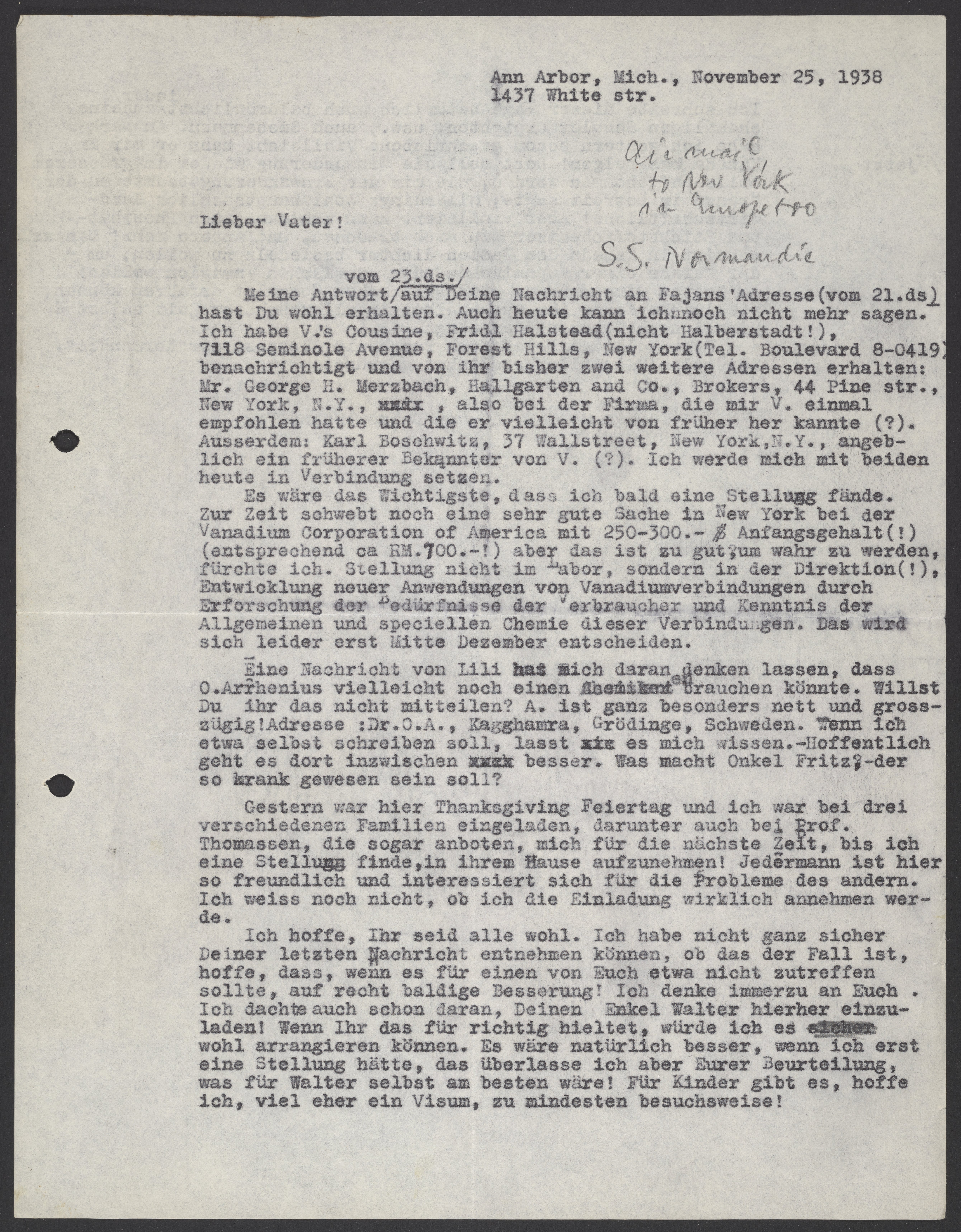 Es wäre das Wichtigste, dass ich bald eine Stellung fände. Zur Zeit schwebt noch eine sehr gute Sache in New York bei der Vanadium Corporation of America mit 250-300.- $ Anfangsgehalt (!) (entsprechend ca RM. 700. -!) aber das ist zu gut, um wahr zu werden, fürchte ich. Stellung nicht im Labor, sondern in der Direktion (!), Entwicklung neuer Anwendungen von Vanadiumverbindungen durch Erforschung der Bedürfnisse der Verbraucher und Kenntnis der Allgemeinen und speciellen Chemie dieser Verbindungen. Das wird sich leider erst Mitte Dezember entscheiden.