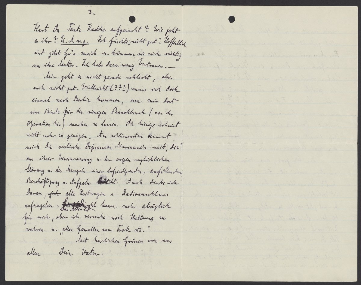 Hast Du Tante Kaethe aufgesucht? Wie geht es ihr? U.A.w.g Ich fürchte: „nicht gut.“ Hoffentlich sind Ge’s jetzt zurück u. kümmern sich richtig um ihre Mutter. Ich habe dazu wenig Vertrauen.