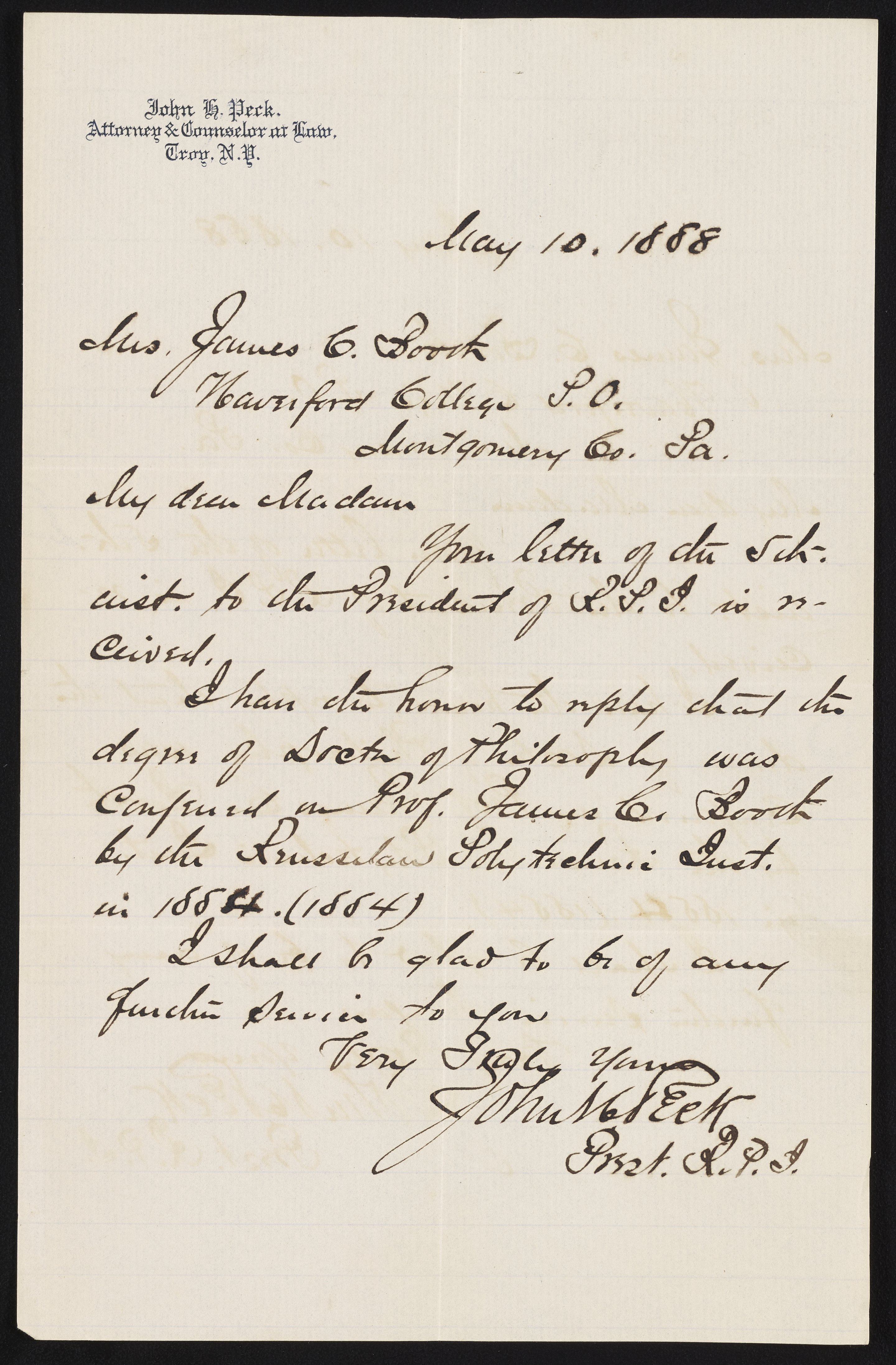 John H. Peck writes to Margaret M. Booth née Cardeza to inform her of the date of receipt of an honorary Doctor of Philosophy degree from Rensselaer Polytechnic Institute by her late husband, James Curtis Booth (1810-1888).