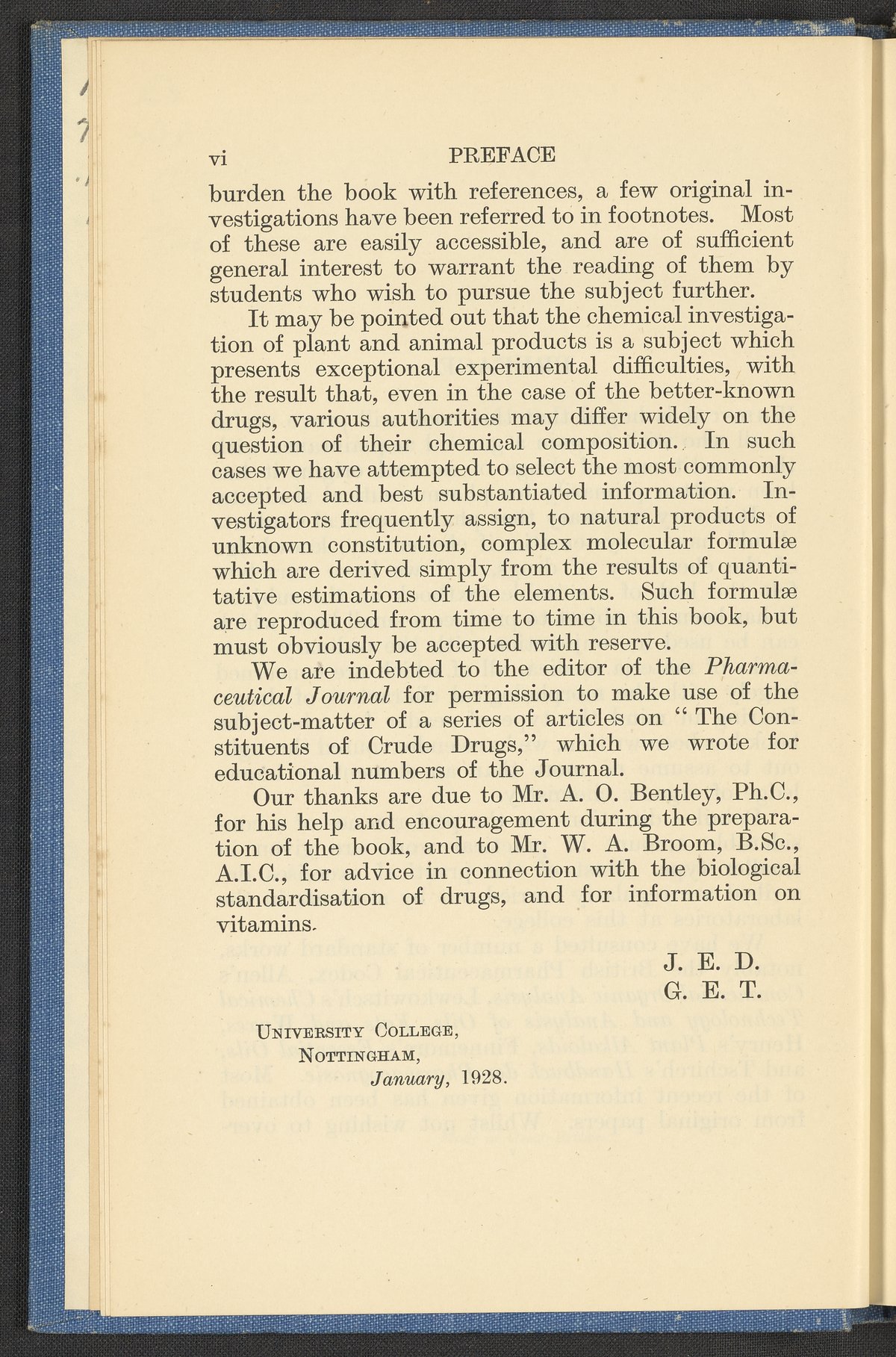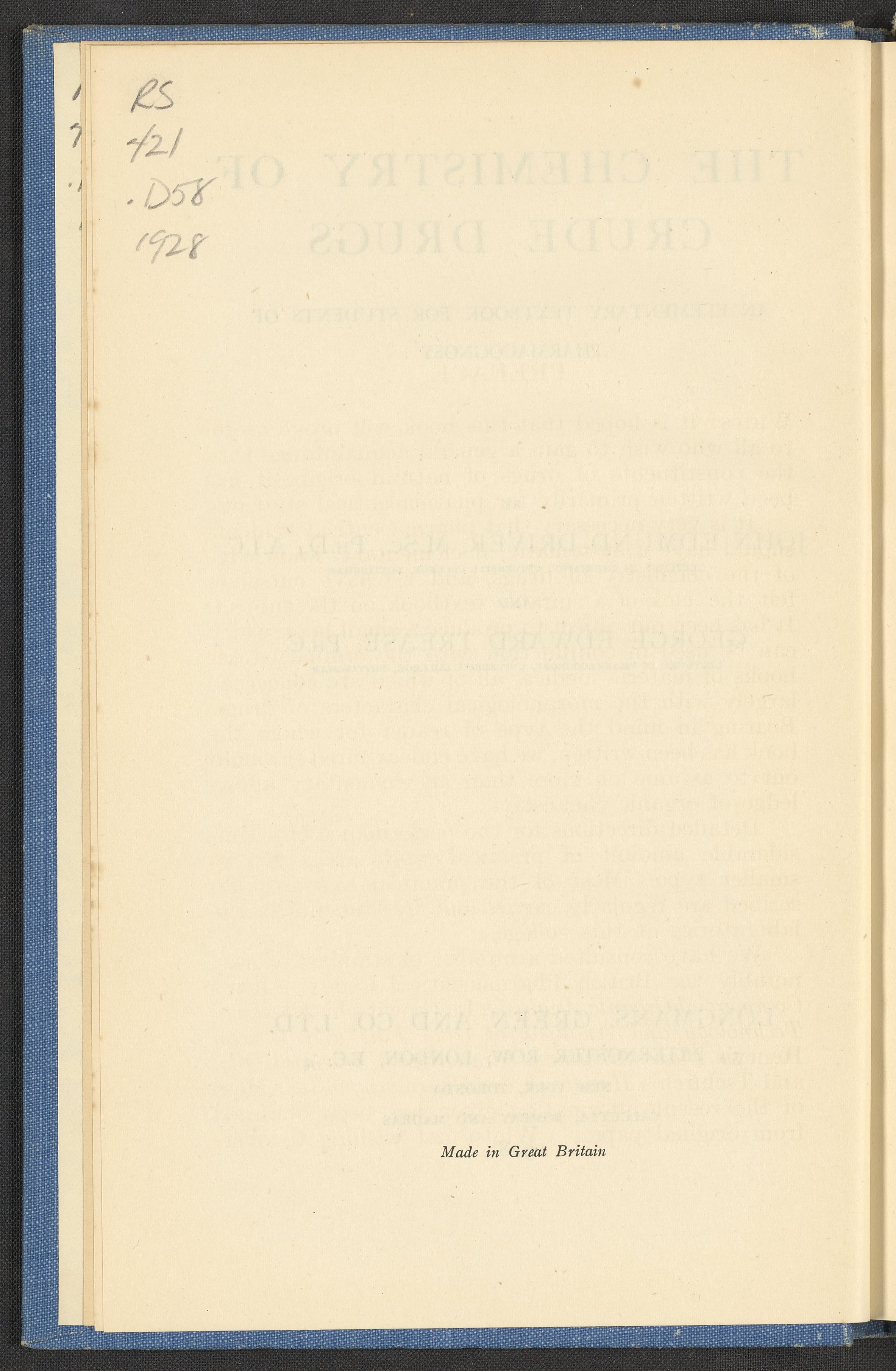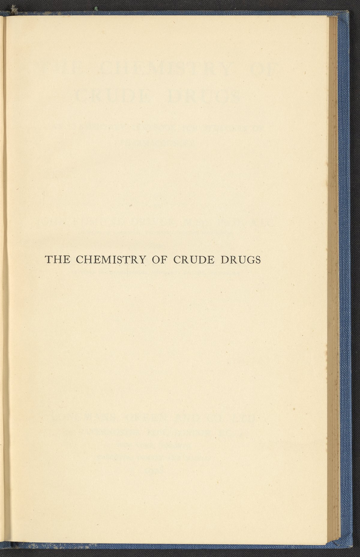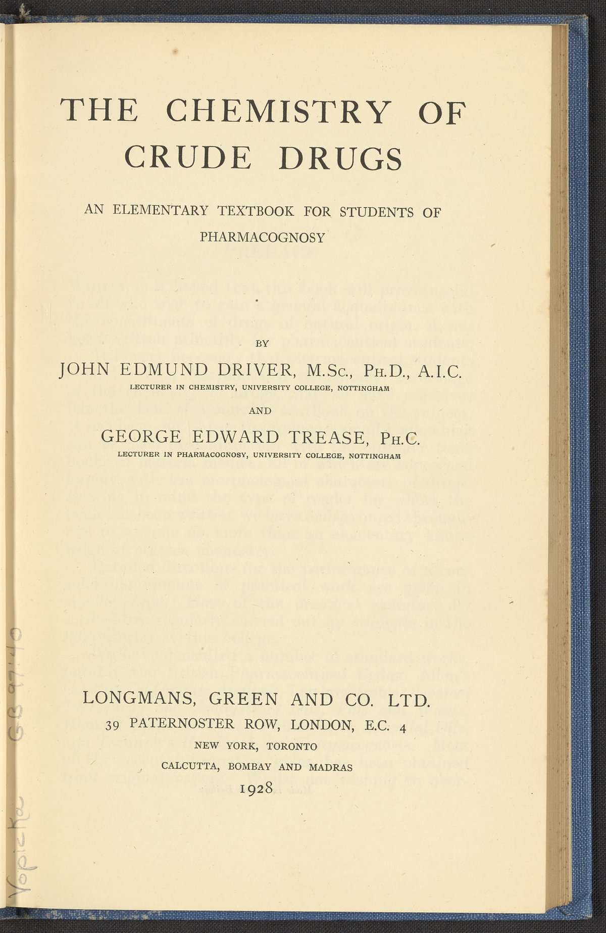 Driver, John Edmund. “The Chemistry of Crude Drugs : An Elementary Textbook for Students of Pharmacognosy.” London, England: Longmans, Green, and Co., 1928. RS421 .D58 1928. Science History Institute. Philadelphia. https://digital.sciencehistory.org/works/lt1i6eu.
