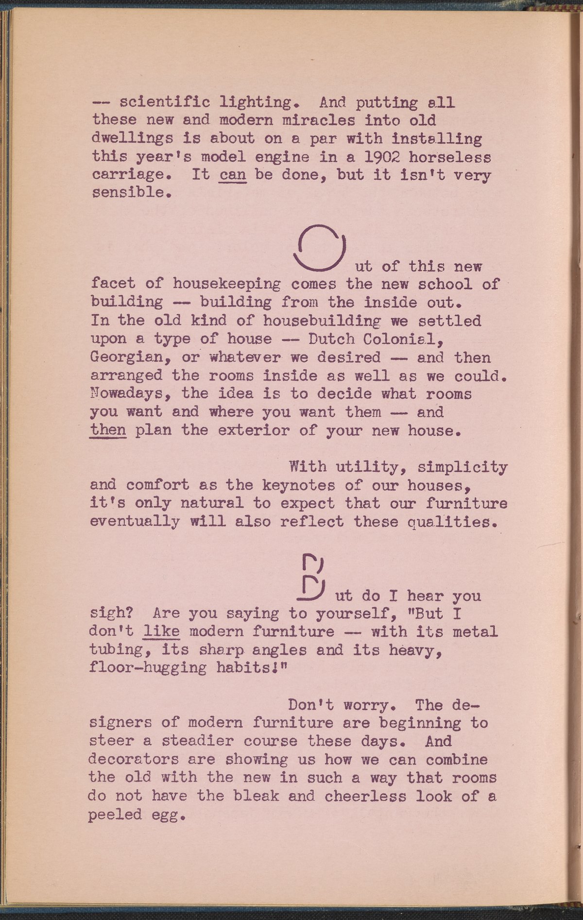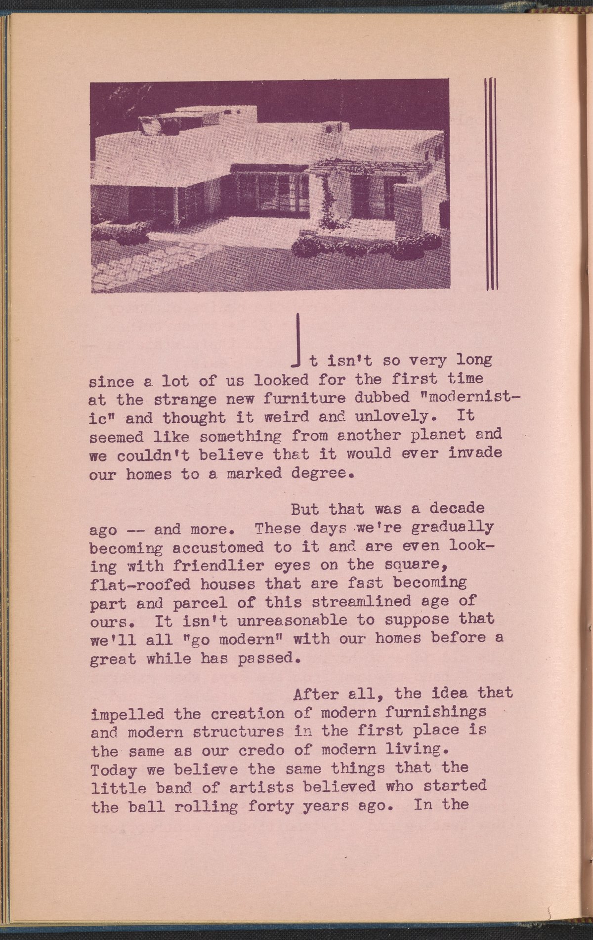 Booklet corresponding to a radio broadcast program created by the National Paint, Varnish, and Lacquer Association. The booklet discusses the styles and amenities that modern houses are afforded, "with utility, simplicity, and comfort as the keynotes." Continues to describe color schemes for modern homes and decoration trends in the modern style. Includes two monotone photographs and decorated covers.