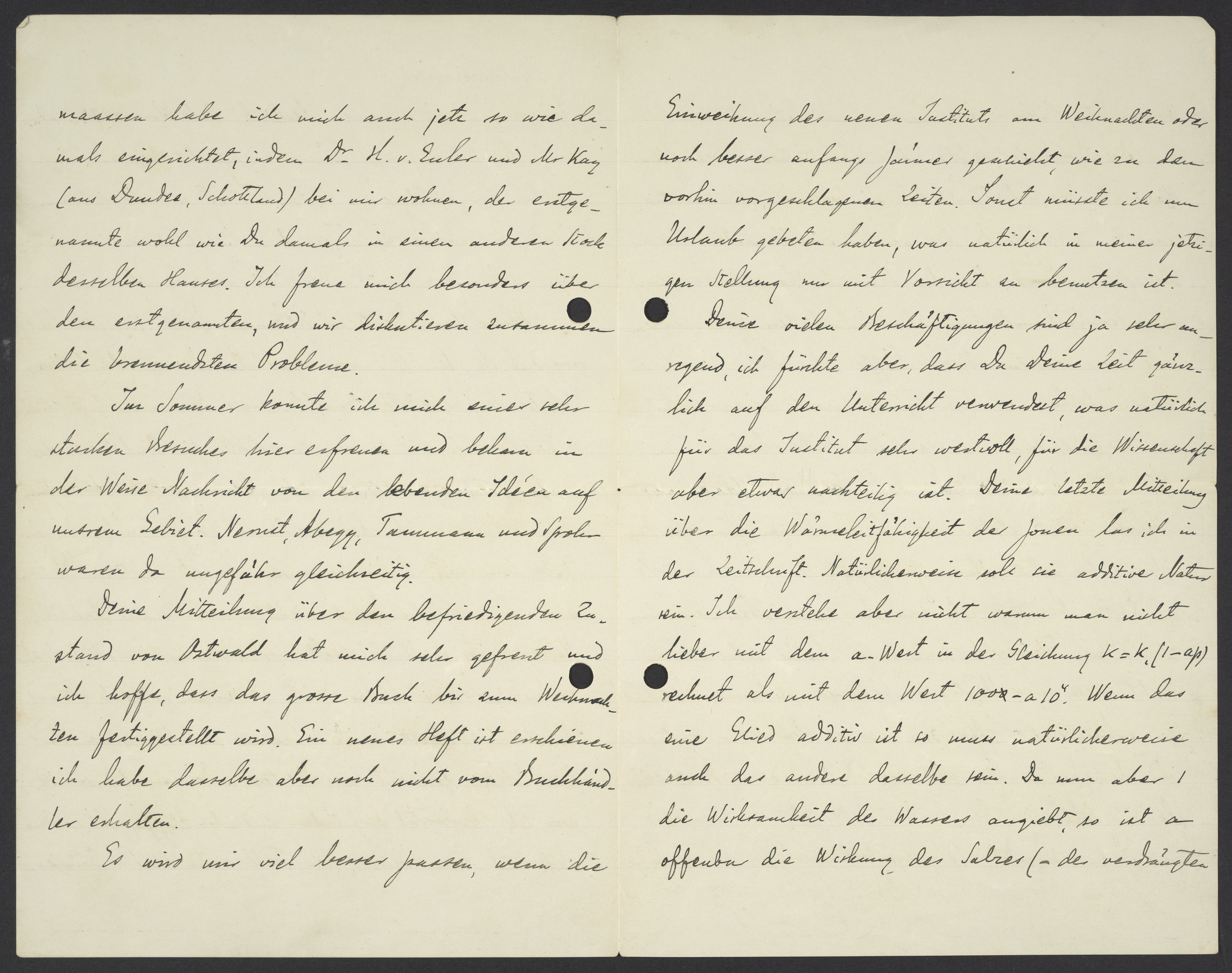 To a certain extent, I have set myself up like I did back then. Dr. H. v. Euler and Mr. Kay (from Dundee, Scotland) are living with me, and the first-mentioned gentleman lives on another floor of the same house, just as you once did. I am glad to be in his company and we discuss the most fundamental questions of the day.