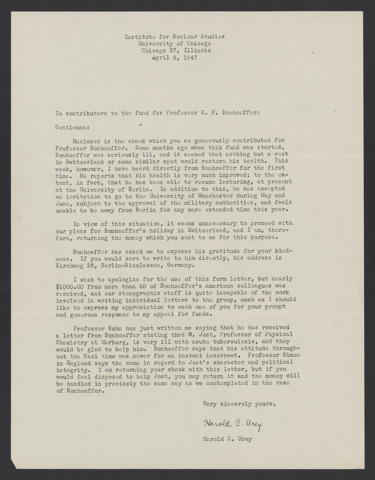 Harold C. Urey (1893-1981) thanks all who contributed to the medical fund of Karl-Friedrich Bonhoeffer (1899-1957). Urey describes Bonhoeffer's much-improved health status and his current affairs.