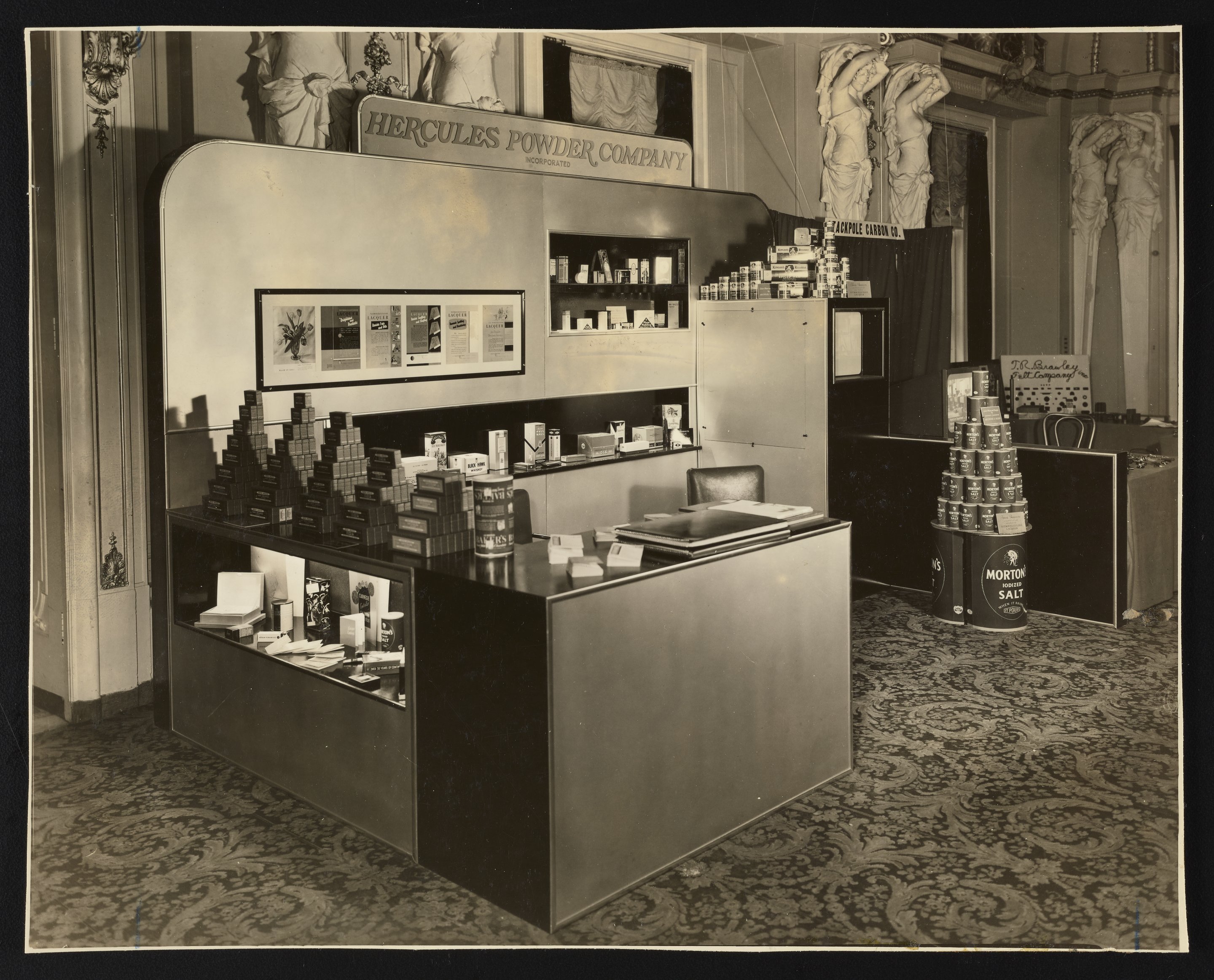 General view of a Hercules Powder Company display advertising modern packaging techniques at an unidentified 1936 trade show.